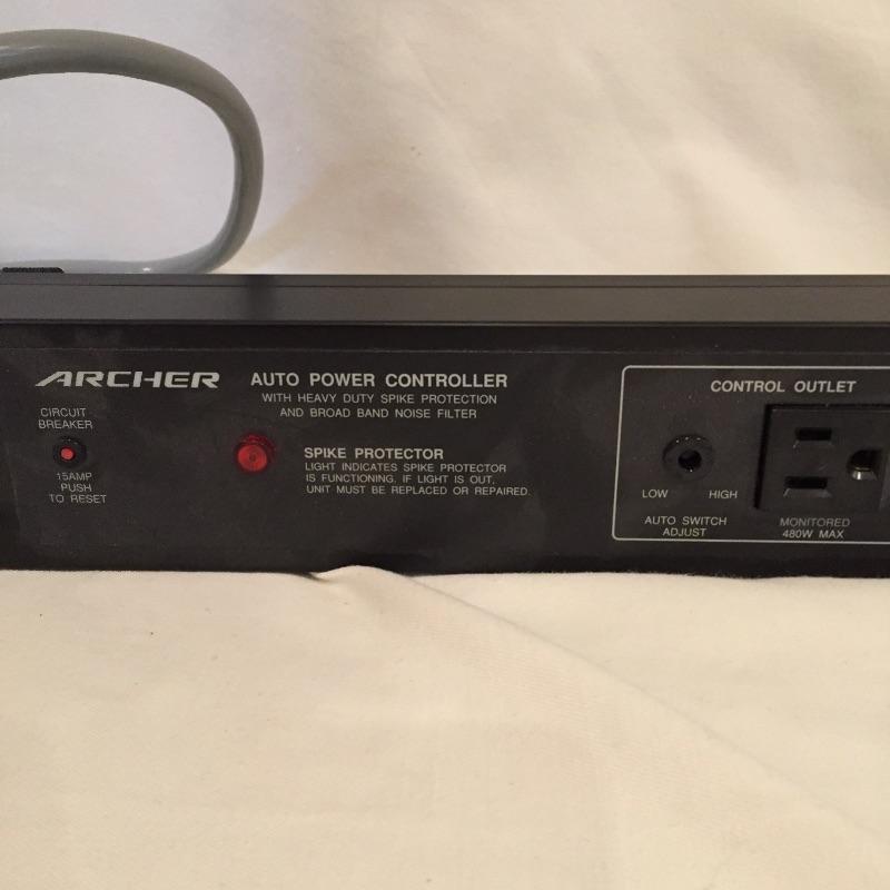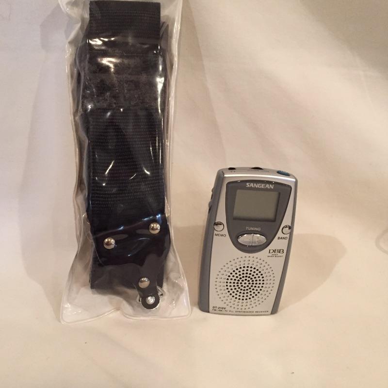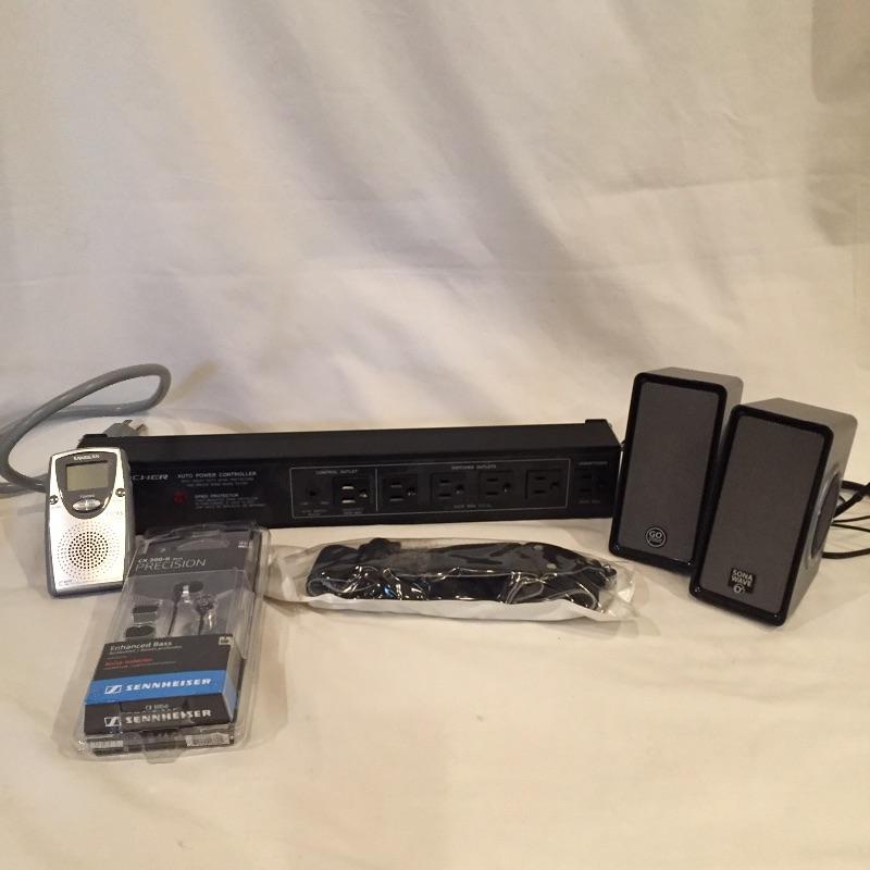 This miscellaneous music collection includes an Archer 6 plug surge protector, a pair of SonaWAVE speakers, Sennheiser ear-canal headphones that are still in box, Sangean Pocket Radio that takes AAA batteries (cannot verify working condition) and a miscellaneous strap.