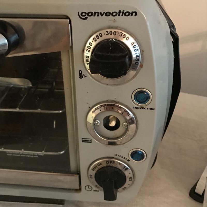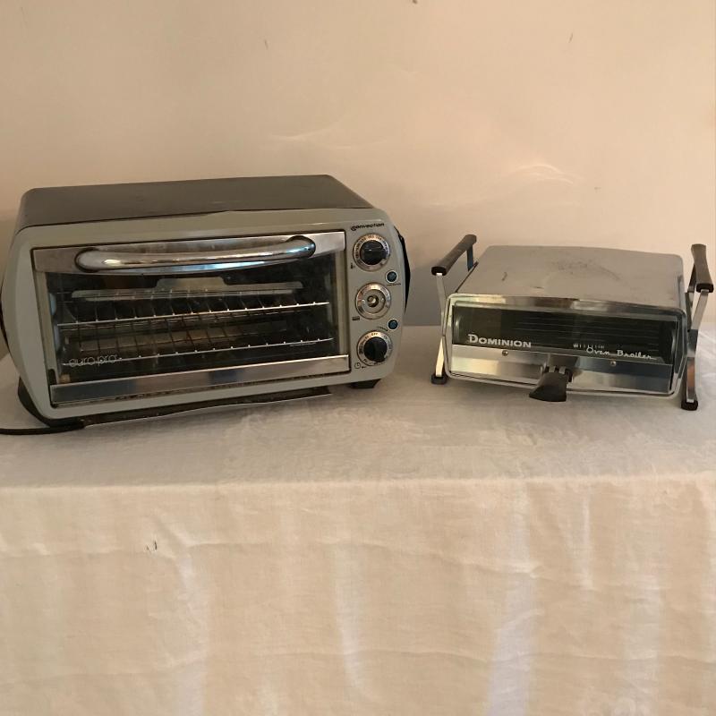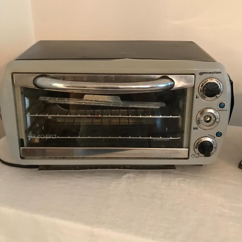 Lot includes tabletop convection oven by Euro Pro (approx. 18” x 15” x 10”) and Dominion tabletop oven broiler. Convection oven is missing one knob and dented on sides but appears to work fine. Broiler is approx. 13” x 11” x 6” and also seems to work fine. No shipping available. Local pickup only in Asheville, NC.