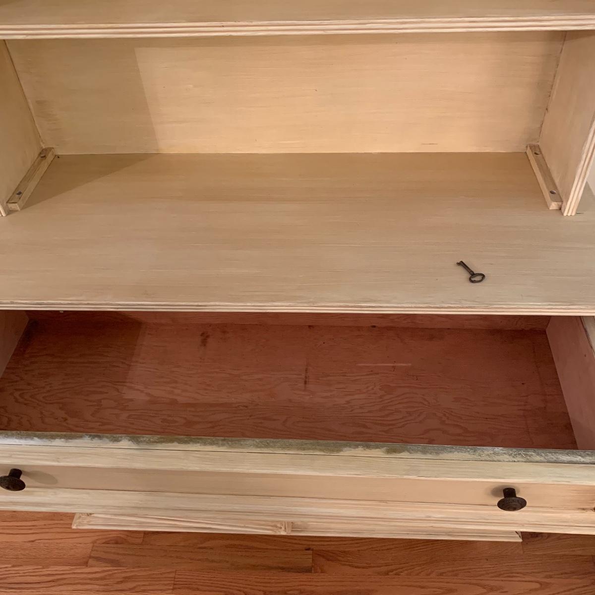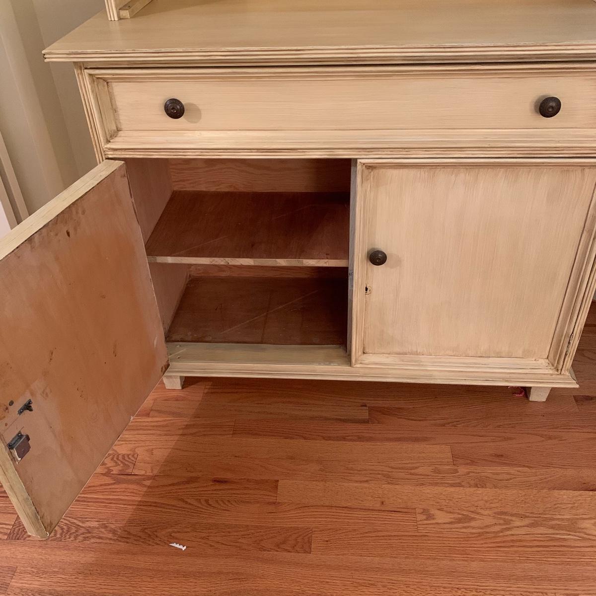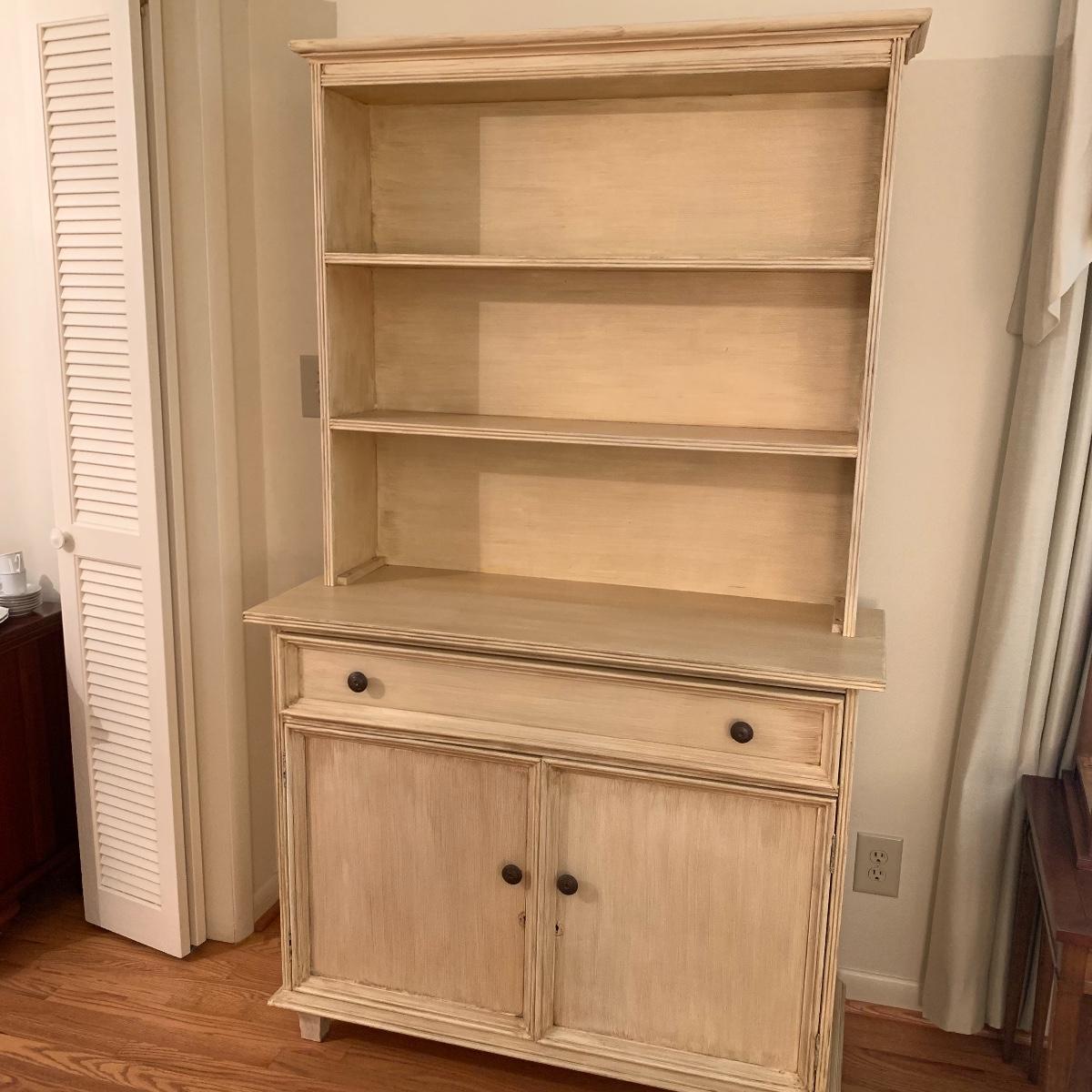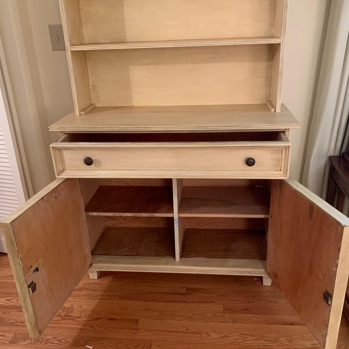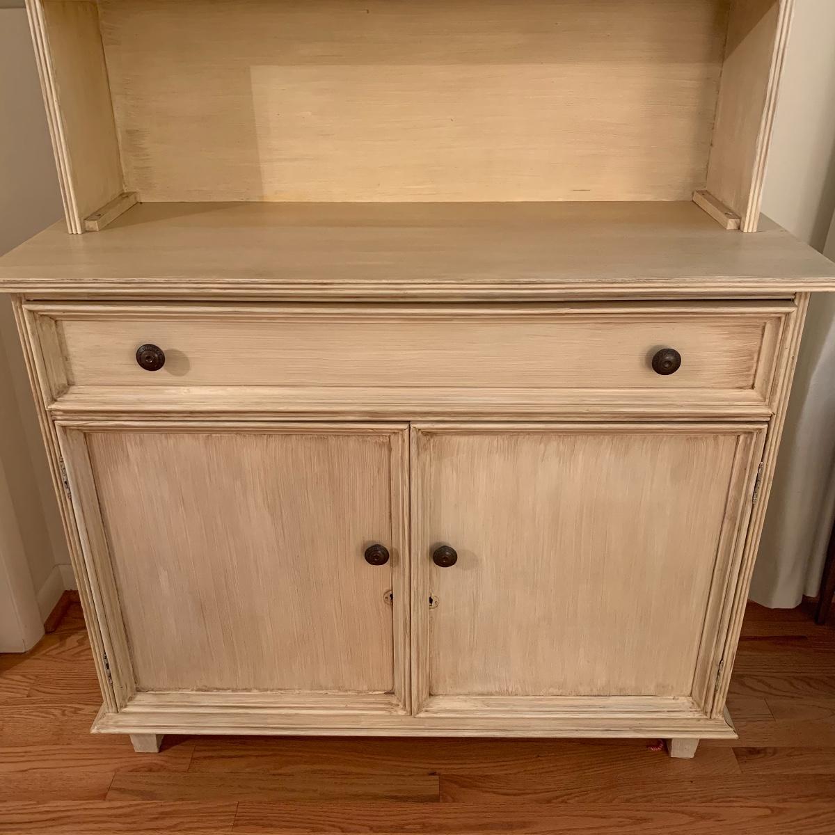 This lot includes one cream colored painted sideboard. The sideboard has two cabinets with shelving inside and a large drawer. It has a top with three shelves that was once detachable but was seemingly glued on, it no longer can be removed. It comes with one key for the cabinets that does not work and is for decorative purposes only. The drawer needs to be wiggled to open up. There are some glue drips on the back of the piece connecting the top and bottom (see photos). The piece measures 17in x 43in x 73in. Local pick up only.