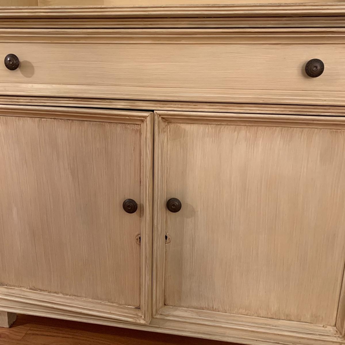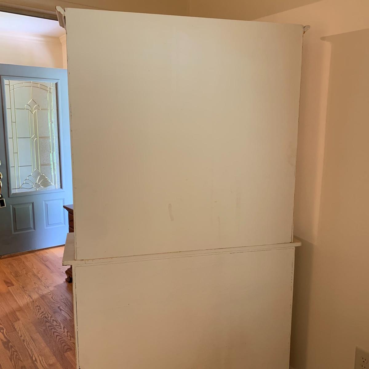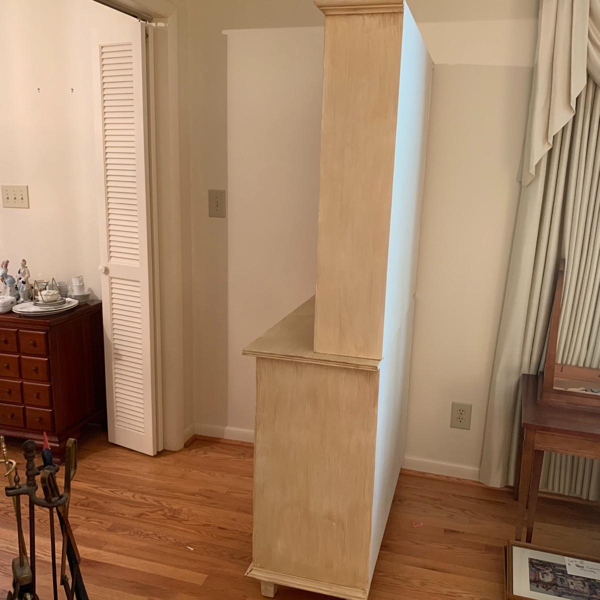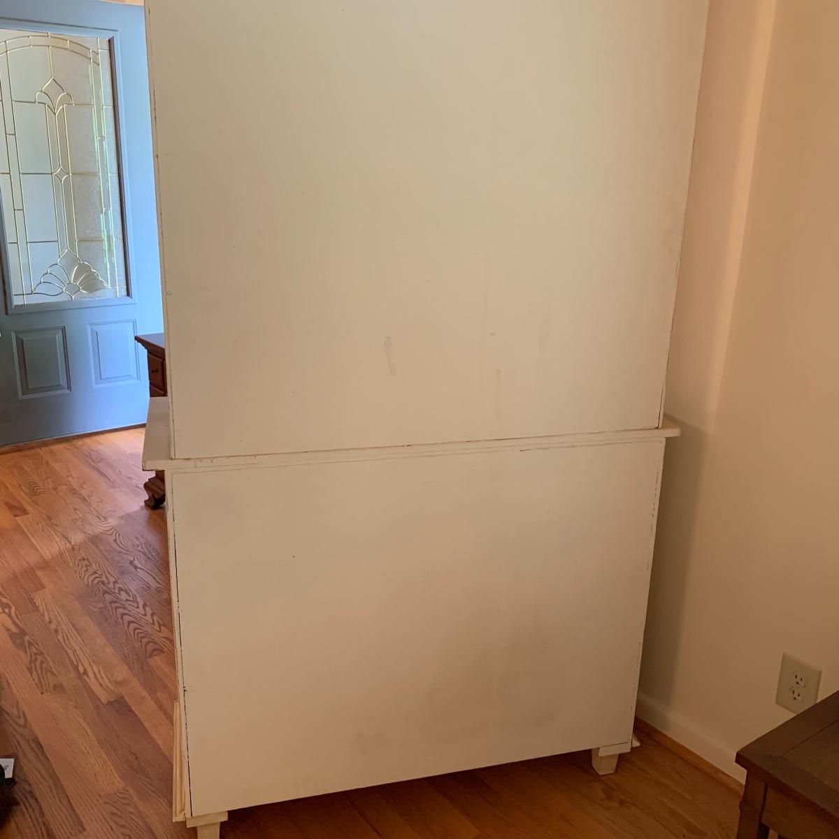 This lot includes one cream colored painted sideboard. The sideboard has two cabinets with shelving inside and a large drawer. It has a top with three shelves that was once detachable but was seemingly glued on, it no longer can be removed. It comes with one key for the cabinets that does not work and is for decorative purposes only. The drawer needs to be wiggled to open up. There are some glue drips on the back of the piece connecting the top and bottom (see photos). The piece measures 17in x 43in x 73in. Local pick up only.