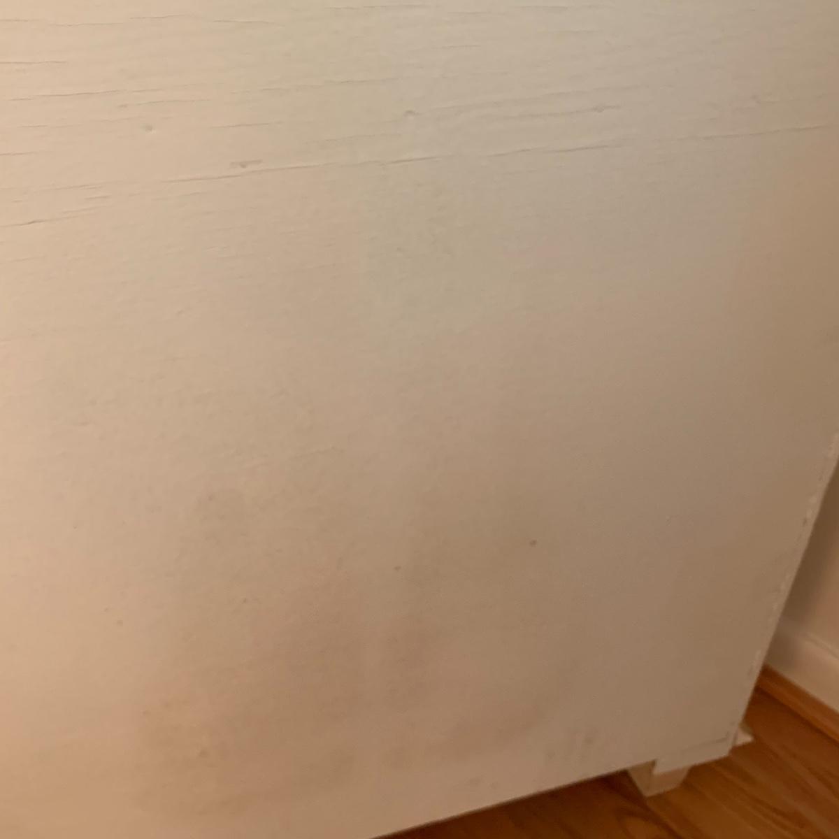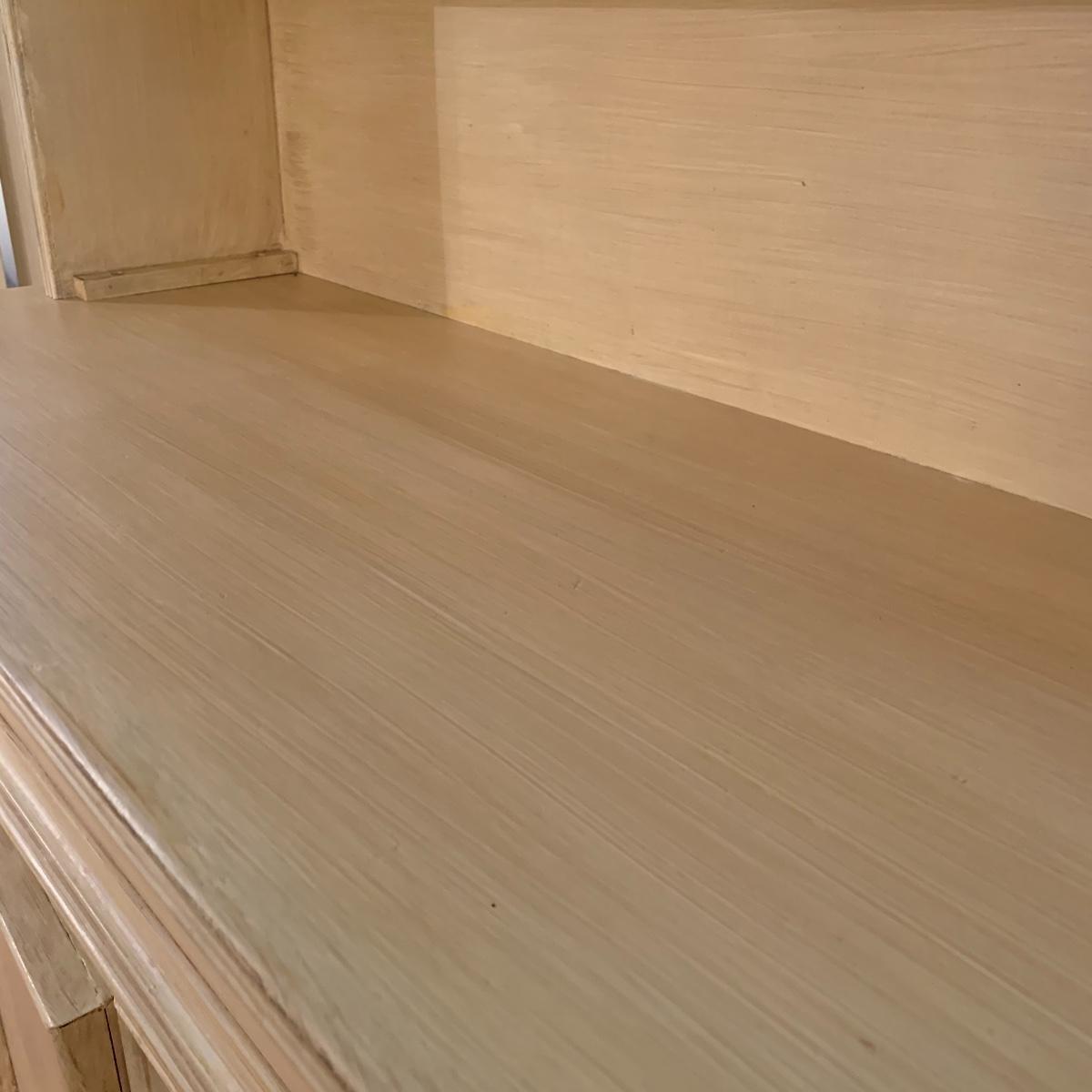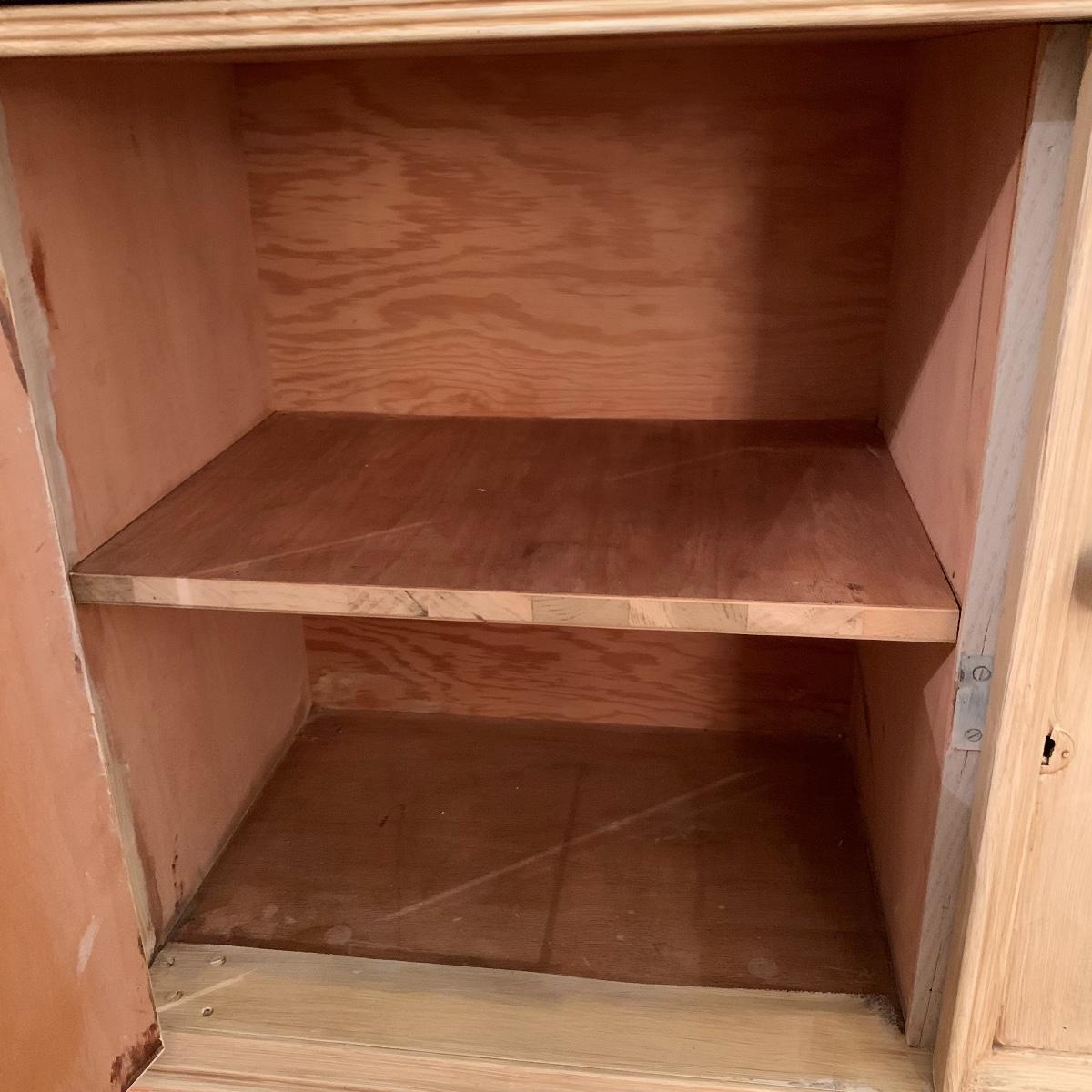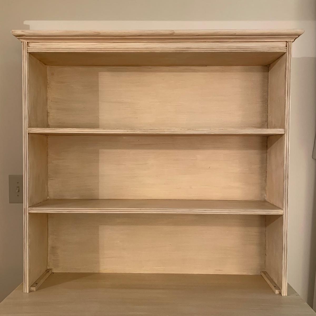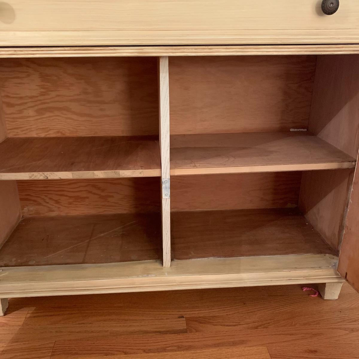 This lot includes one cream colored painted sideboard. The sideboard has two cabinets with shelving inside and a large drawer. It has a top with three shelves that was once detachable but was seemingly glued on, it no longer can be removed. It comes with one key for the cabinets that does not work and is for decorative purposes only. The drawer needs to be wiggled to open up. There are some glue drips on the back of the piece connecting the top and bottom (see photos). The piece measures 17in x 43in x 73in. Local pick up only.