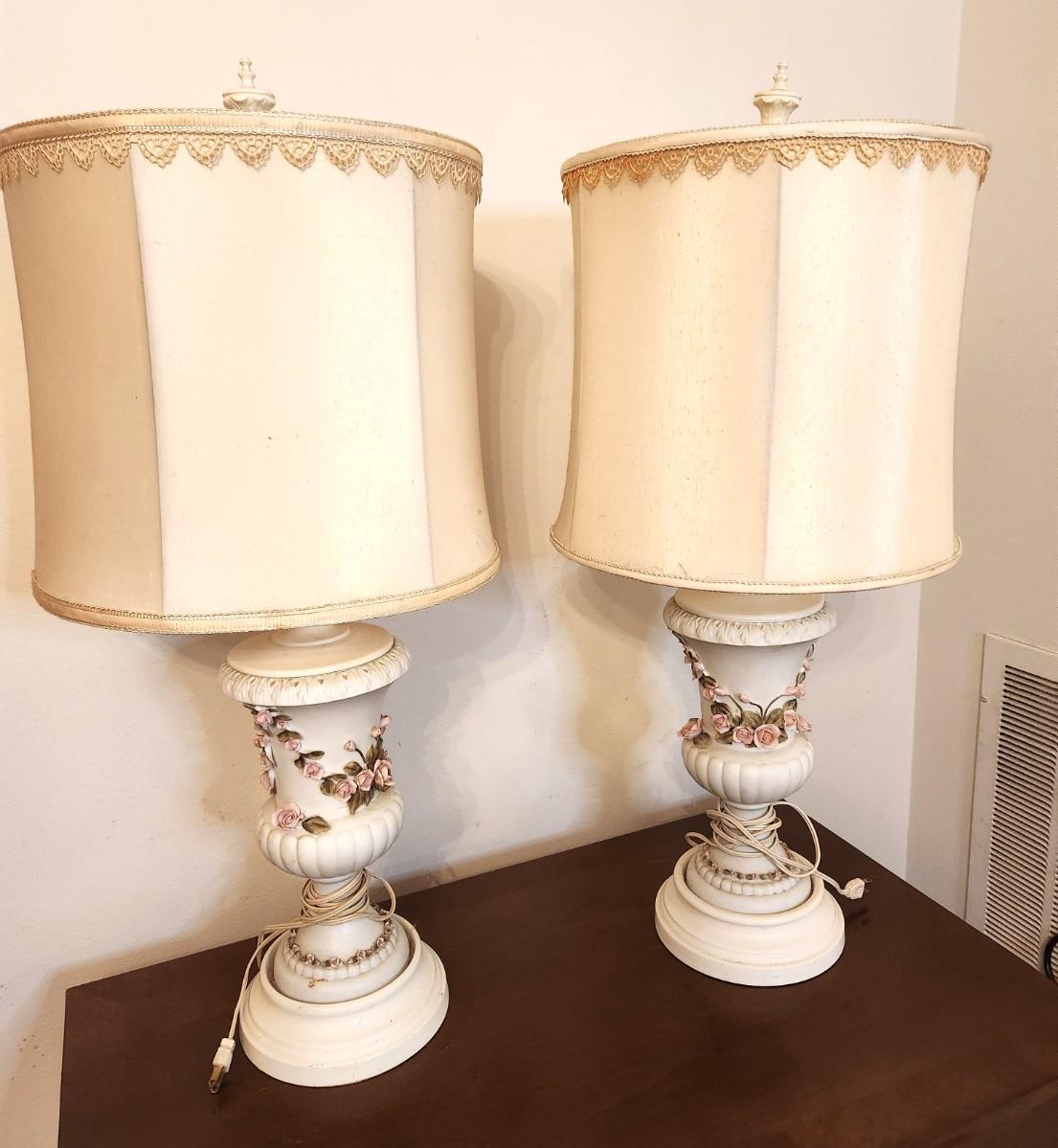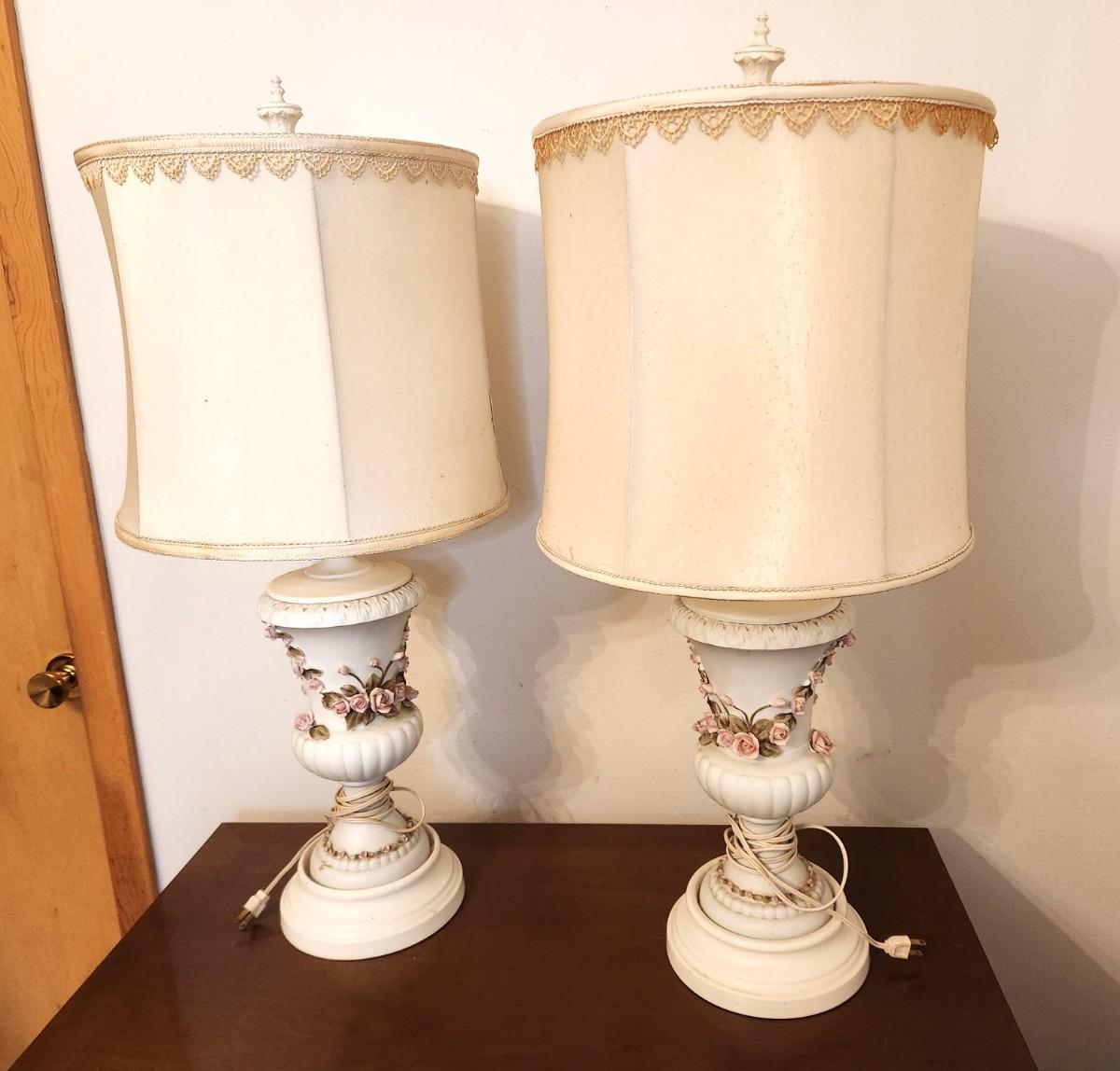 Nice pair of vintage table lamps - porcelain base - 3d rose motif winding around the body of the lamp - both work. 31" tall counting the finial.