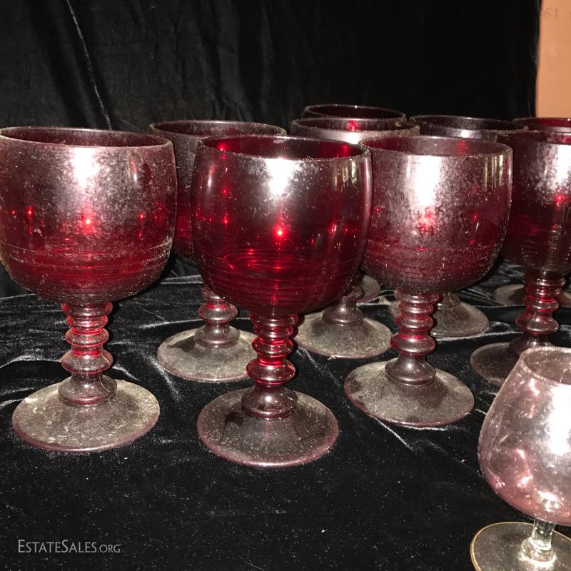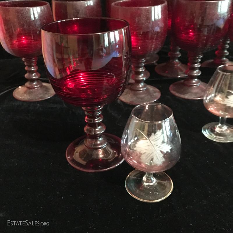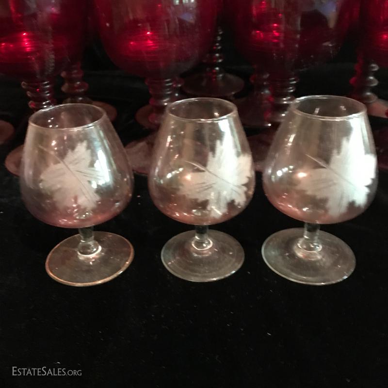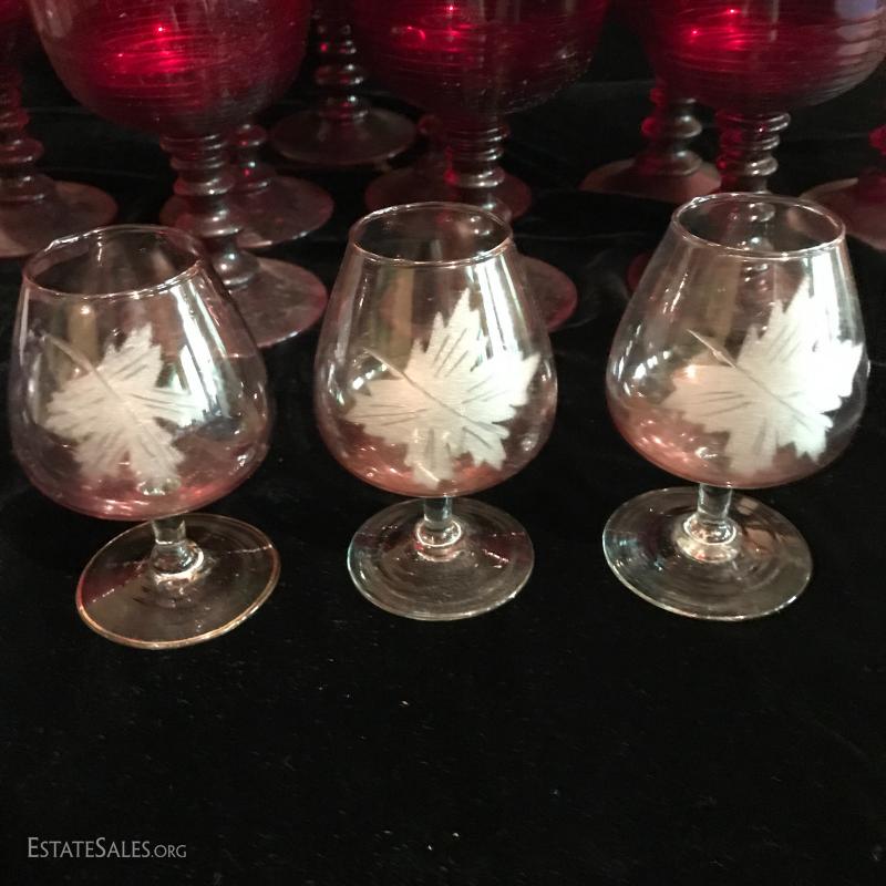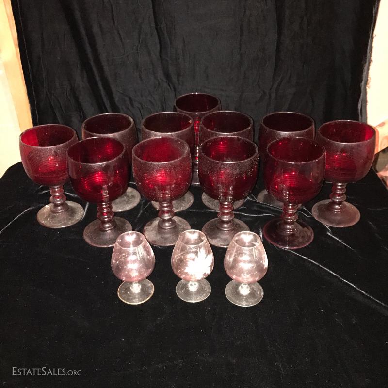 11 tall water goblets in thick red glass (need cleaning). Three small cordial glasses in a pink hue and leaf etching. This lot is available for shipping or local pick up in Flat Rock, NC.