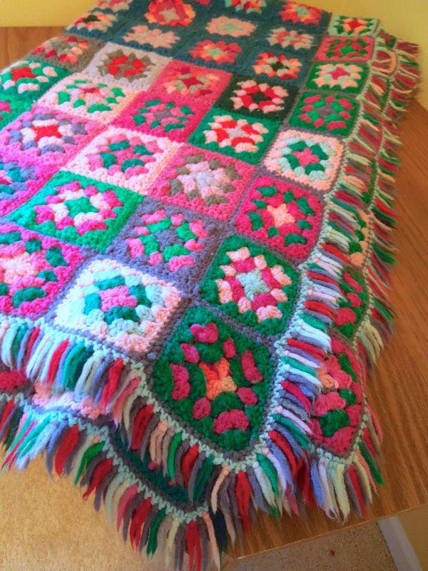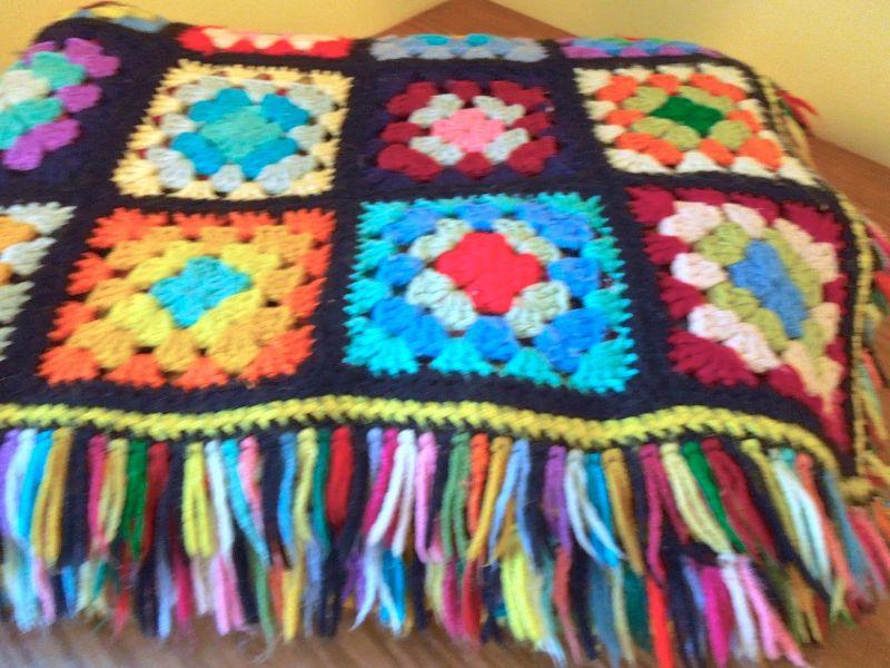 Green and purple wool is 64" x 80" L. Black background multi is 76" w x 94" L. Grey backgrounf multi is 72"l x 56"w. all have personalized handmade by label on them.