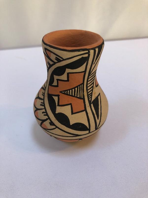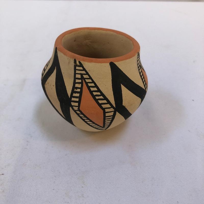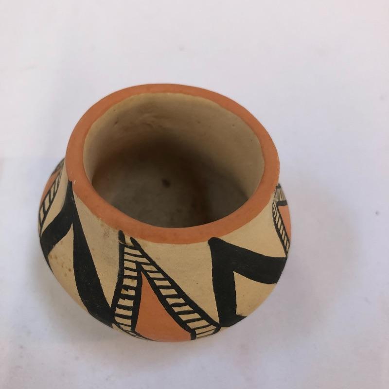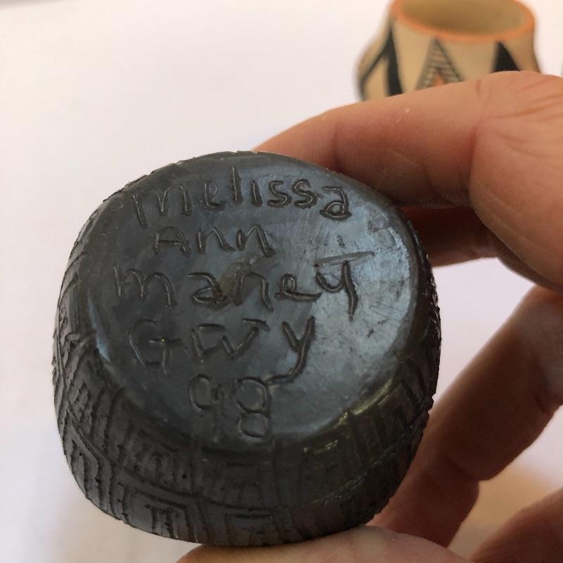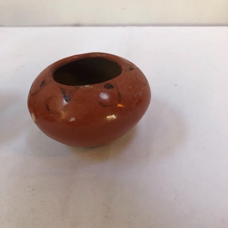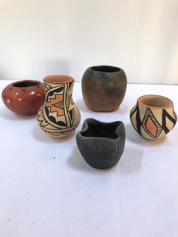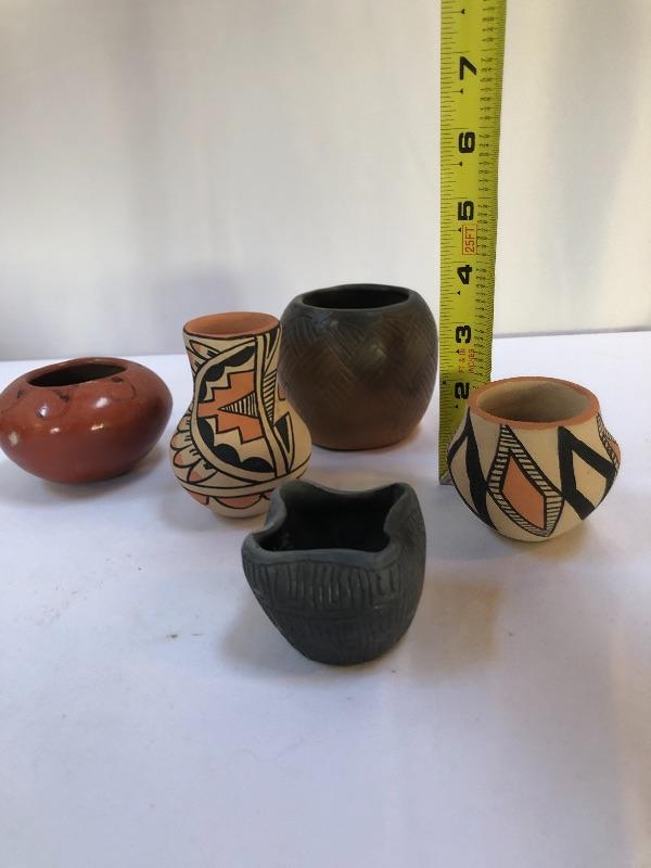 Five miniature pottery urns are in this attractive lot. All but the urn pictured first have been signed by the artists, see images. Two colorful pieces are V. Tafoya and Rosie Owl Mouler a Cherokee made the red clay with black edges and finally Melissa A Maney also Cherokee make the blackware style piece. Also see images for the small blemish on the red urn.