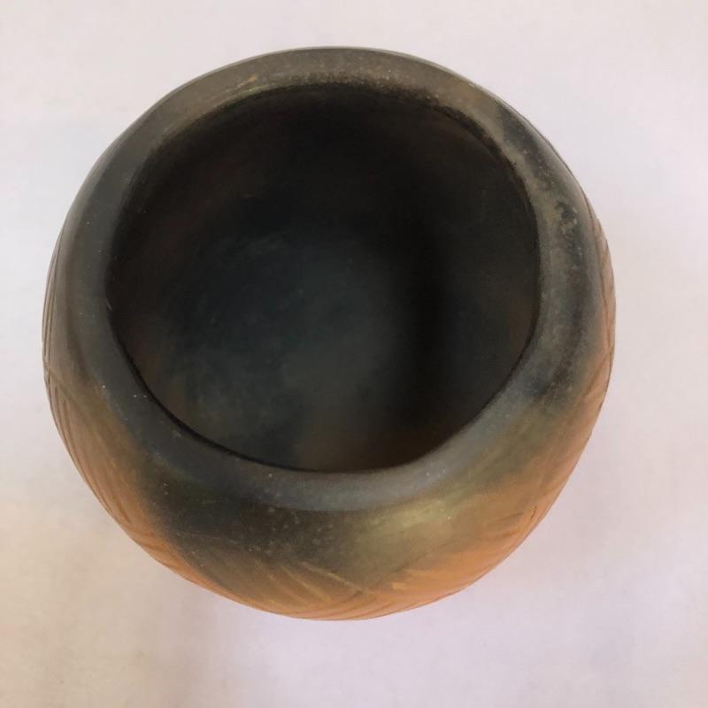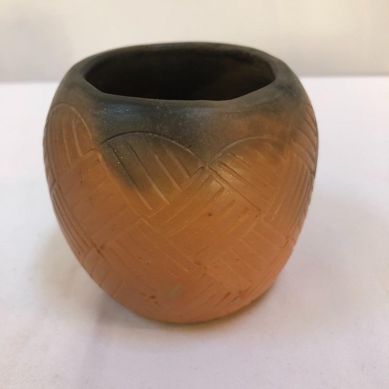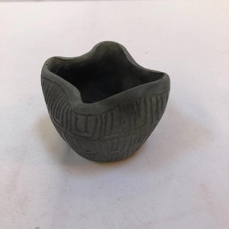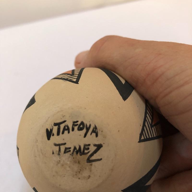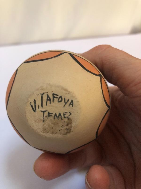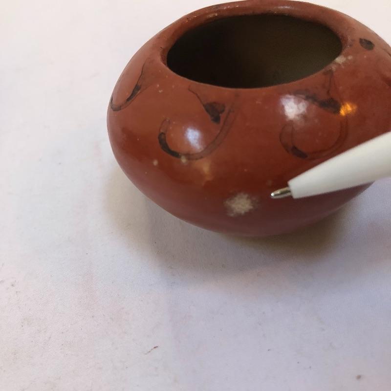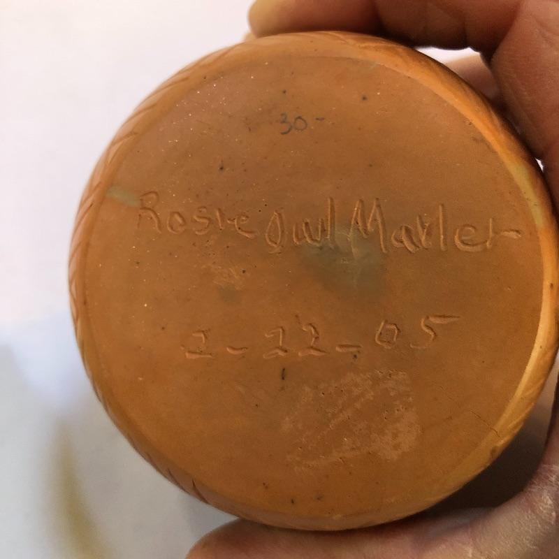 Five miniature pottery urns are in this attractive lot. All but the urn pictured first have been signed by the artists, see images. Two colorful pieces are V. Tafoya and Rosie Owl Mouler a Cherokee made the red clay with black edges and finally Melissa A Maney also Cherokee make the blackware style piece. Also see images for the small blemish on the red urn.