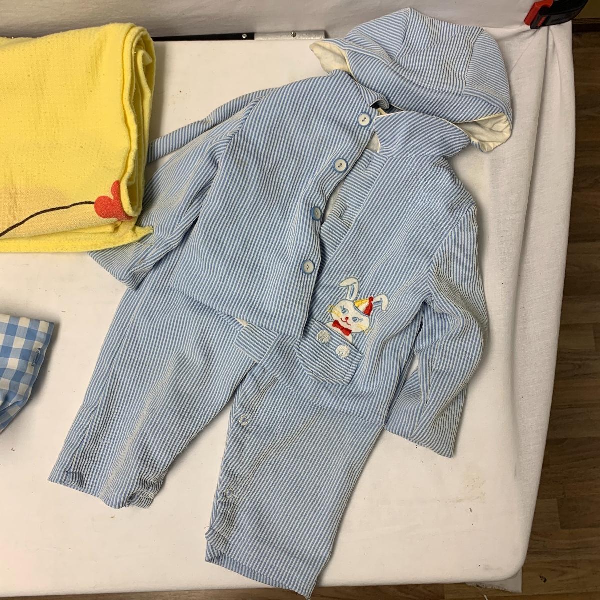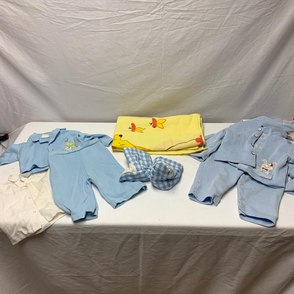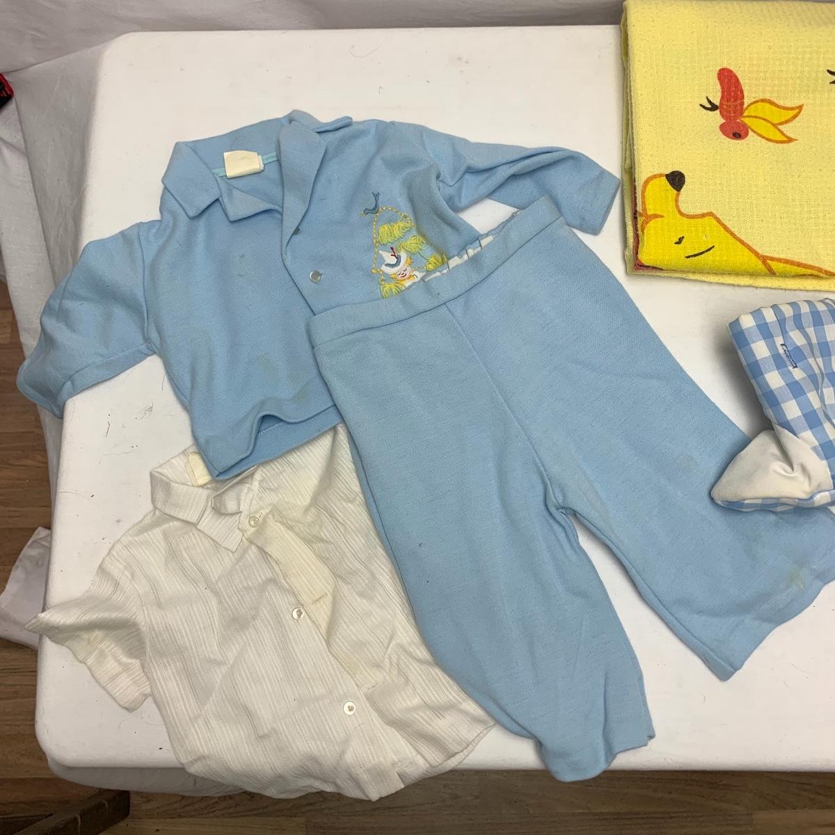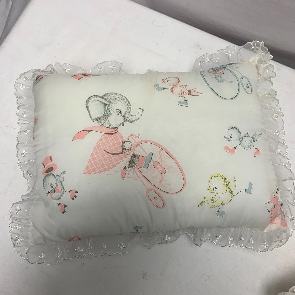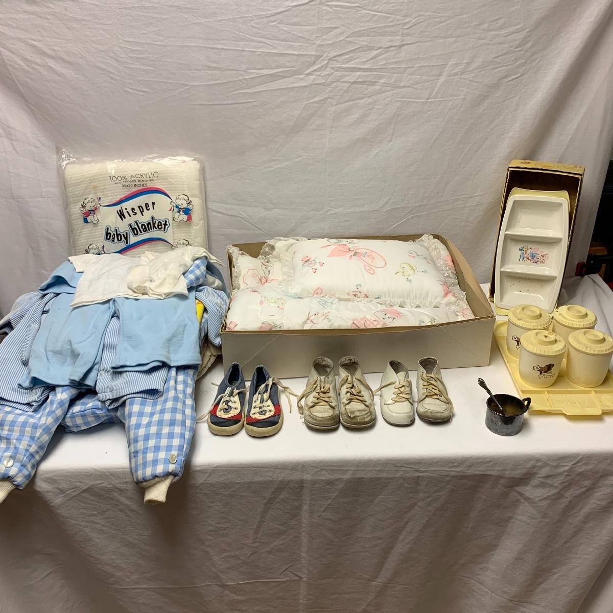 Step back in time with this lot of vintage baby items. Included are an unopened blanket that measures 36” X 50”. Next is a soft pillow and blankets with a cute elephant and duck design. Also included is a cup set that has its own little tray. See pics for how adorable this is. Next is a baby food warming tray that comes in it’s original box and has a manual. There is also a 2’ X 3’ handmade quilt. This quilt has a few stains, so see pics for details. Also included is a latch and hook picture featuring different animals in a boat. This picture measures 51” X 38”. There is also a diaper pale with this lot. Last is a little silver plated cup.