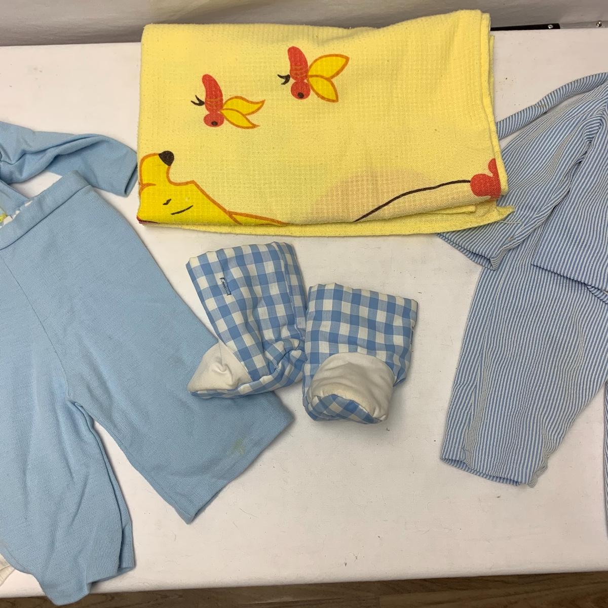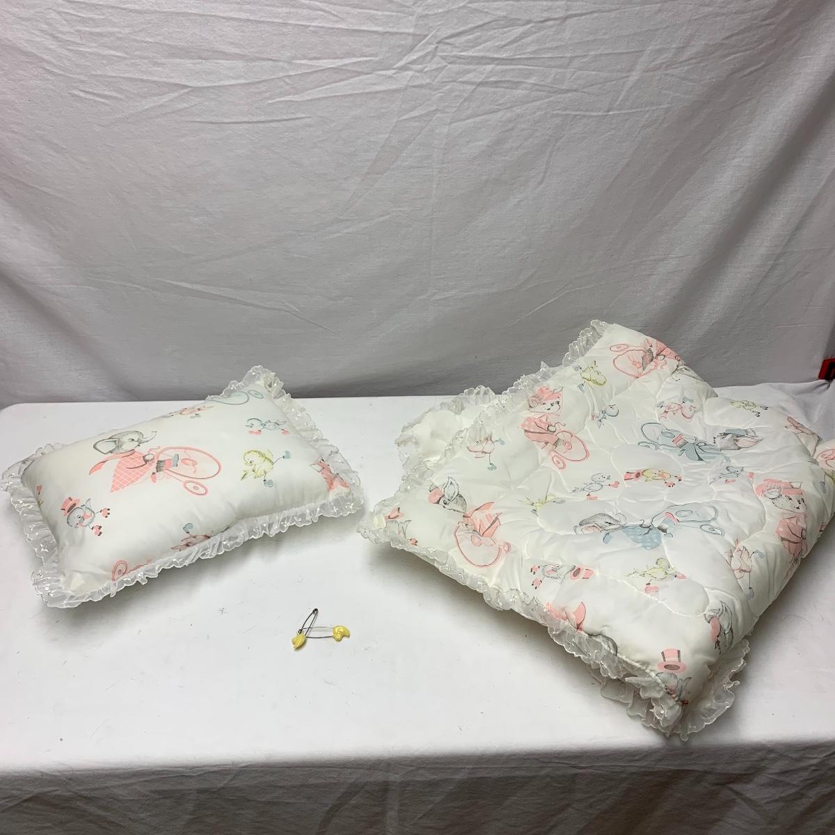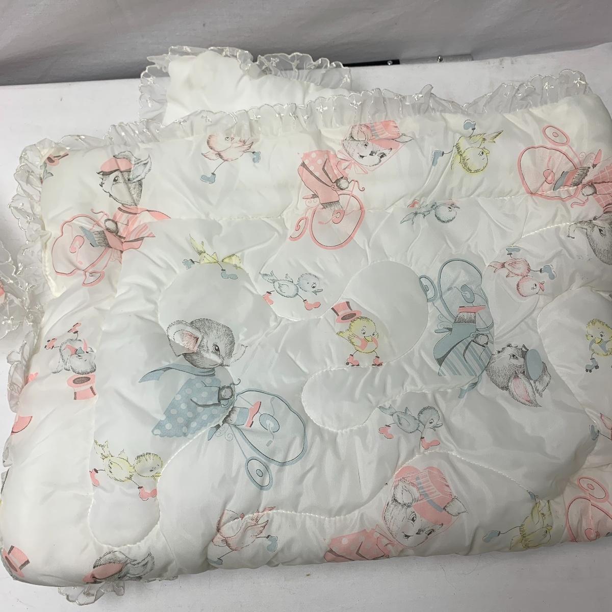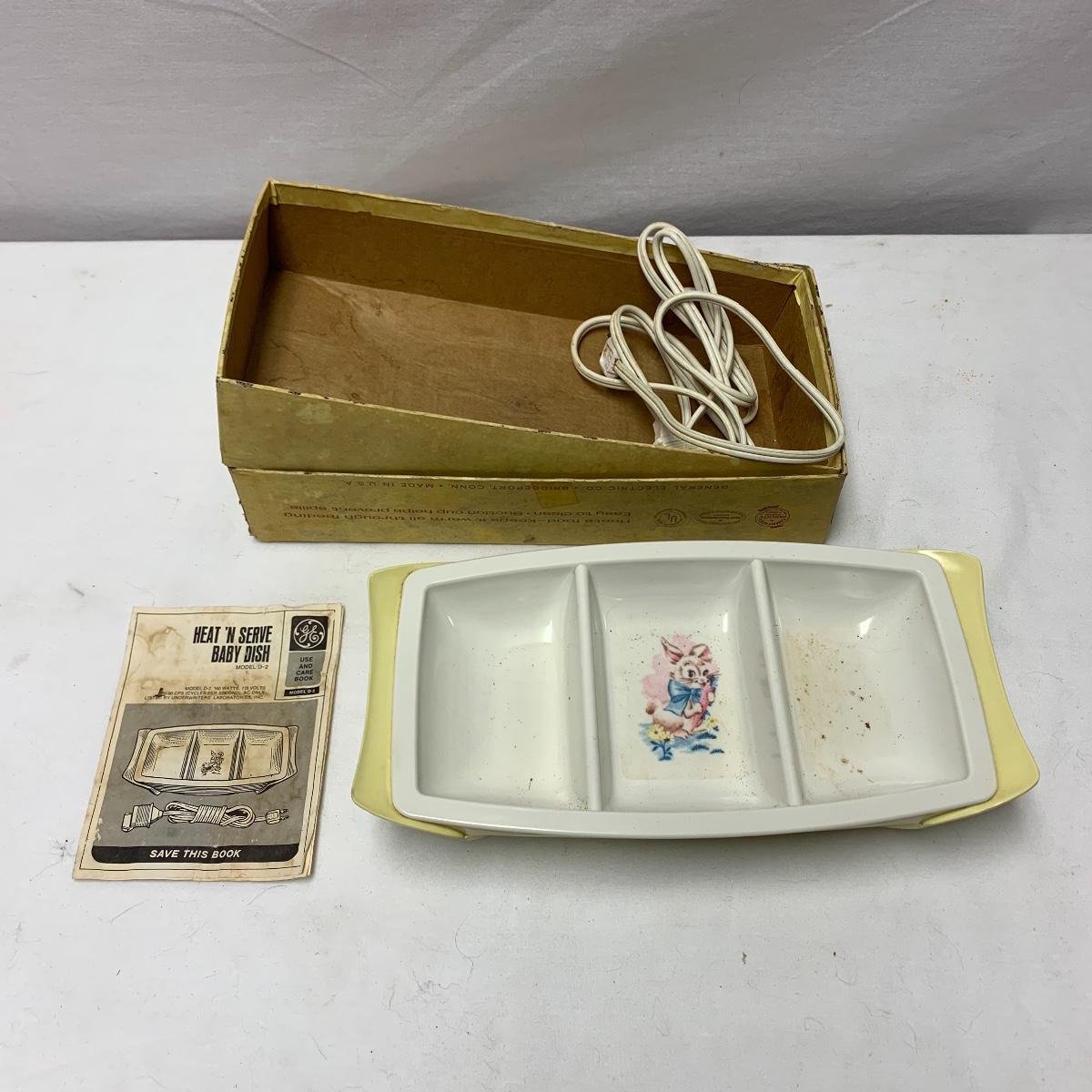 Step back in time with this lot of vintage baby items. Included are an unopened blanket that measures 36” X 50”. Next is a soft pillow and blankets with a cute elephant and duck design. Also included is a cup set that has its own little tray. See pics for how adorable this is. Next is a baby food warming tray that comes in it’s original box and has a manual. There is also a 2’ X 3’ handmade quilt. This quilt has a few stains, so see pics for details. Also included is a latch and hook picture featuring different animals in a boat. This picture measures 51” X 38”. There is also a diaper pale with this lot. Last is a little silver plated cup.