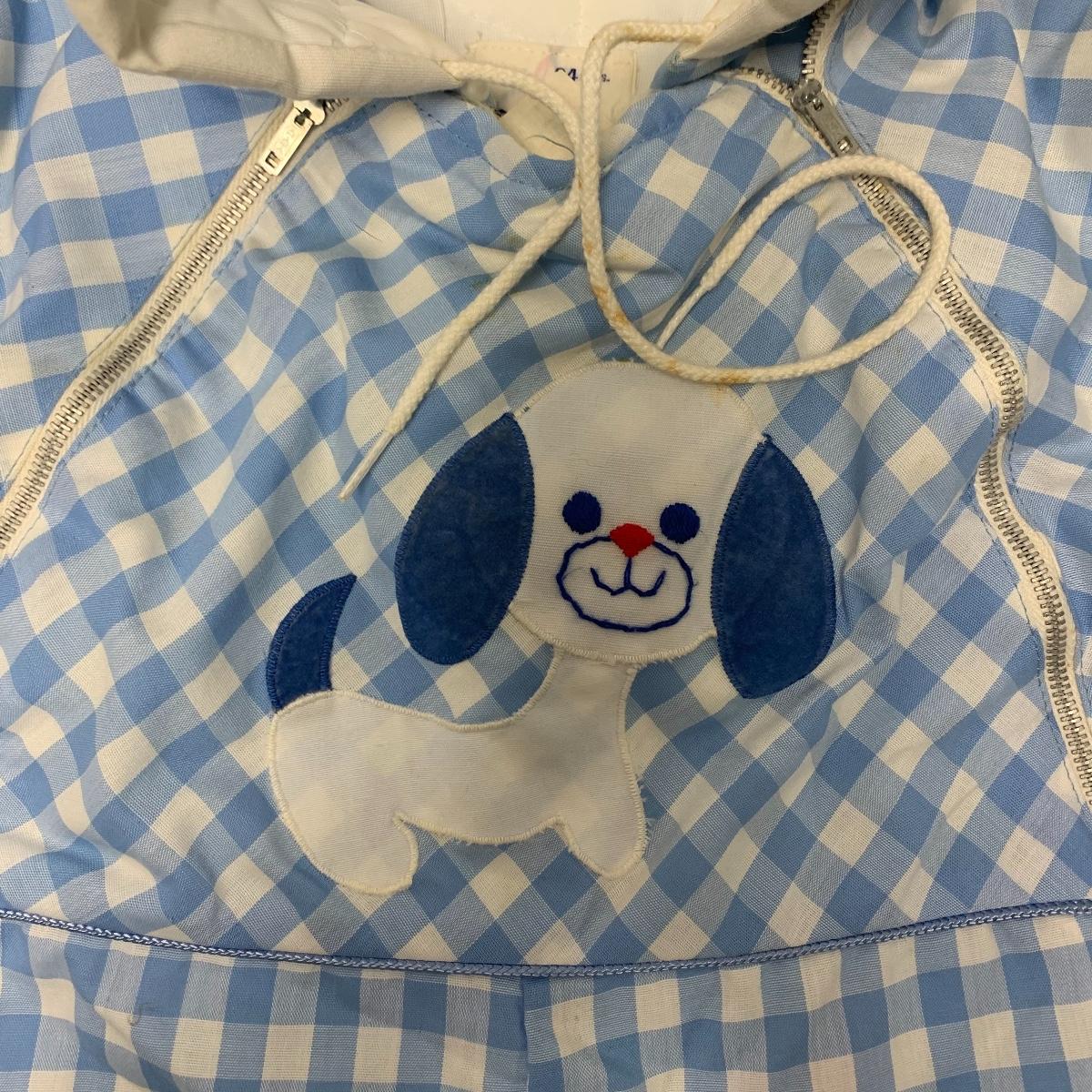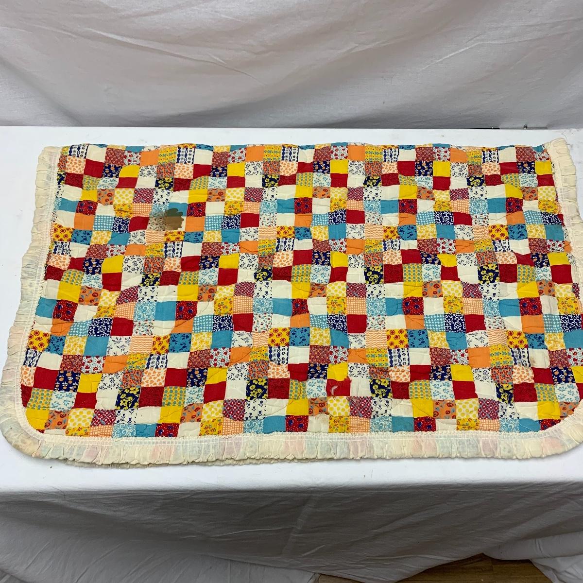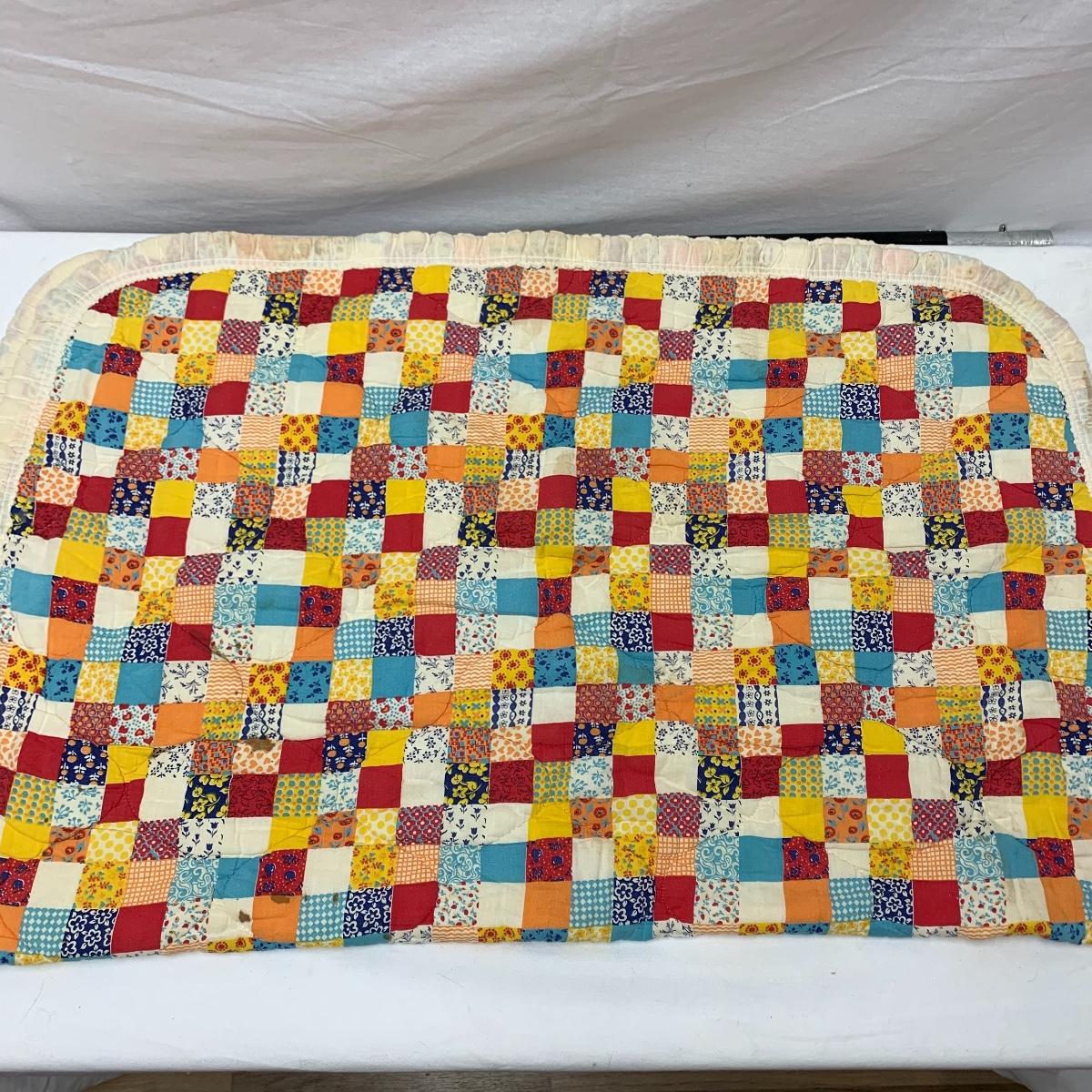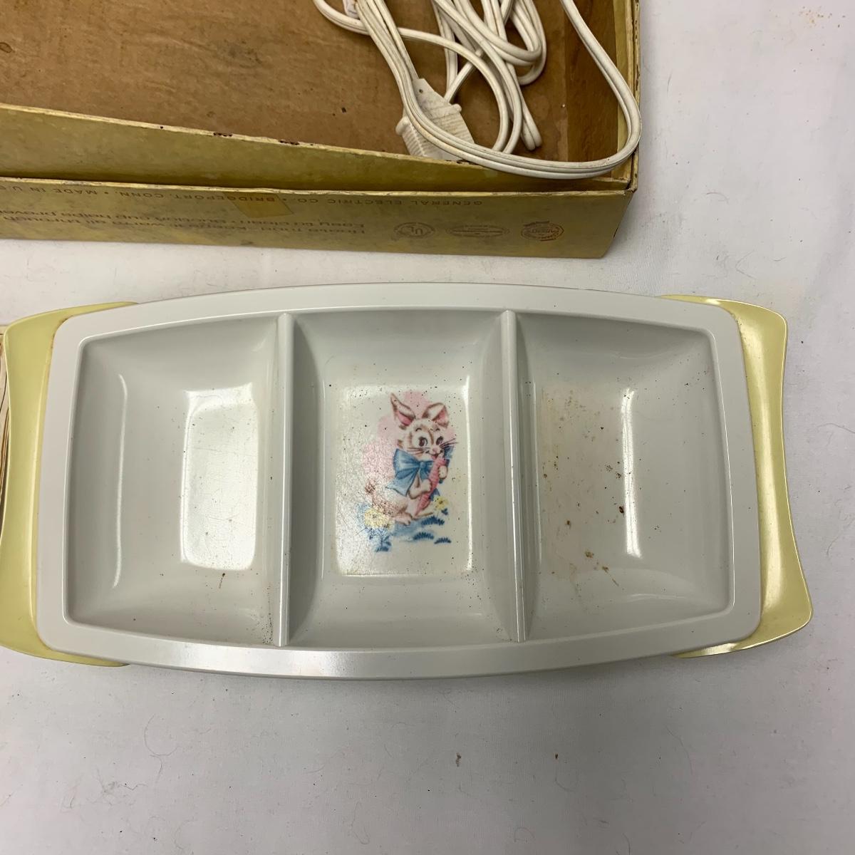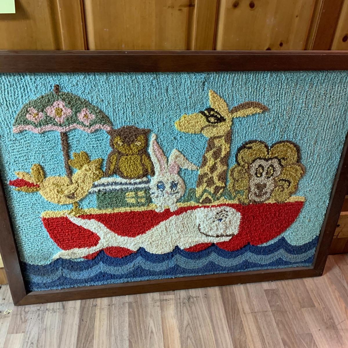 Step back in time with this lot of vintage baby items. Included are an unopened blanket that measures 36” X 50”. Next is a soft pillow and blankets with a cute elephant and duck design. Also included is a cup set that has its own little tray. See pics for how adorable this is. Next is a baby food warming tray that comes in it’s original box and has a manual. There is also a 2’ X 3’ handmade quilt. This quilt has a few stains, so see pics for details. Also included is a latch and hook picture featuring different animals in a boat. This picture measures 51” X 38”. There is also a diaper pale with this lot. Last is a little silver plated cup.