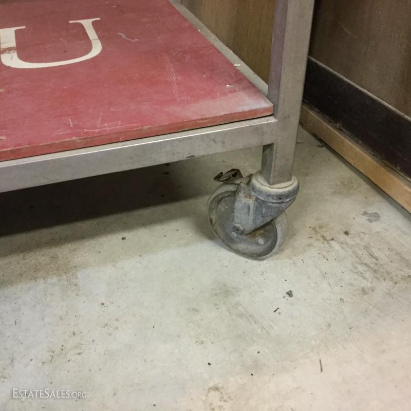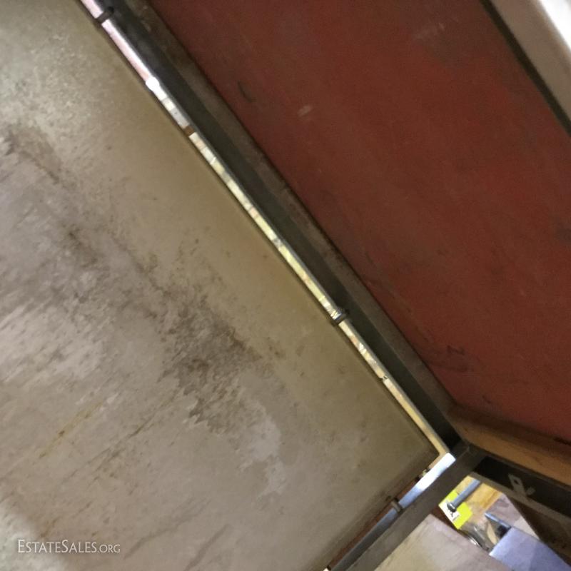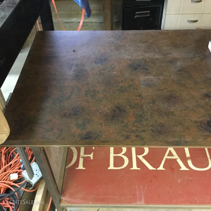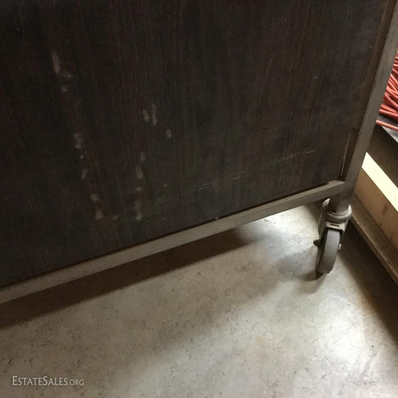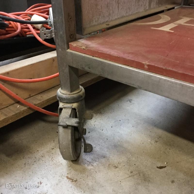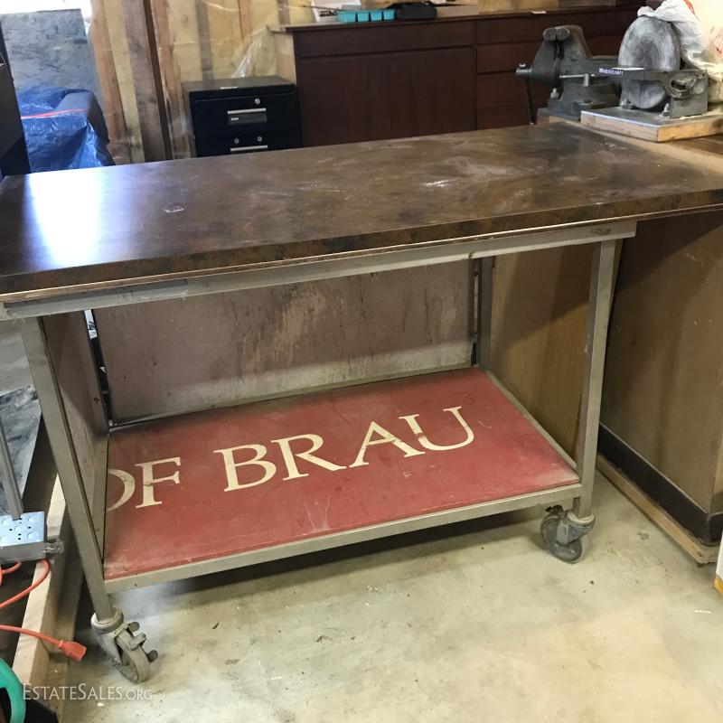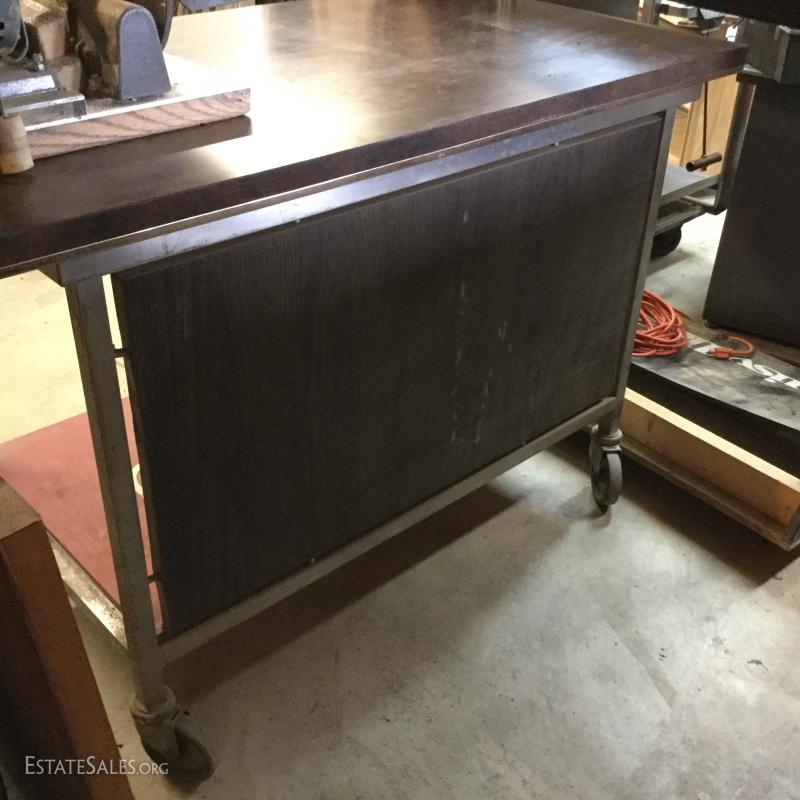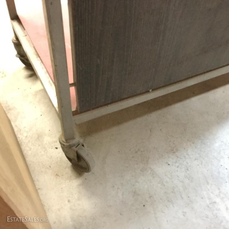 Formica top work table on wheels with metal base and sides. Wood piece create shelf.