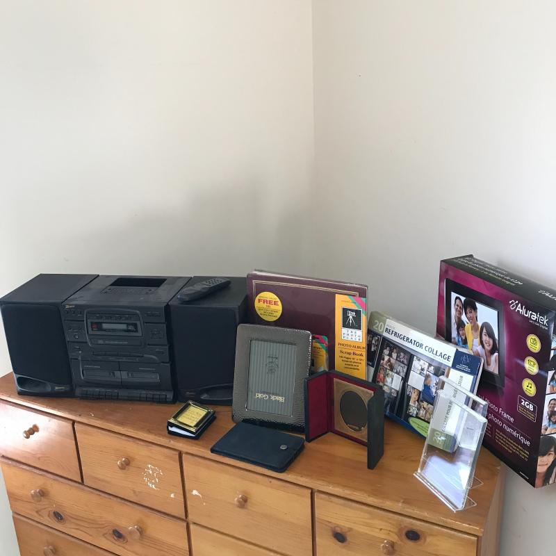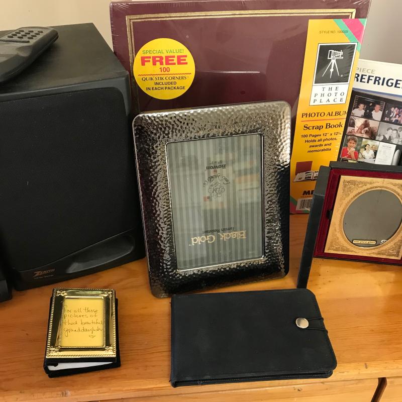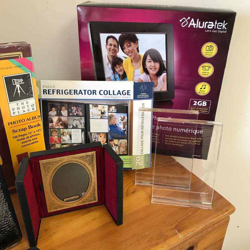 Zenith is Radio, CD and cassette player in one with remote control. Aluratek digital photo frame with 2GB, magnetic fridge photo collage system, misc frames and scrapbooks that are all practically new in boxes. This lot is available for local pick up in Asheville, NC only.