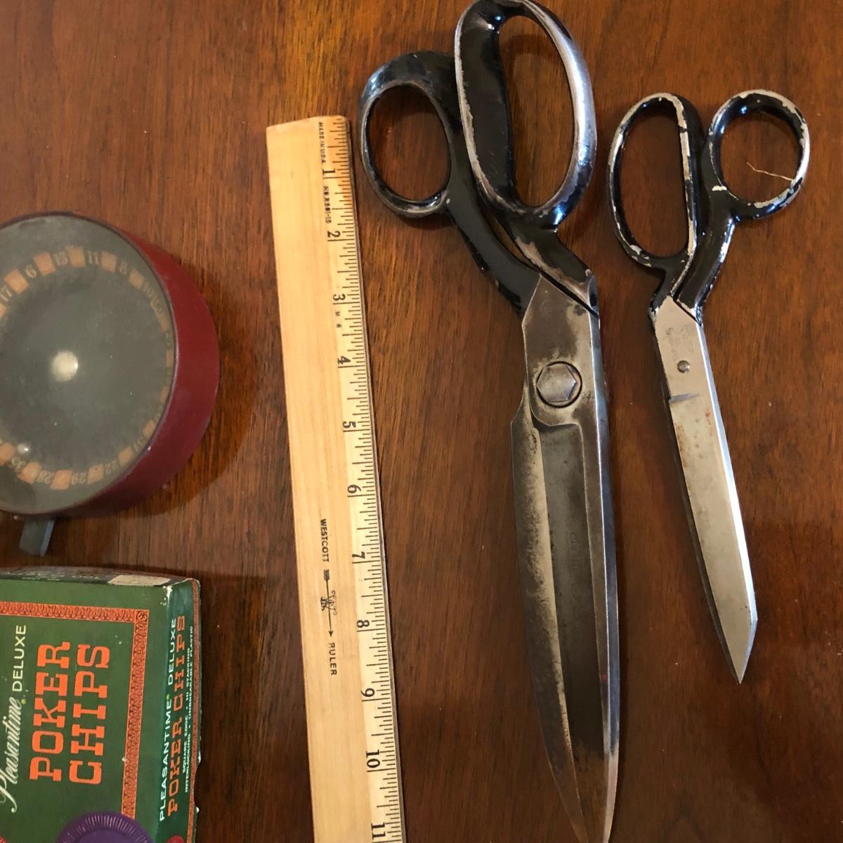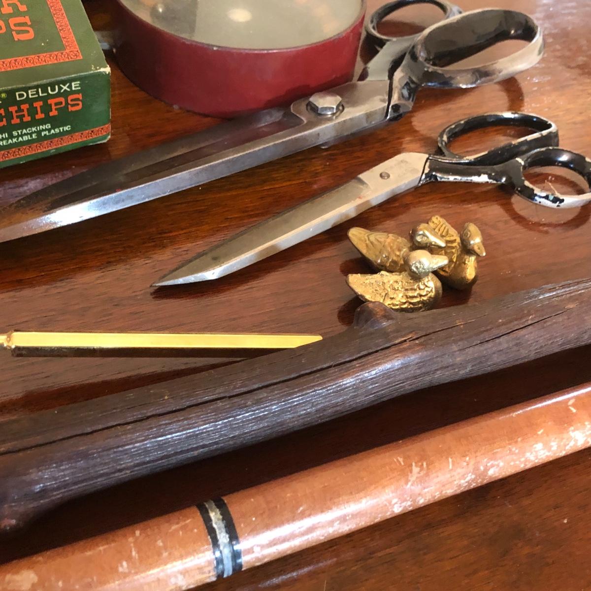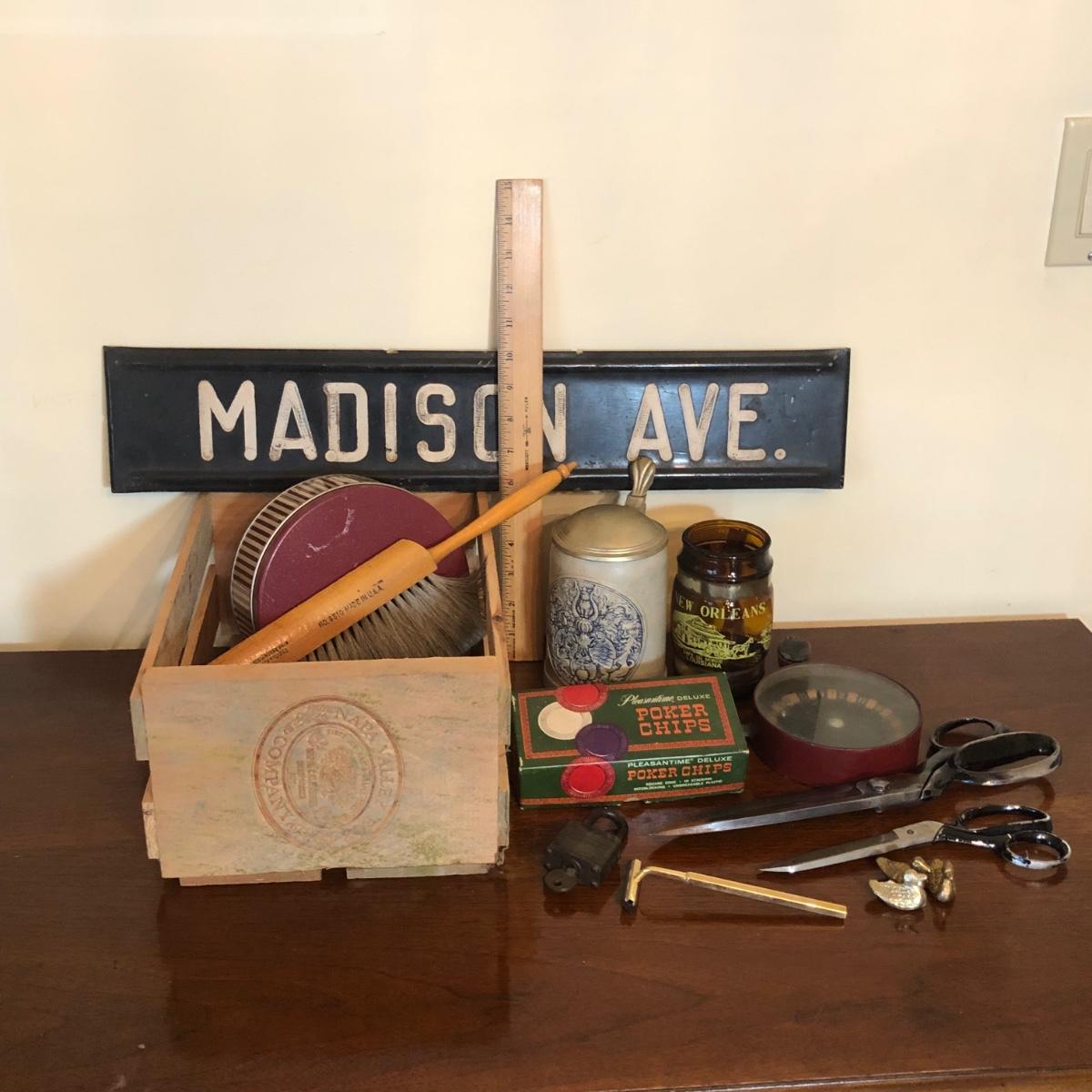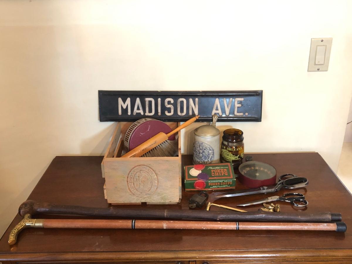 LOT 199M: Brass Tipped Canes, Madison Ave Street Sign, Wiss Inlaid 12" Scissors, Napa Valley Co Crate, Poker Chips, Miniature Rou7lette Wheel & More