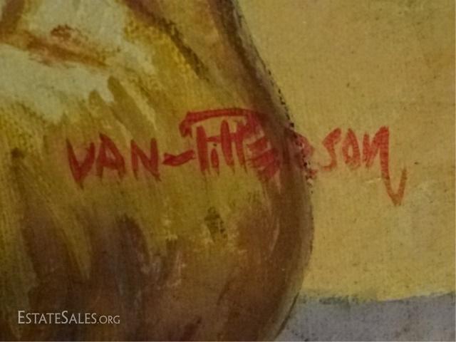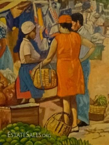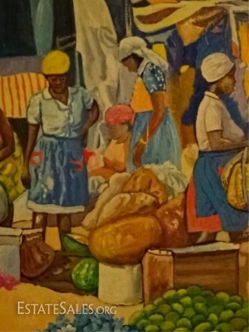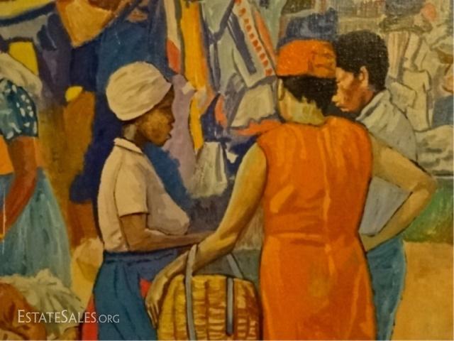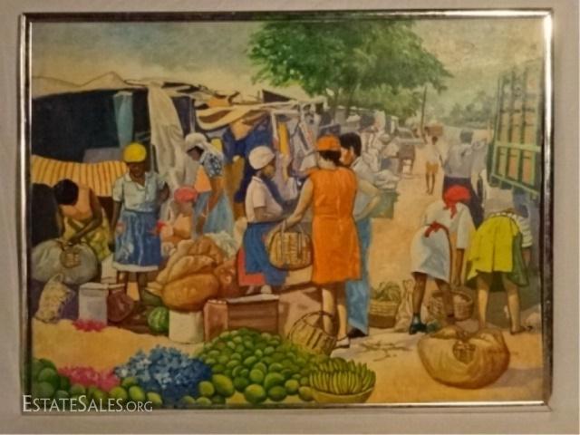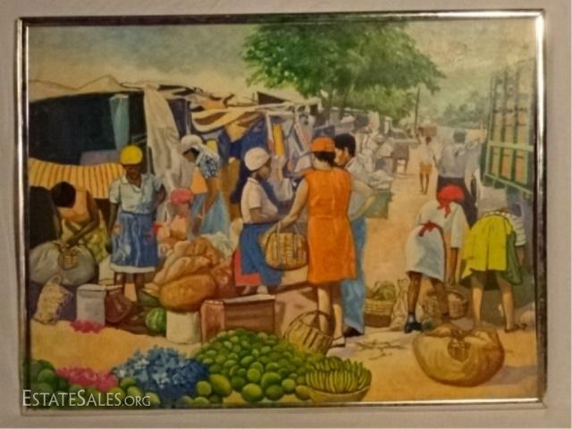 LOT 19B: LLOYD VAN PITTERSON HAITIAN PAINTING ON CANVAS, MARKET SCENE, SIGNED VAN PITTERSON LOWER RIGHT, VERY GOOD CONDITION, FRAMED SIZE 31.5" X 41", SKU390.37