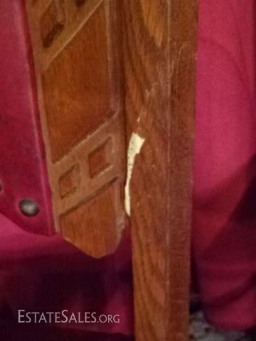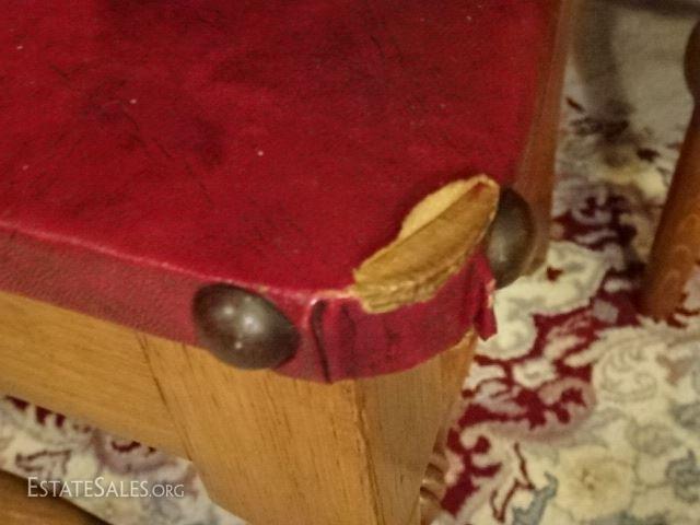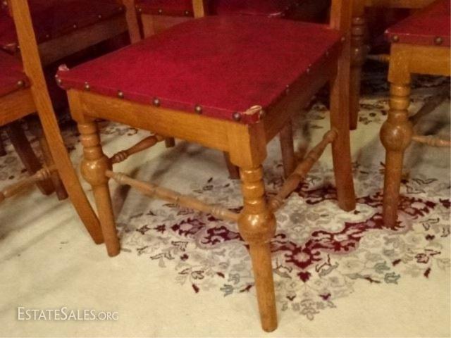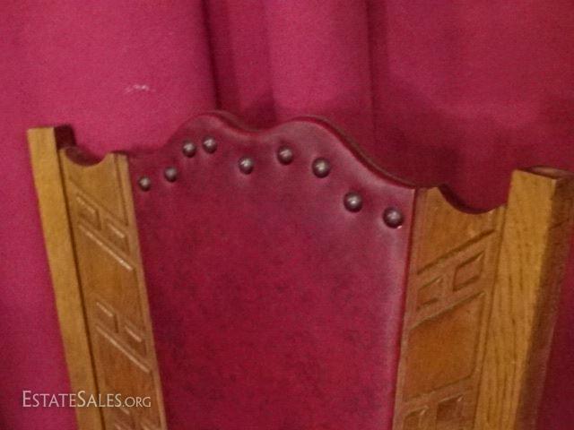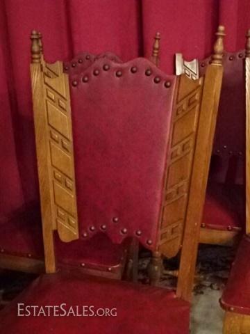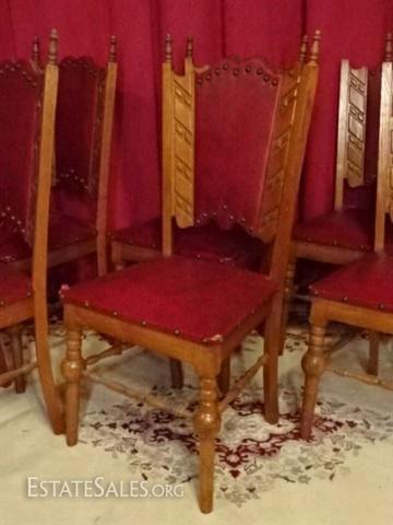 LOT 19D: 6 SPANISH COLONIAL REVIVAL CHAIRS, LEATHER UPHOLSTERY, FAIR CONDITION WITH WEAR AND TEARS TO LEATHER IN SPOTS (SEE PHOTOS) AND 1 CHAIR IS MISSING FINIALS, OTHERWISE GOOD CONDITION, 42"H X 18"W D 18.5"D, SKU316.01