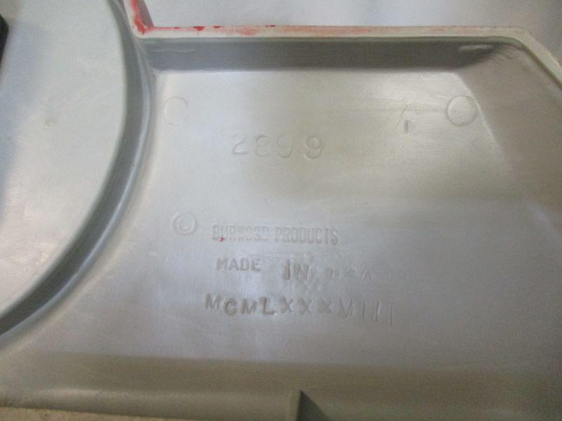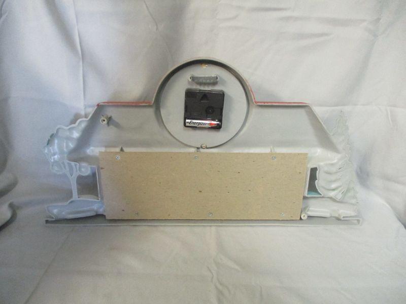This clock is in good working condition. The plastic cover over the clock has some scratches, but from a short distance, those scratches are not noticeable. It is made of plastic and measures about 20.5" x 10.5". It is marked on the back "Burwood Products" 1988 (in Roman numerals).