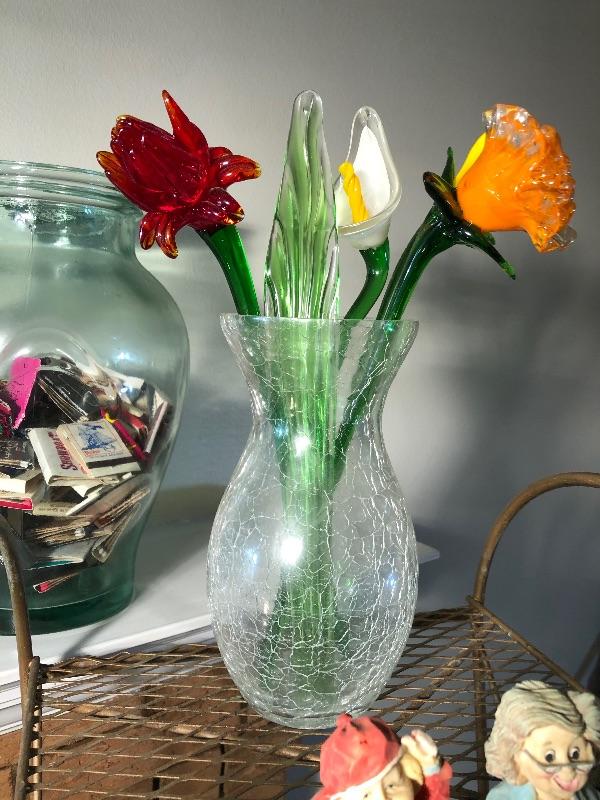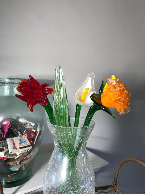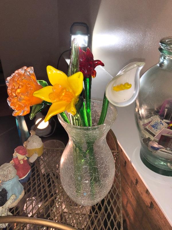 Hand blown/painted glass flowers/leaves (qty 5) in glass vase