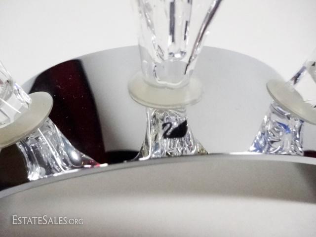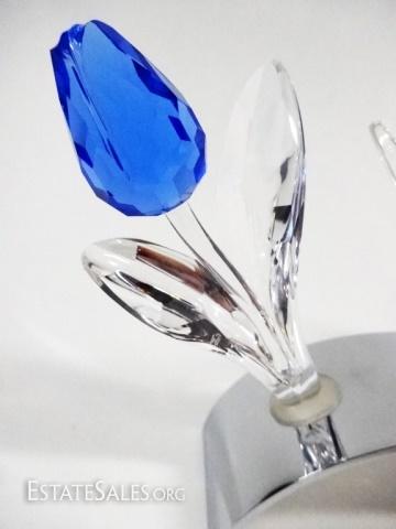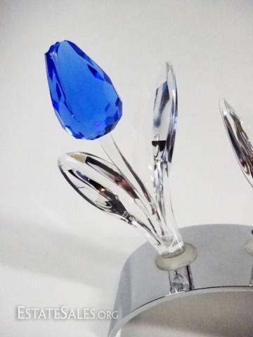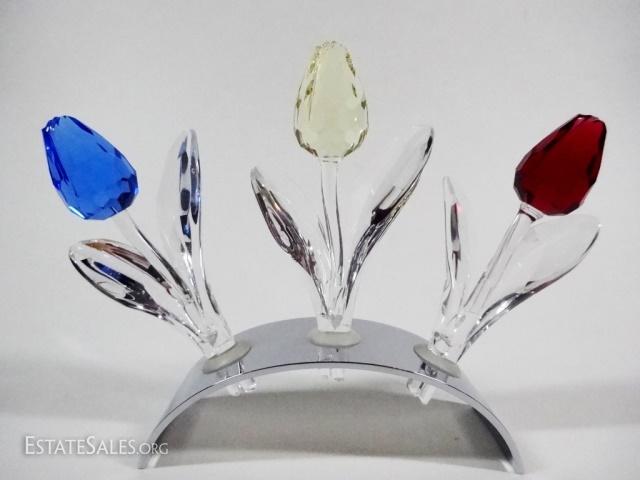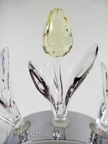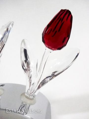 LOT 2: 4 PC SWAROVSKI SCS LIMITED EDITION, INCLUDES 3 LARGE TULIPS WITH 2002 CHROME DISPLAY TULIP BASE, WITH BOXES, BASE APPROX 3 7/8"L X 1 1/4"H, TULIPS APPROX 3 3/4"H X 2"W