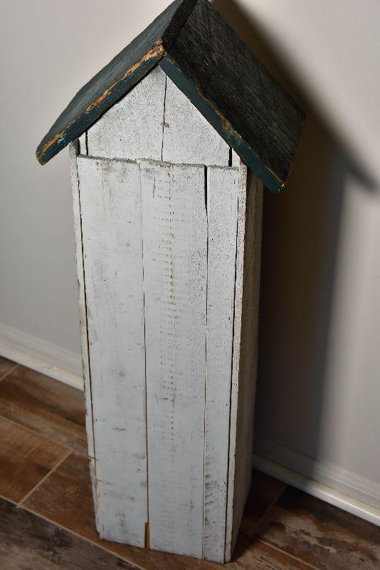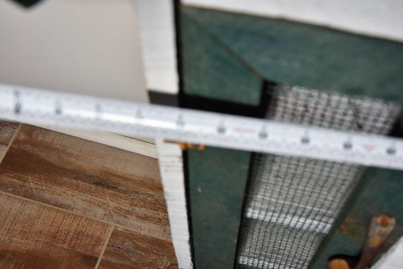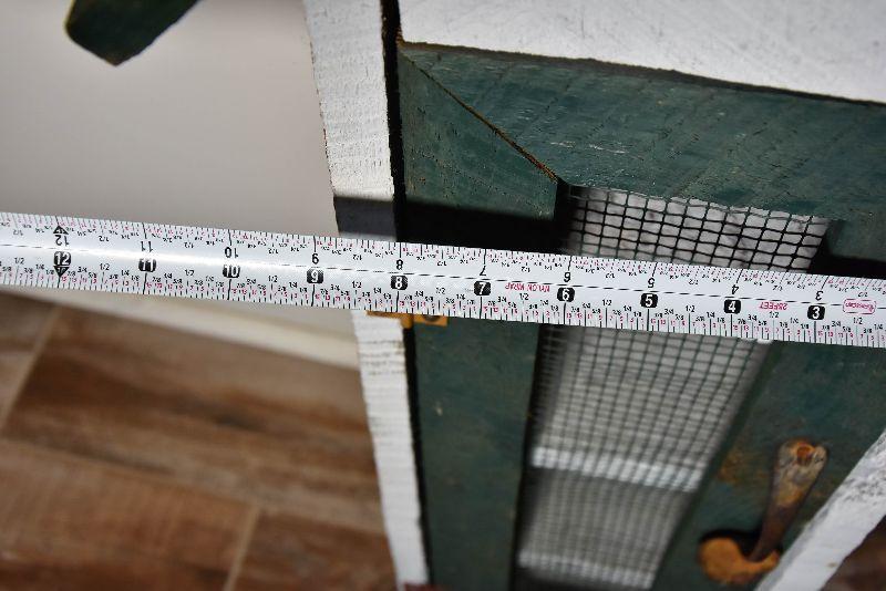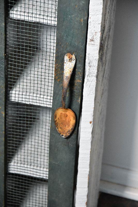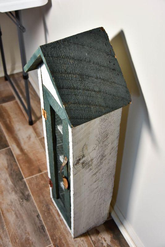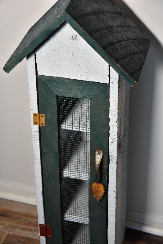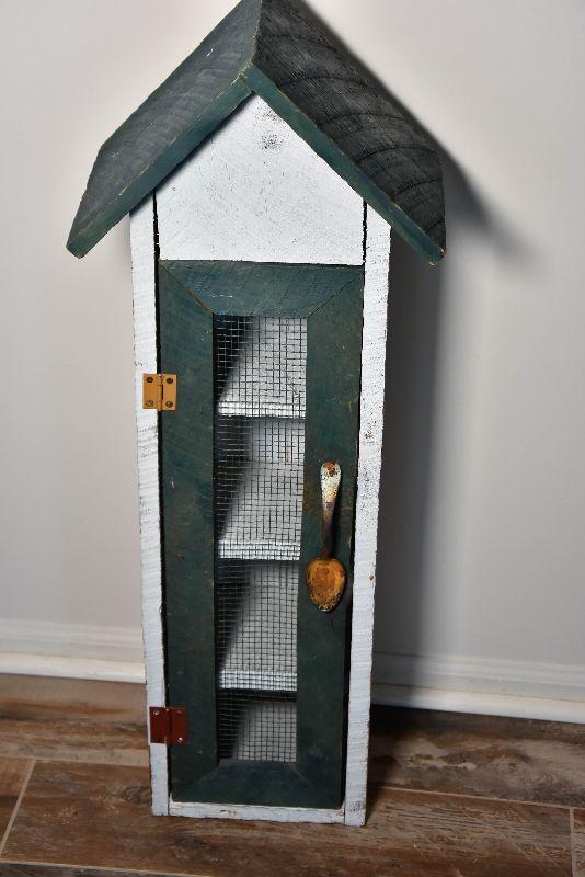 Wooden cabinet with chicken wire door. Great for keeping onions and potatoes.