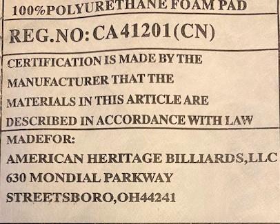American Heritage Billiards LLC. May be some small staining in area. Dimensions: 29 1/2"H (floor to seat) x 45"H total.
