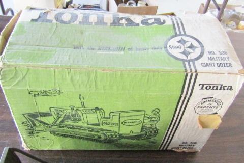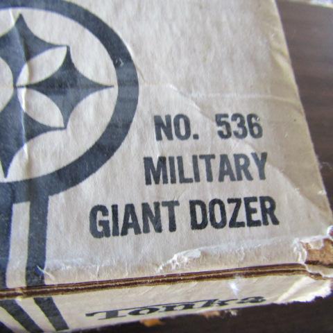 TONKA MILITARY GIANT DOZER #536 IN VERY GOOD CONDITION AND INCLUDES ORIGINAL BOX IN FAIR-GOOD CONDITION