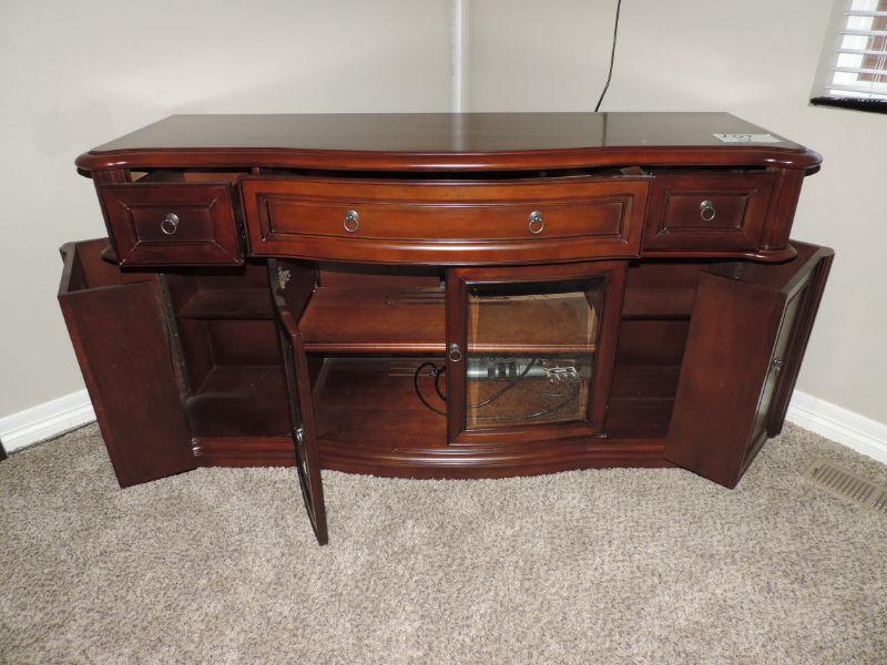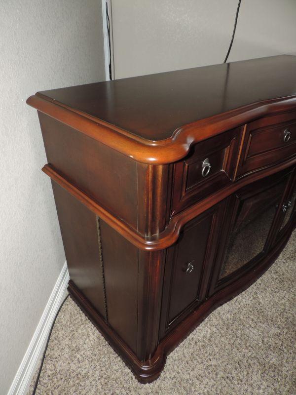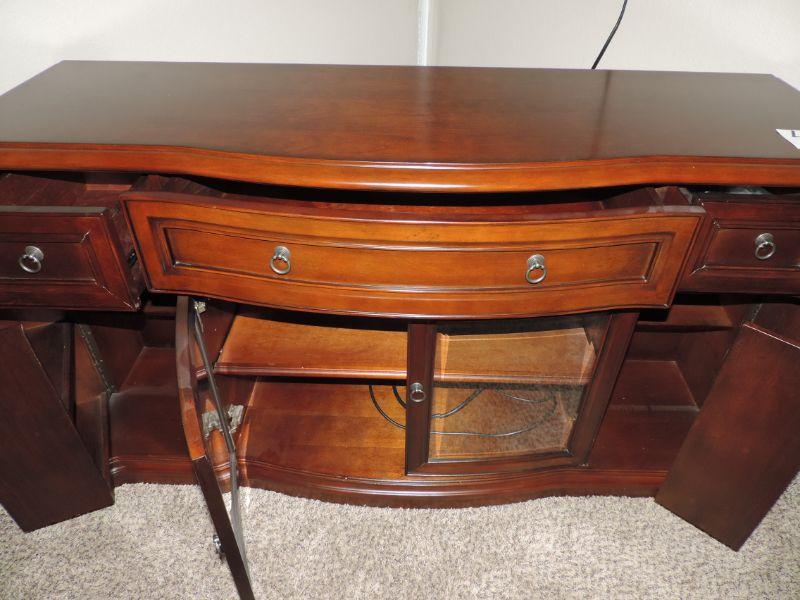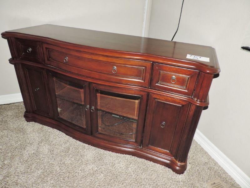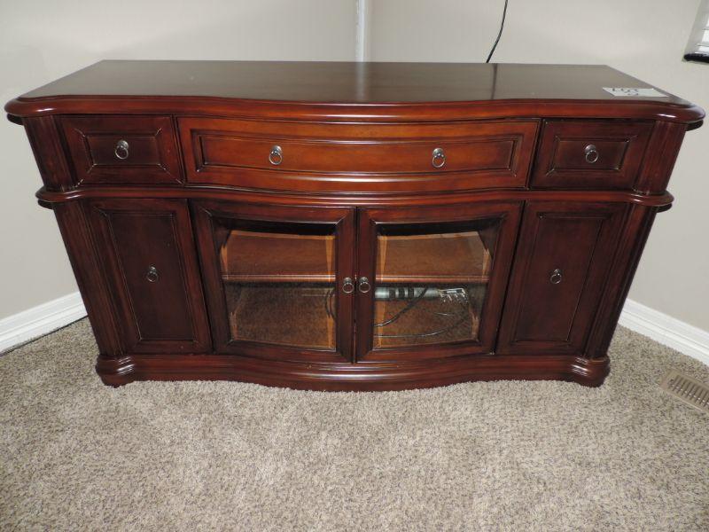 THIS SOLID WOOD PIECE ALSO HAS SEVERAL USES. ITS OWNER USED IT AS A MEDIA STAND BUT WITH ITS DRAWERS AND CABINETS IT COULD ALSO BE USED AS A BUFFET/CREDENZA.