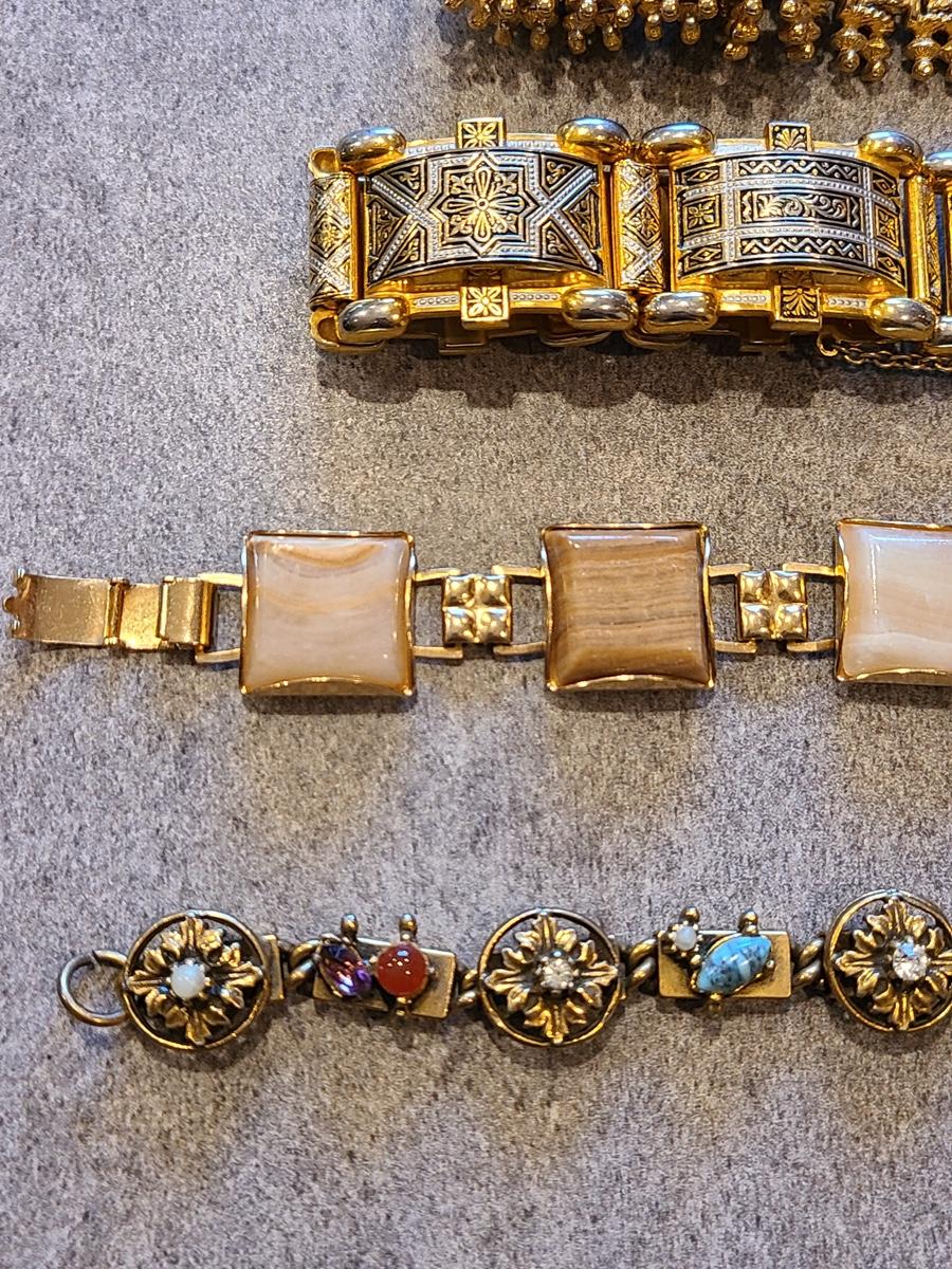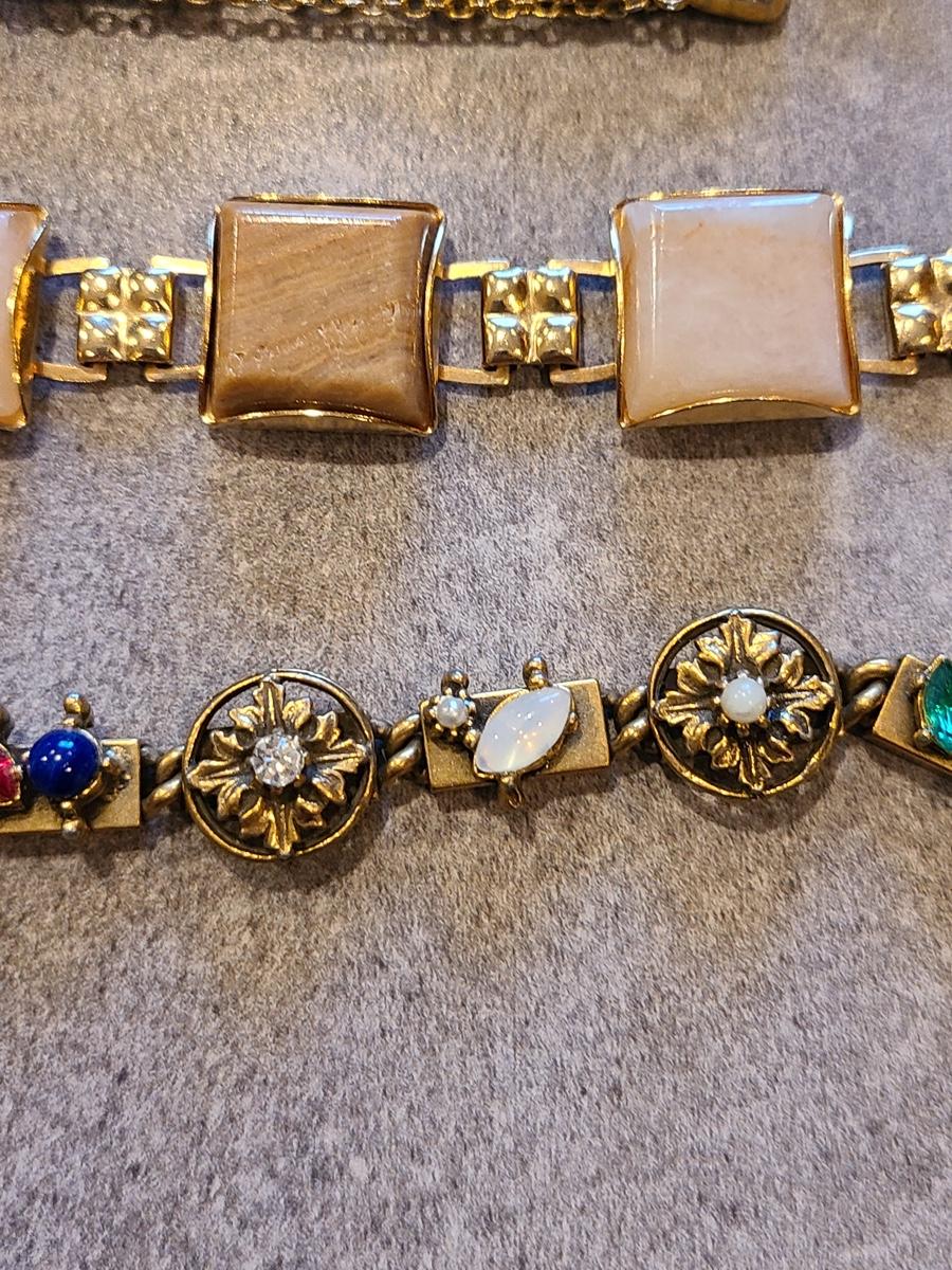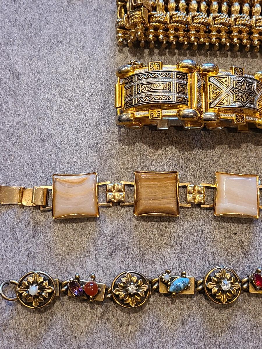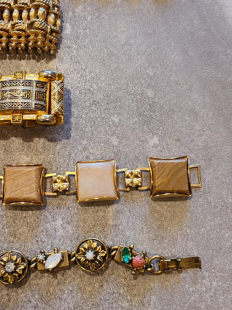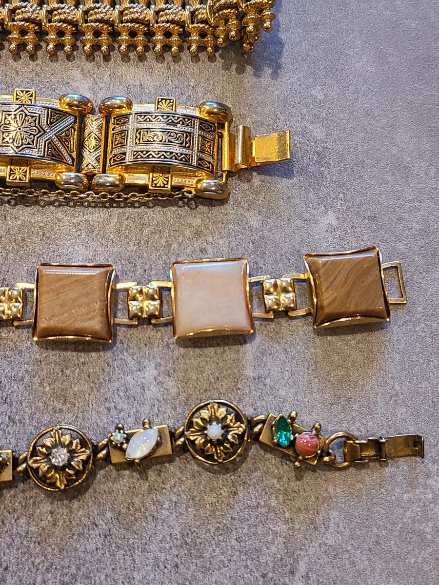 Vintage lot of bracelets, gold in tone. No makers marks. Fun for retro look! Please see all pictures as they are the best representation of the items. The pictures show condition, measurements if taken, and what is included in the lot. Due to the large amount that we photograph and the time frame, we are not always able to take measurements. All items unless noted, are pre-owned and have been used. If you purchased furniture, you must bring help. We do not allow one person to carry large furniture out on their own. Bring help, tools and a truck for the safety of our client’s homes, and your personal safety. Company policy. Thank you.