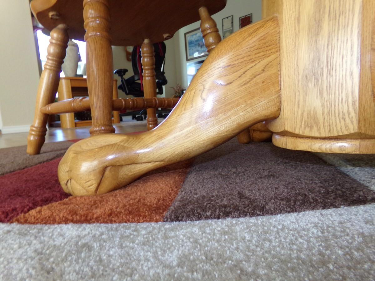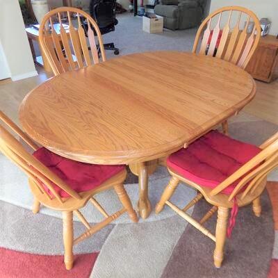 .BEAUTIFUL OVAL OAK DINING TABLE WITH 4 CHAIRS. THE LEGS ON THIS TABLE HAVE A VERY UNIQUE DESIGN (PLEASE SEE PICTURES). TABLE LEAF IS ALREADY ON THIS TABLE. THIS TABLE IS VERY SOLID AND IS IN GOOD CONDITION. THE CHAIRS ARE VERY STURDY AND IN GOOD CONDITION AND THEY DO HAVE SEAT CUSHIONS ON THEM.