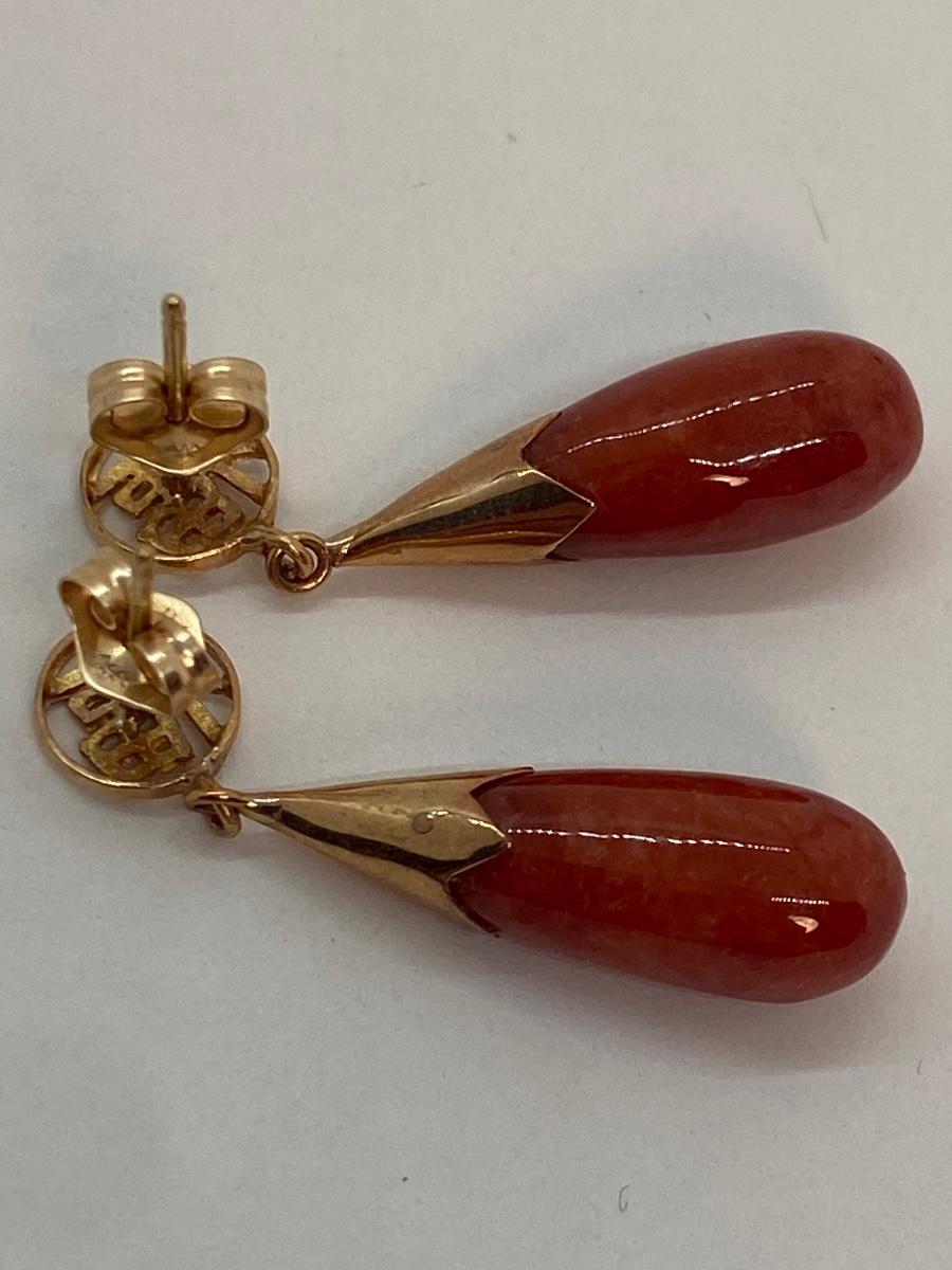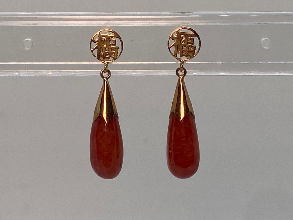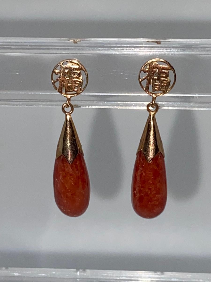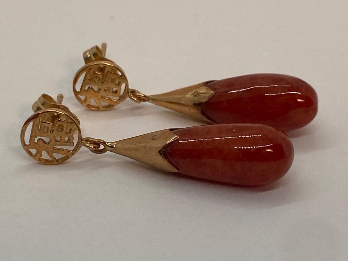 Lot 2: 14k WW Orange Jade Good Fortune Teardrop Dangle Pierced Earrings