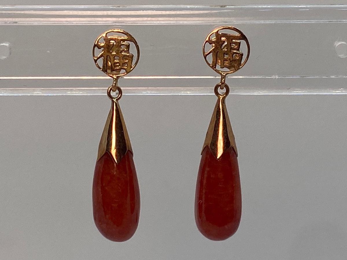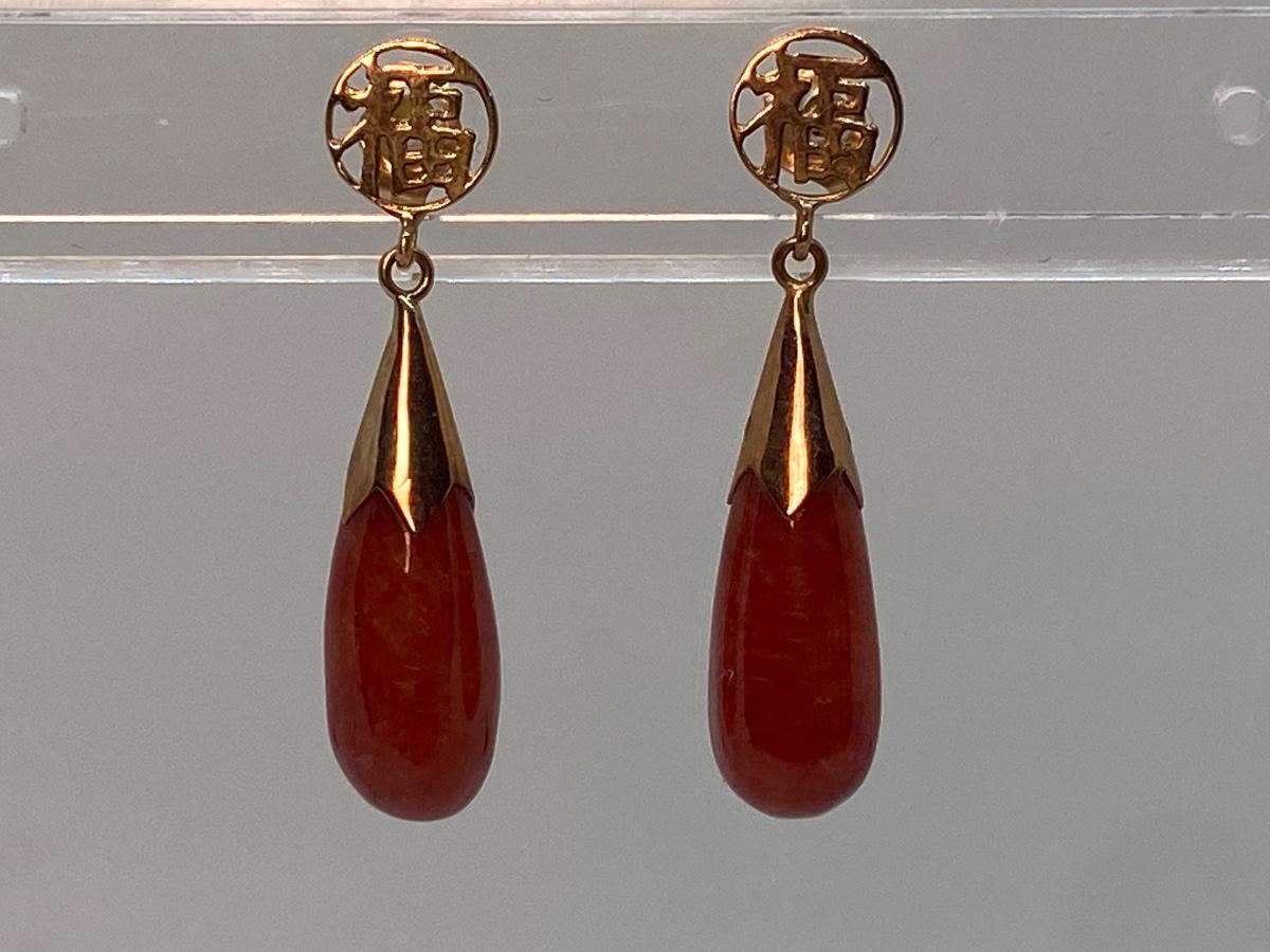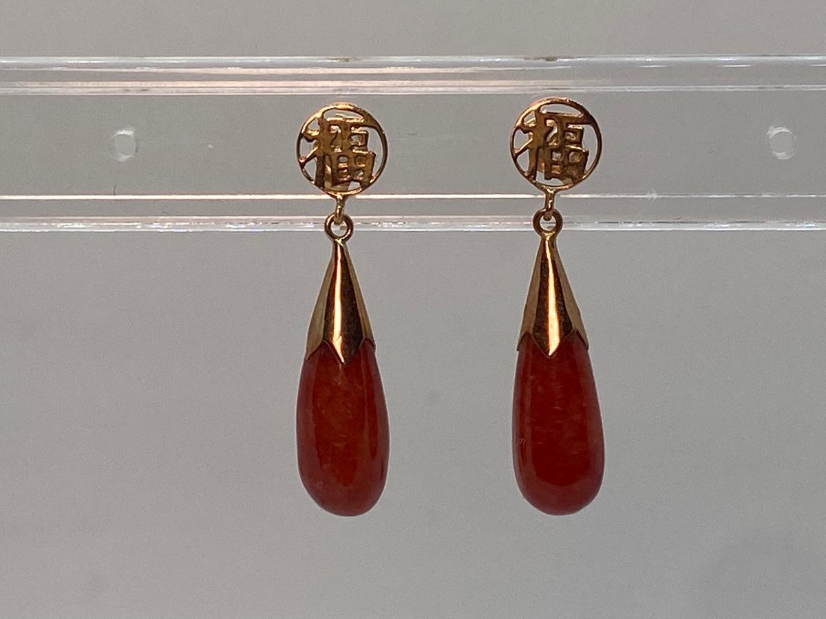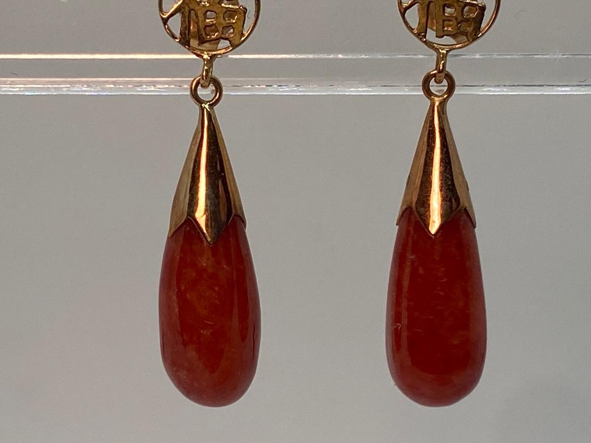 Lot 2: 14k WW Orange Jade Good Fortune Teardrop Dangle Pierced Earrings
