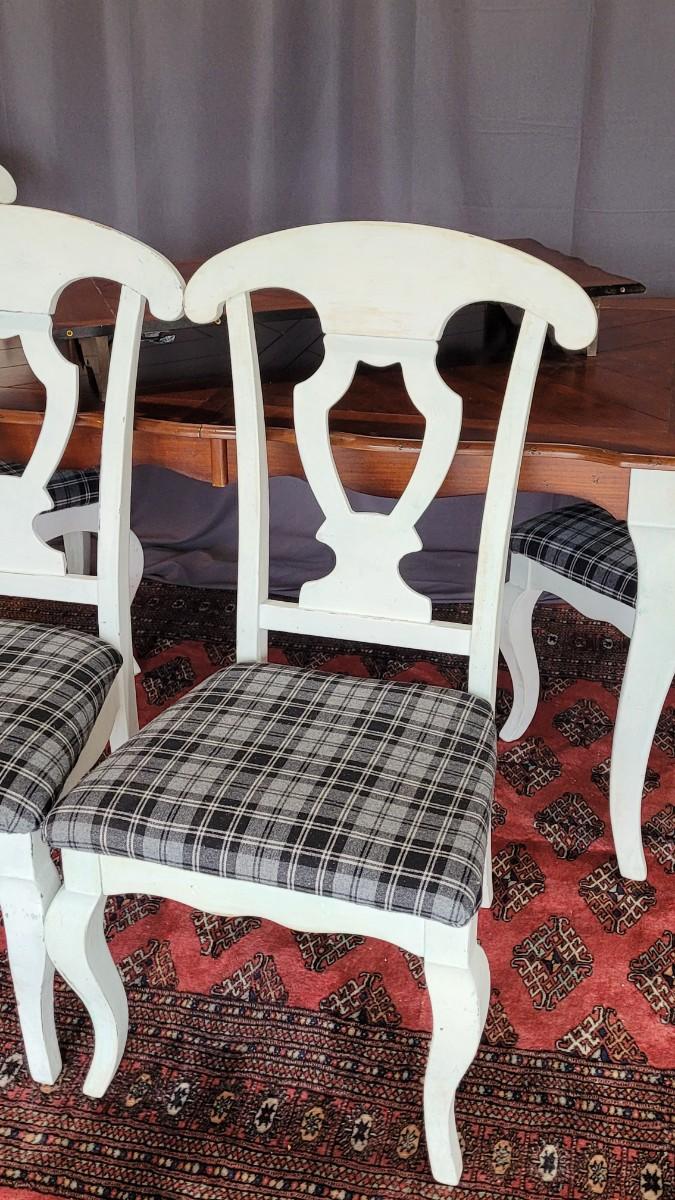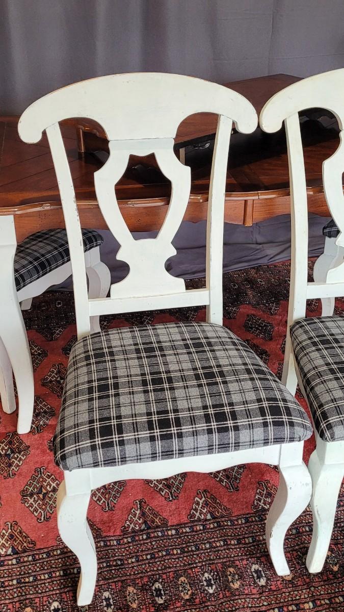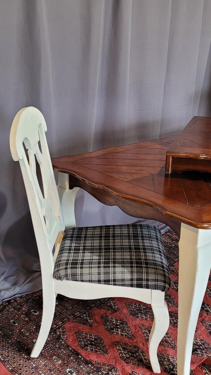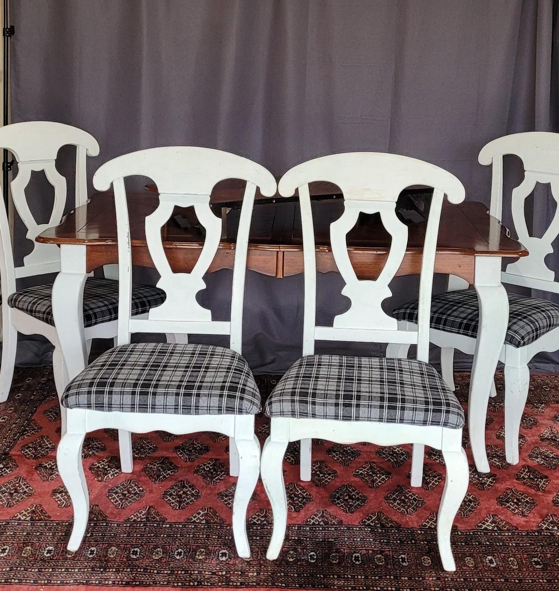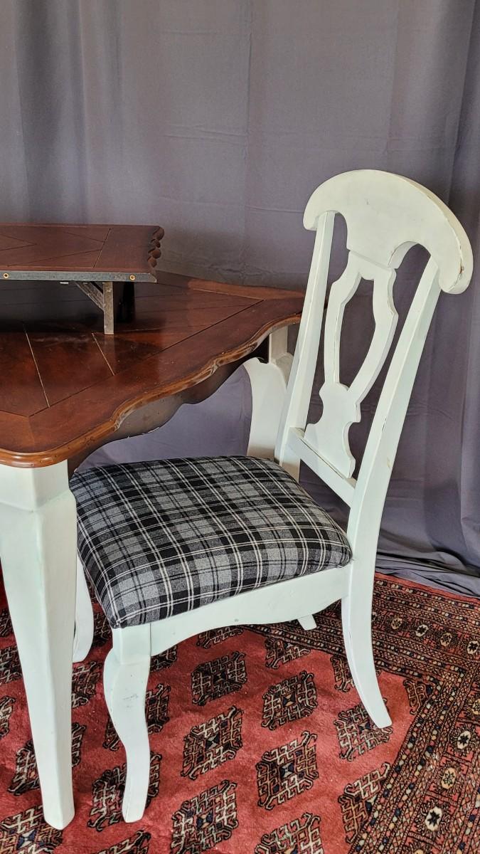 Thr table has 18" additional leaf. The four chair Cushions are covered with Gray/white Wool Plaid. Table top has a white spot, appears to be a heat spot where the clear coat heated up a bit. Nice refurbished condition.