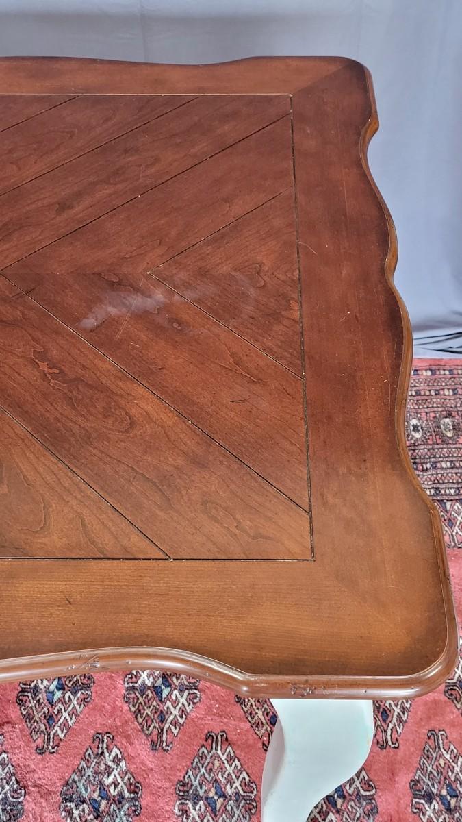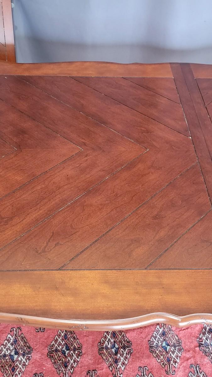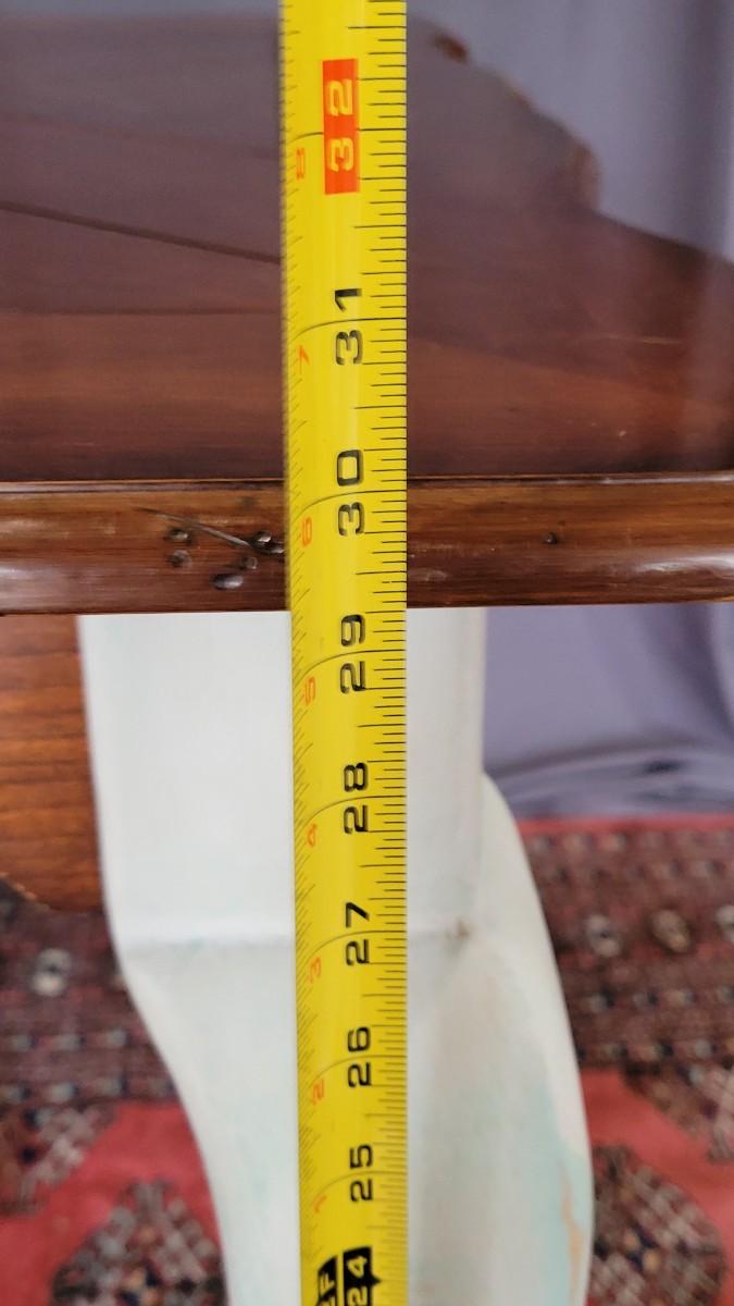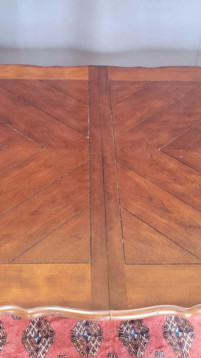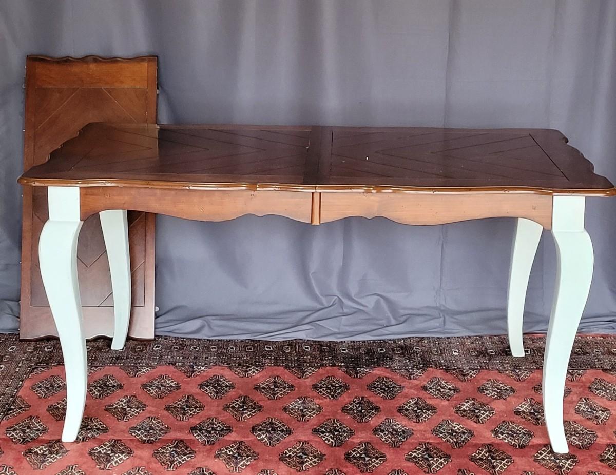 Thr table has 18" additional leaf. The four chair Cushions are covered with Gray/white Wool Plaid. Table top has a white spot, appears to be a heat spot where the clear coat heated up a bit. Nice refurbished condition.