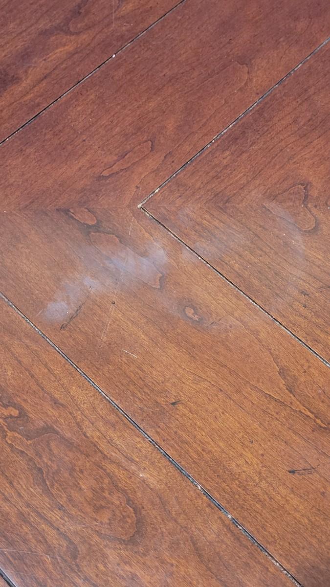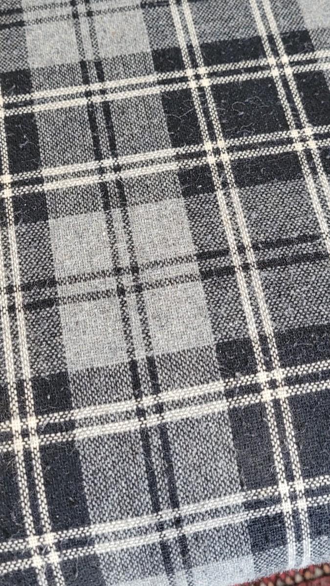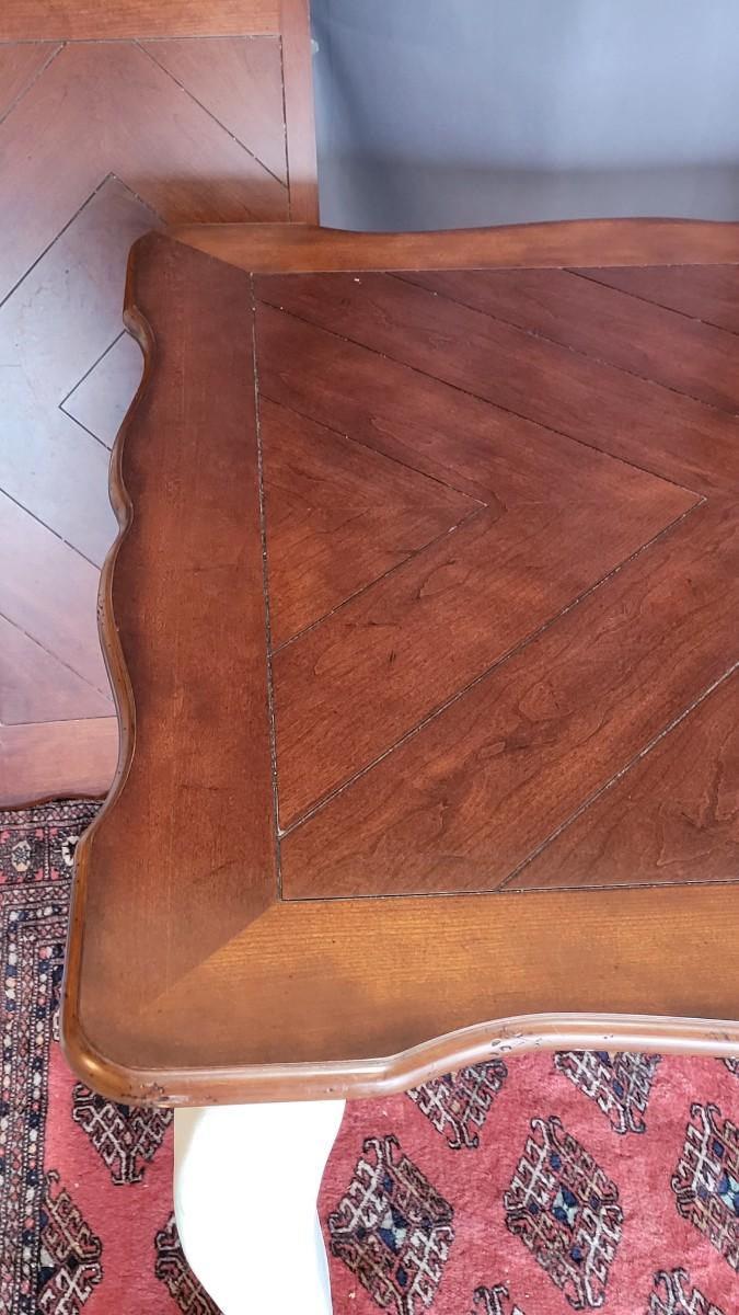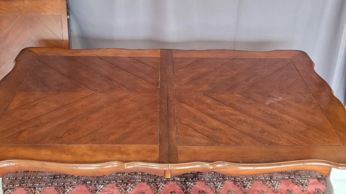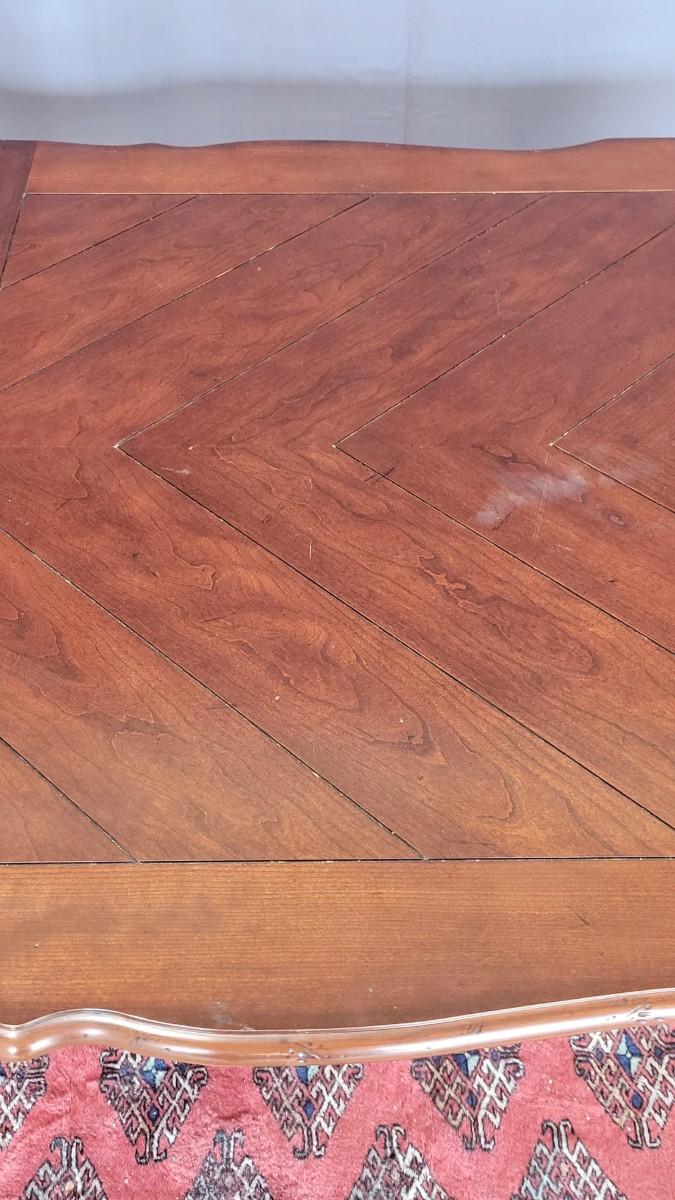 Thr table has 18" additional leaf. The four chair Cushions are covered with Gray/white Wool Plaid. Table top has a white spot, appears to be a heat spot where the clear coat heated up a bit. Nice refurbished condition.
