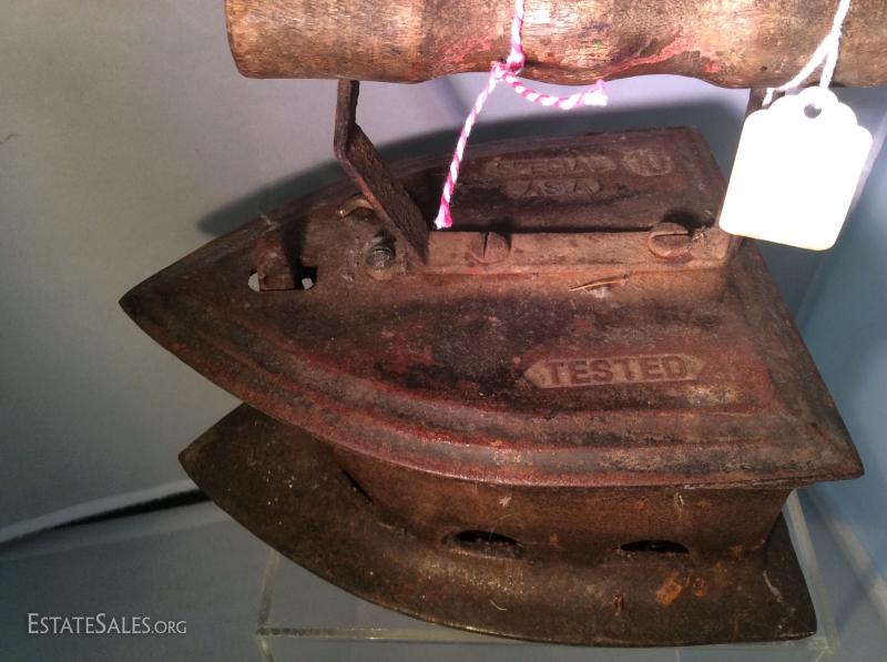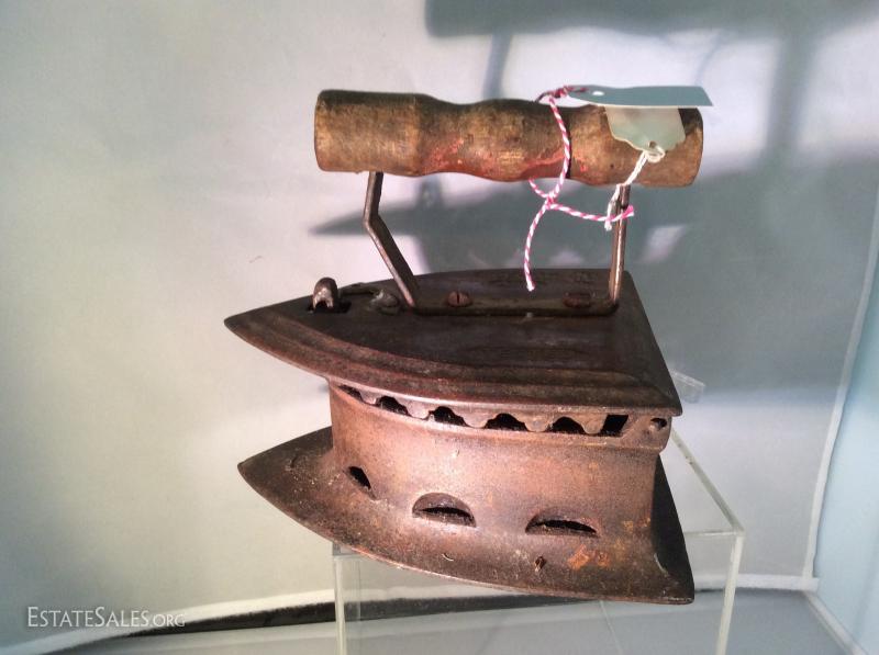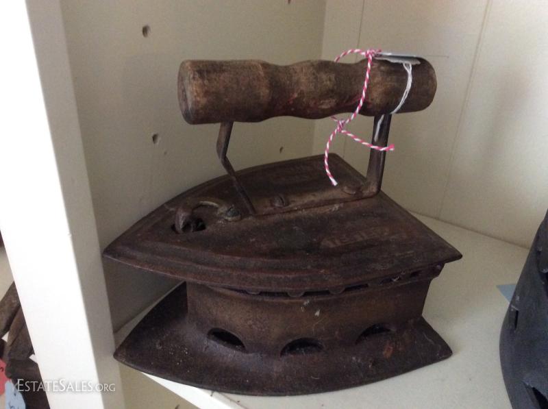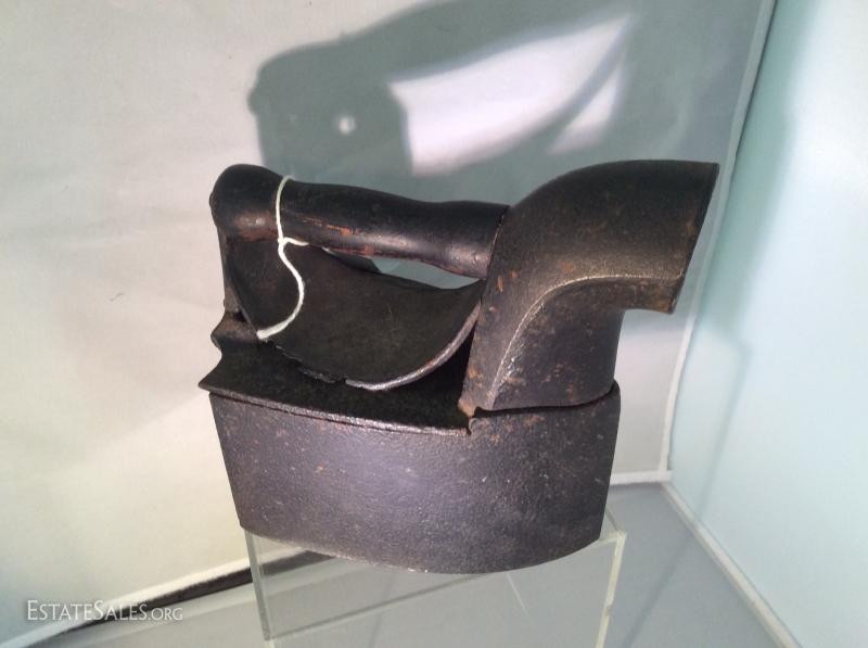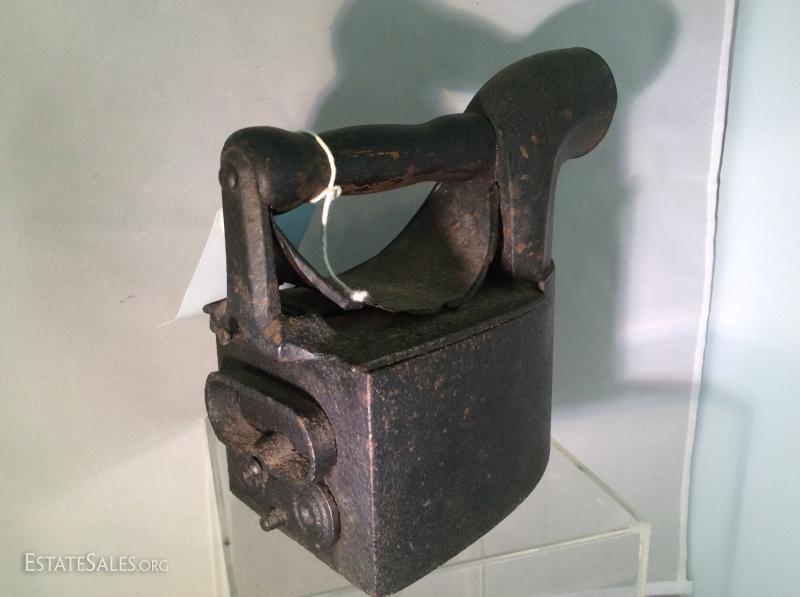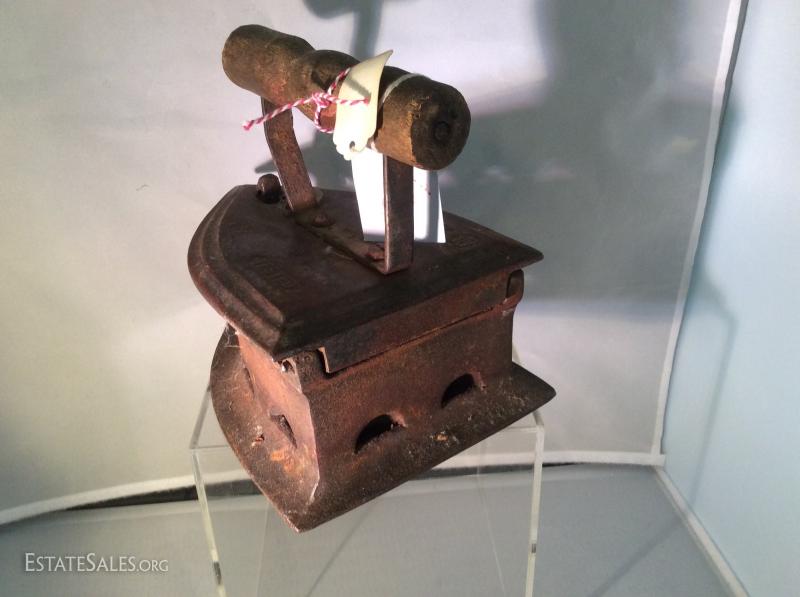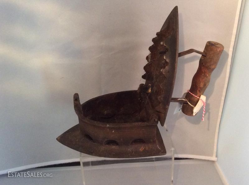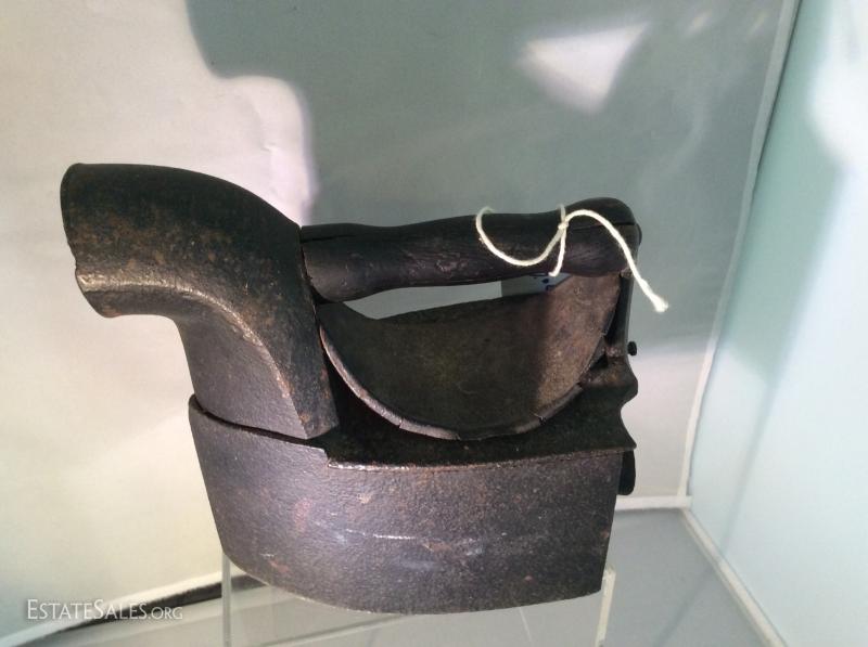 Lot 2 A consist of two irons from our past. I choose two irons from owners collection I particularly are infatuated with. 1) is a Coal Iron, marked "Special" "Asia" "10". Cast iron with a wooden handle. 2) is a "Sad Iron". I do not know how it works but I love the vent/spout on the front. There is some minor wear and tare on the handle.