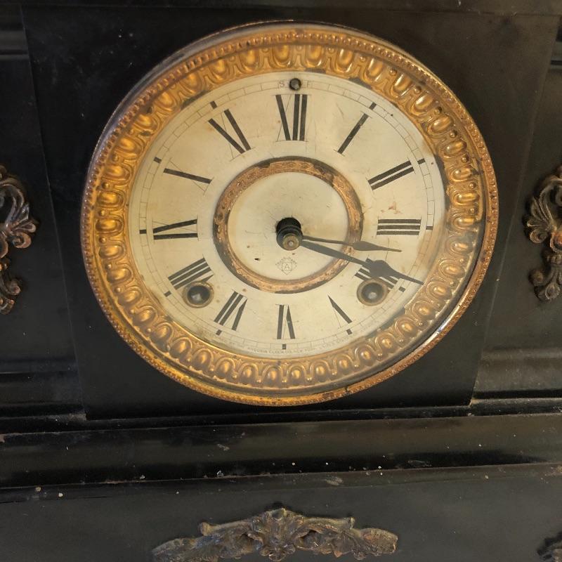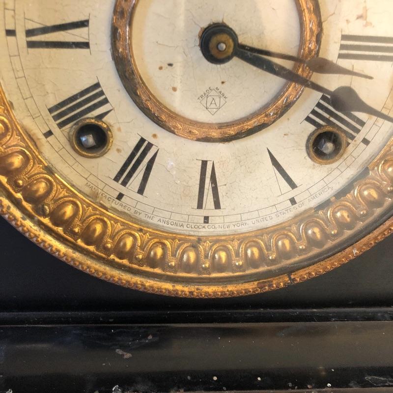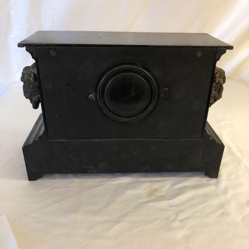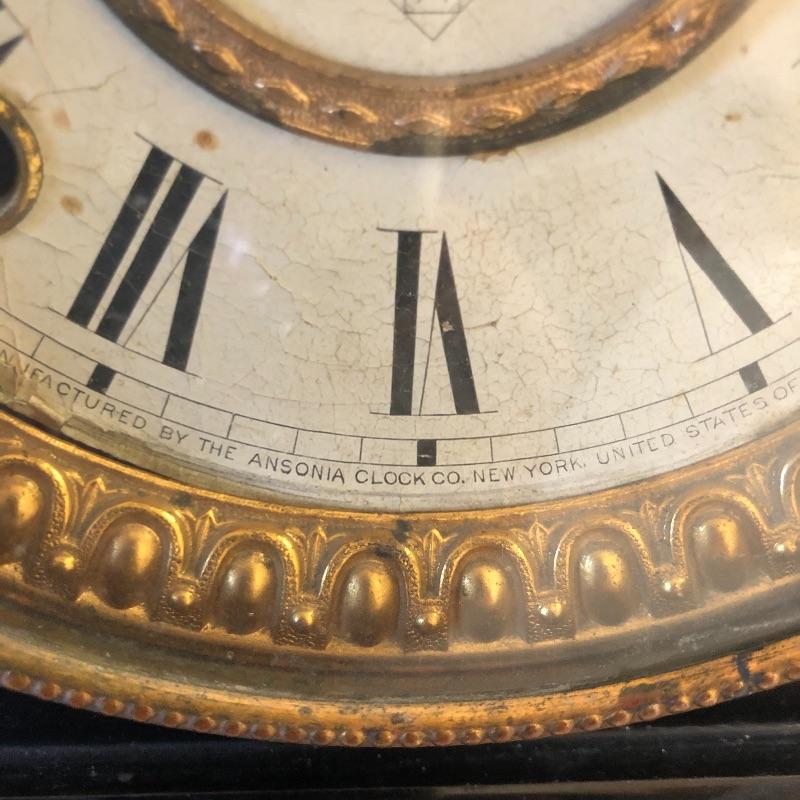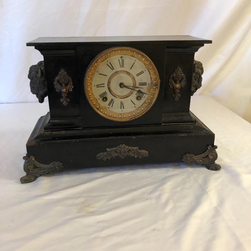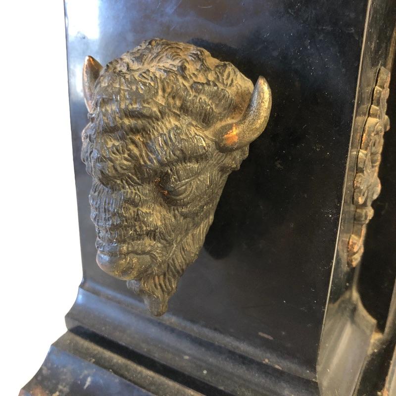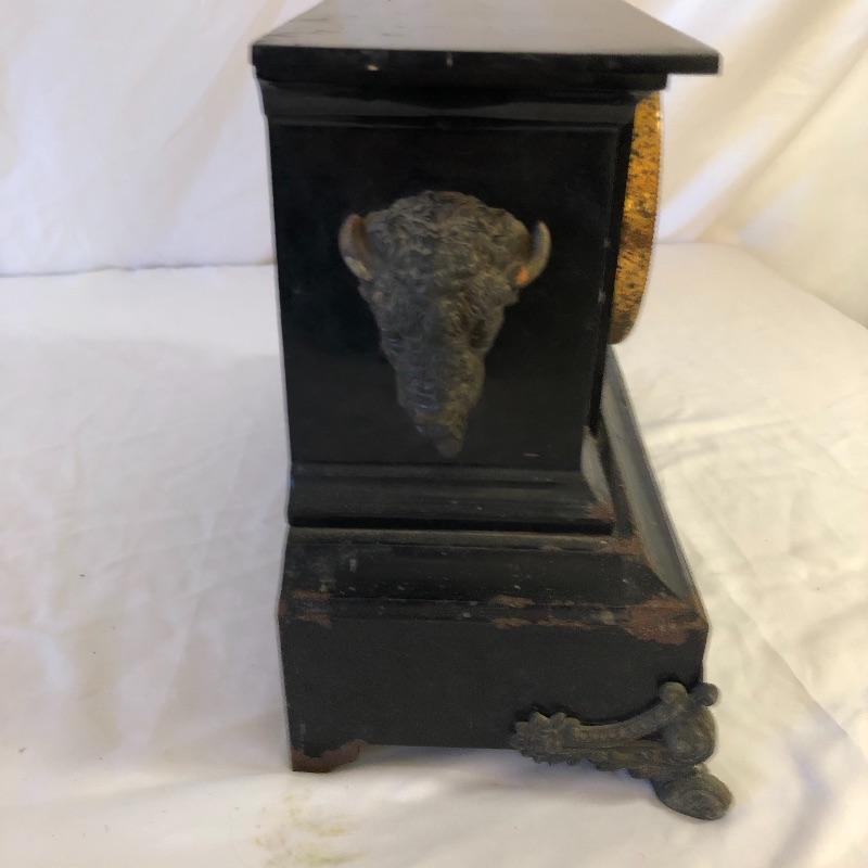 This classic styled Ansonia black metal mantle clock is adorned with Buffalo heads on the side. Feet and adornments appear to be painted copper, see pictures. Clock has key and worked when tested. Clock measures 6.5” x 16.25” x 10.5”.
