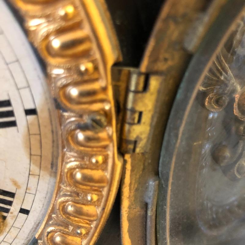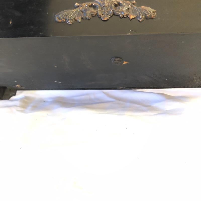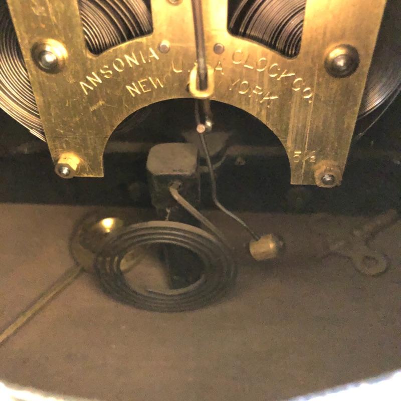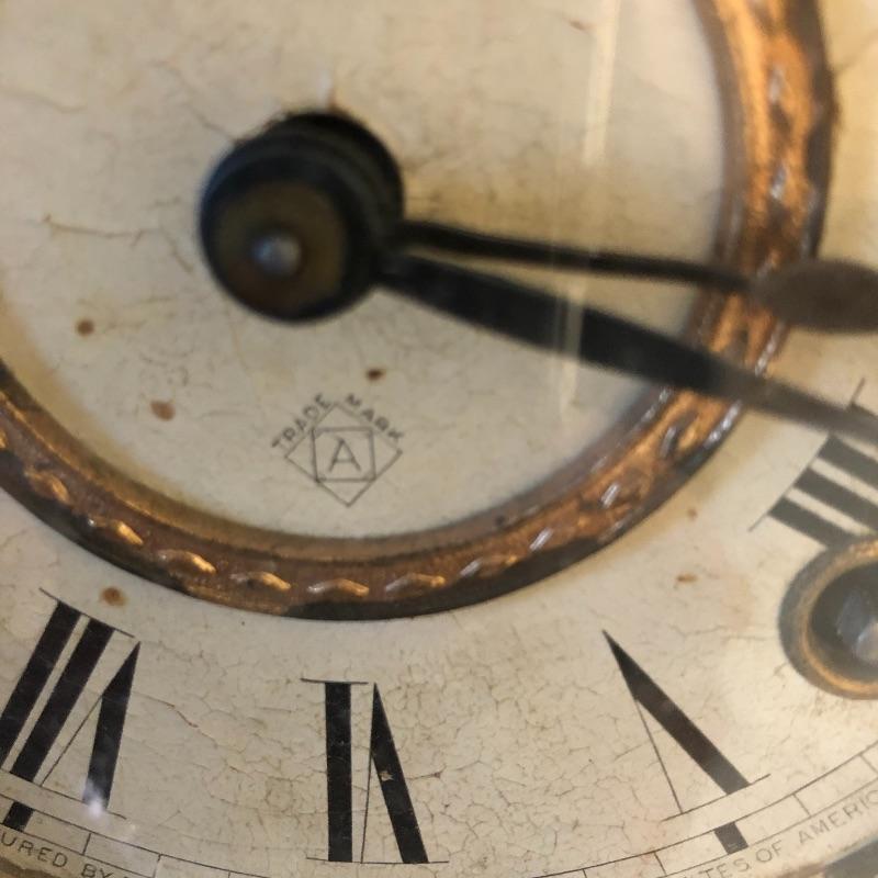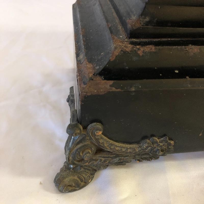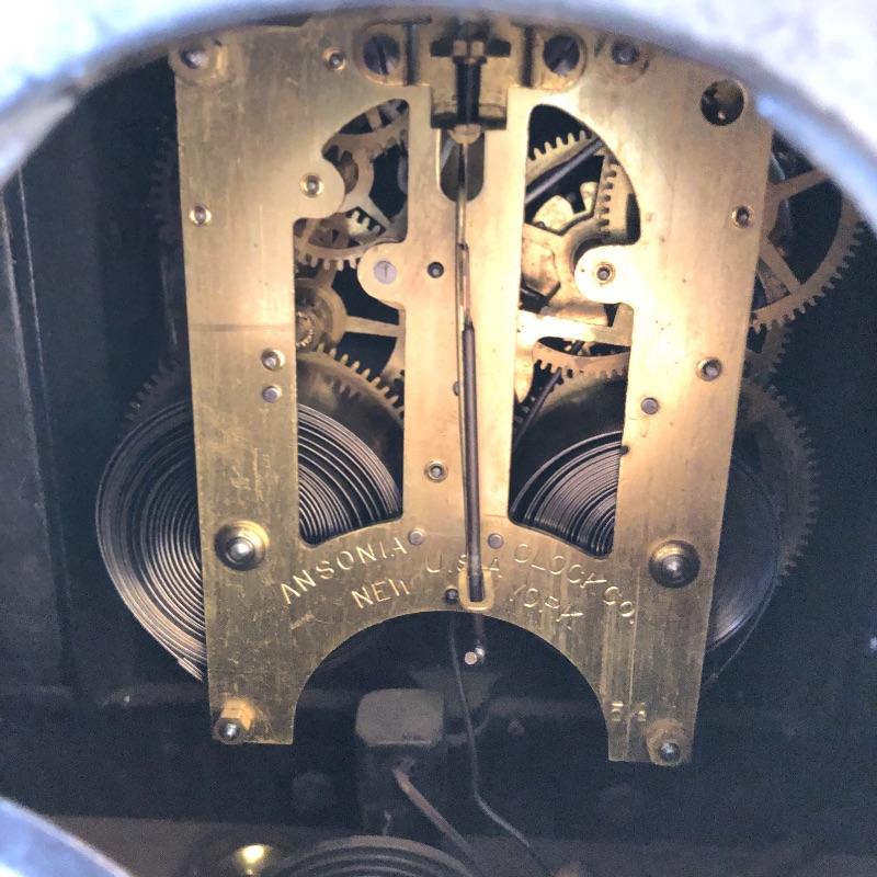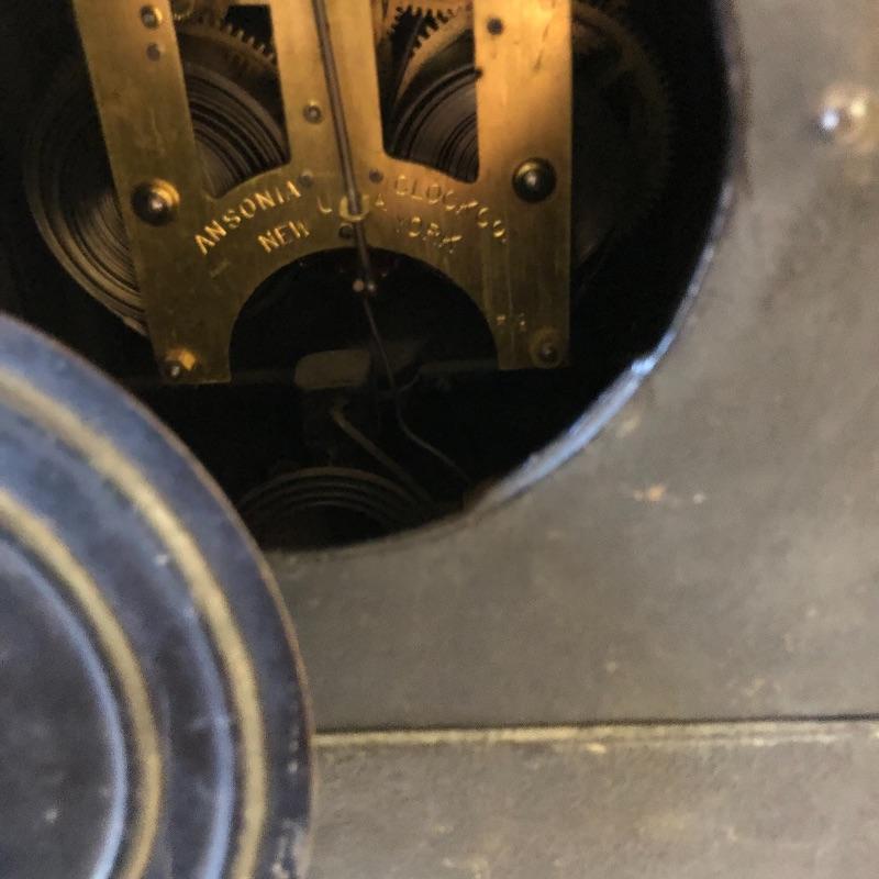 This classic styled Ansonia black metal mantle clock is adorned with Buffalo heads on the side. Feet and adornments appear to be painted copper, see pictures. Clock has key and worked when tested. Clock measures 6.5” x 16.25” x 10.5”.