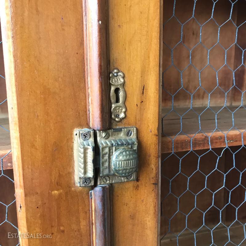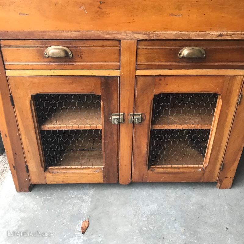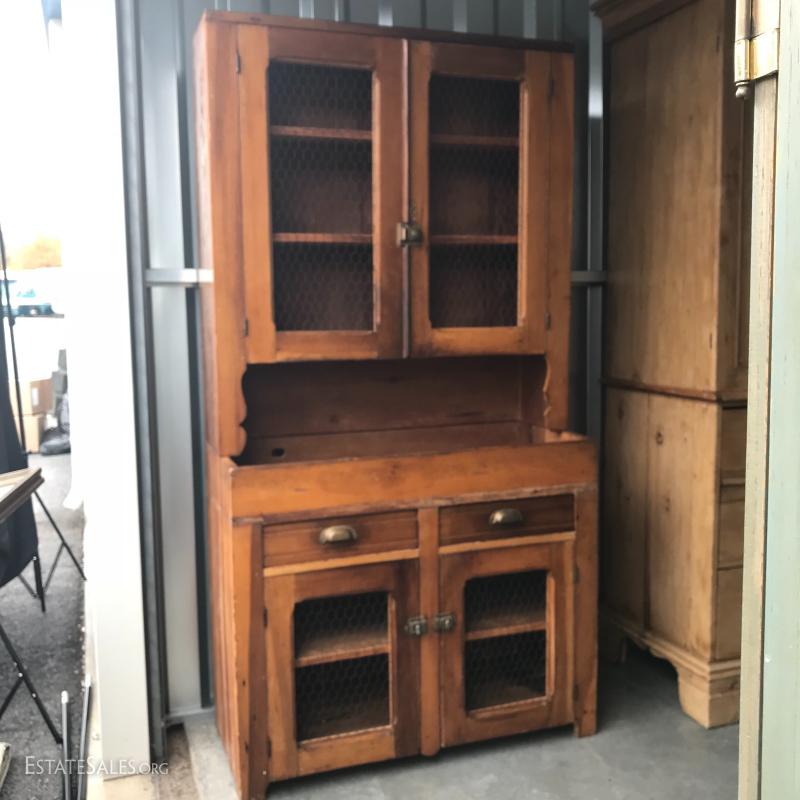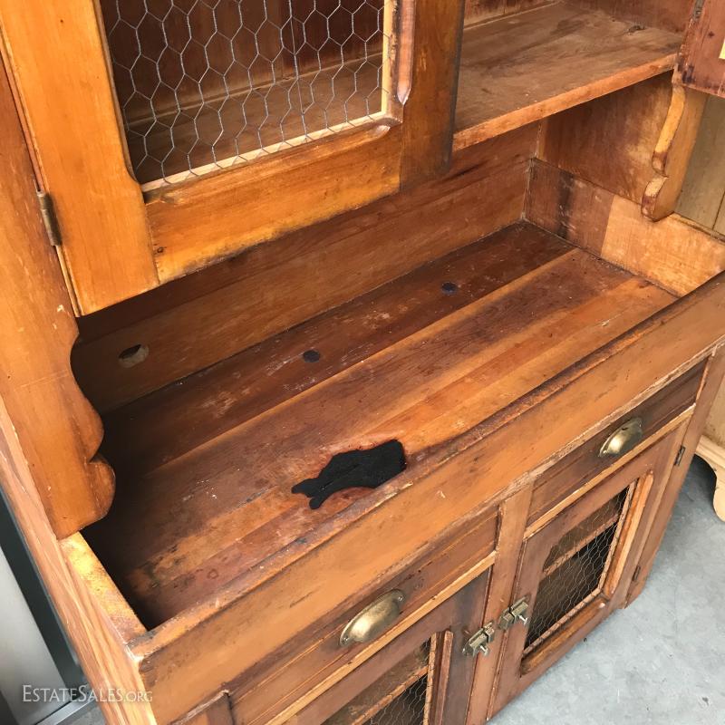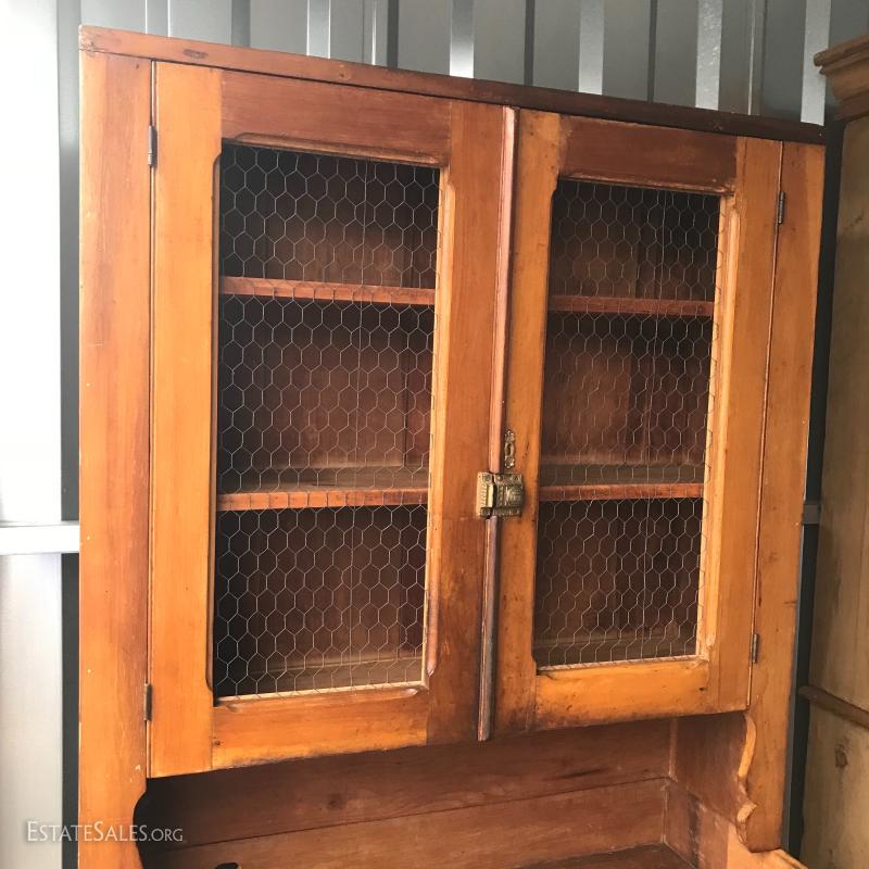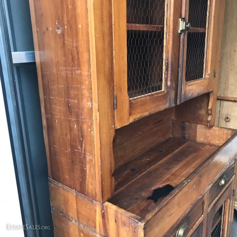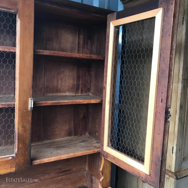 2-piece rustic wood cabinet with chicken wire covering on cabinet faces. Measures 41” x 19.5” x 78.5”. Bottom measures 41” x 19.5” x 34.5” and top is 41” x 13” x 44”. This item is available for local pick up only in Asheville, NC.