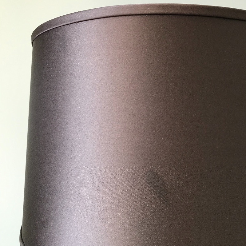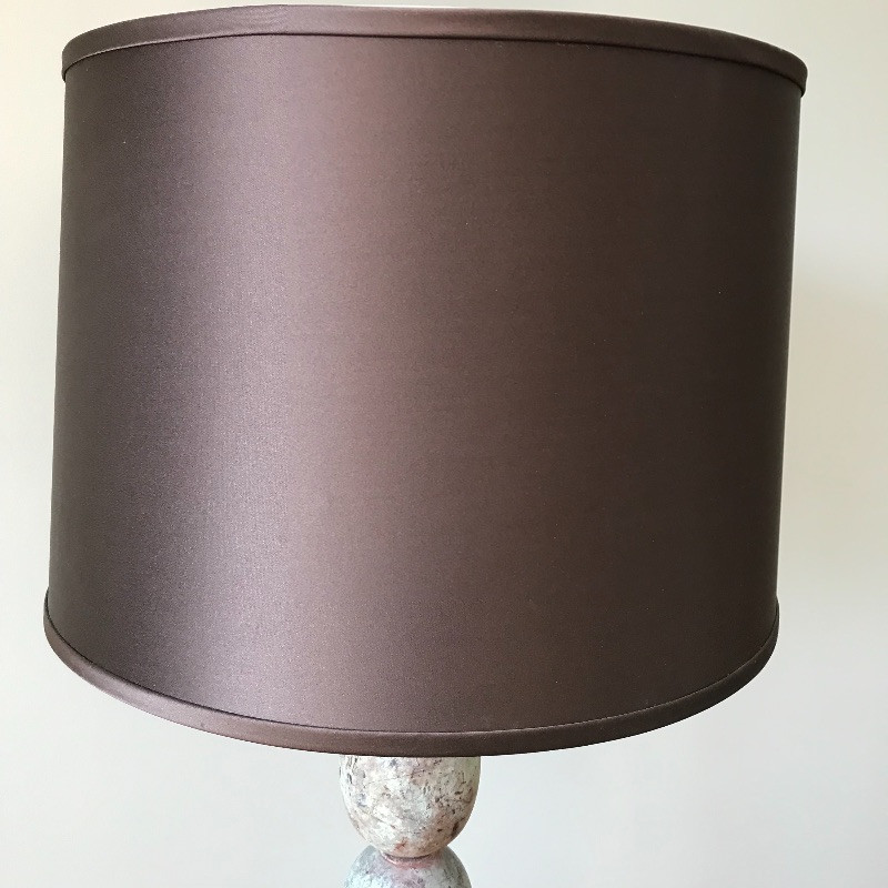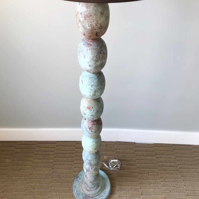 This beautiful metal art piece is a statement for any room. The base looks like rocks in a weathered blueish copper color with a brown satin shade. Shade has two small stains on it but in good condition otherwise, see images. Lamp stands 67.5” tall. Shade is 17” diameter. Lamp has a mate that is a bit taller and more brown in Lot #17.