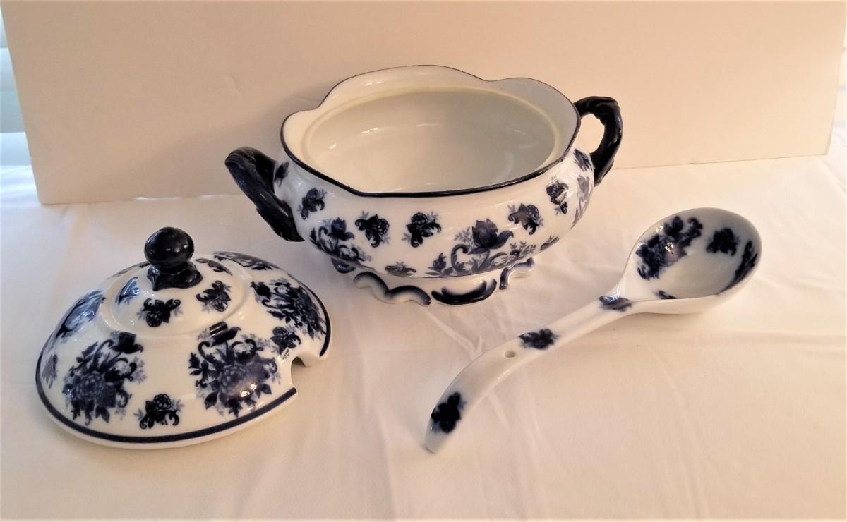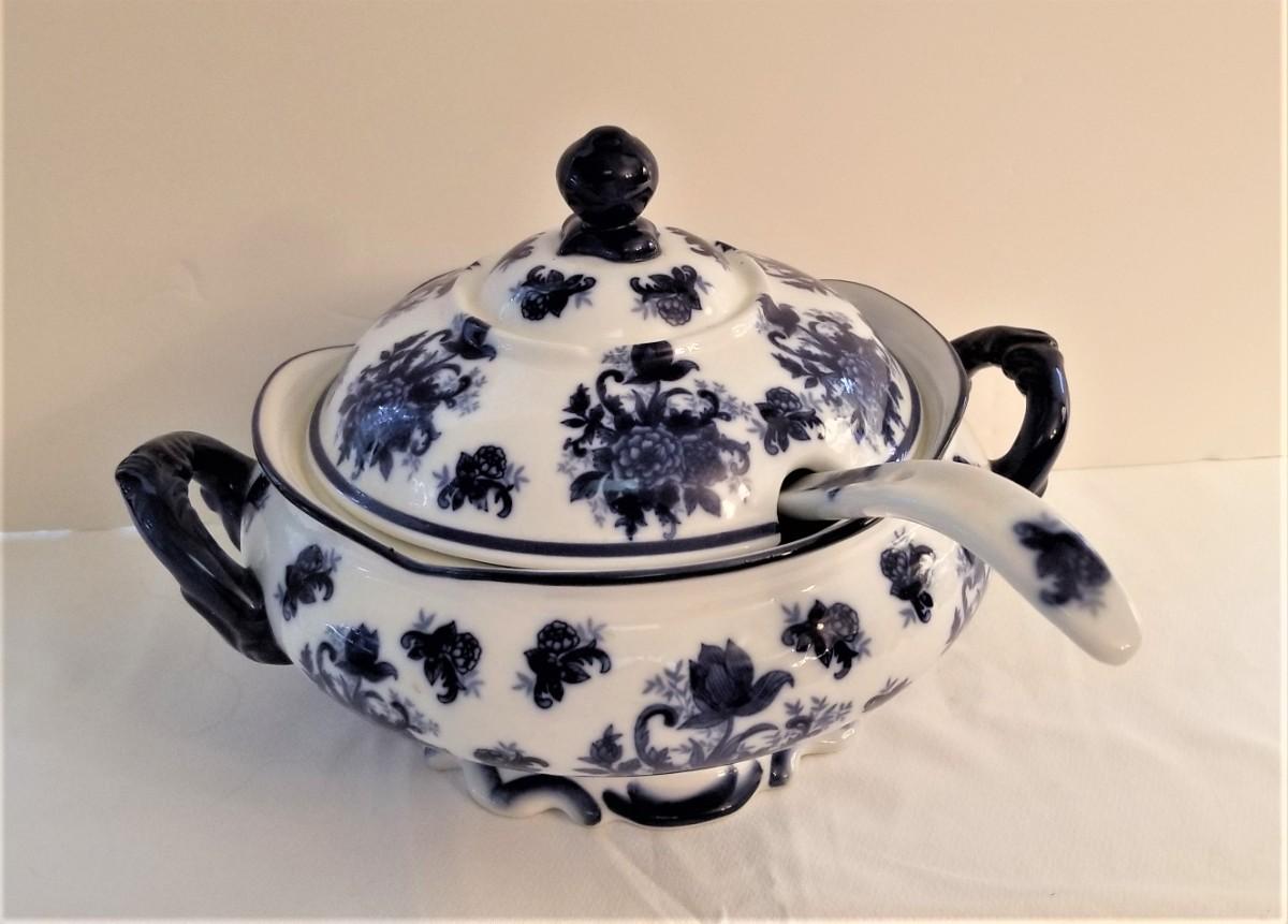 Pretty blue/white flow blue style tureen (8" tall" with ladle - ladle is 12" long. No marks. Tureen is 13" across handle to handle. Good condition.