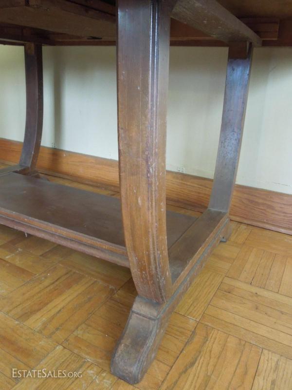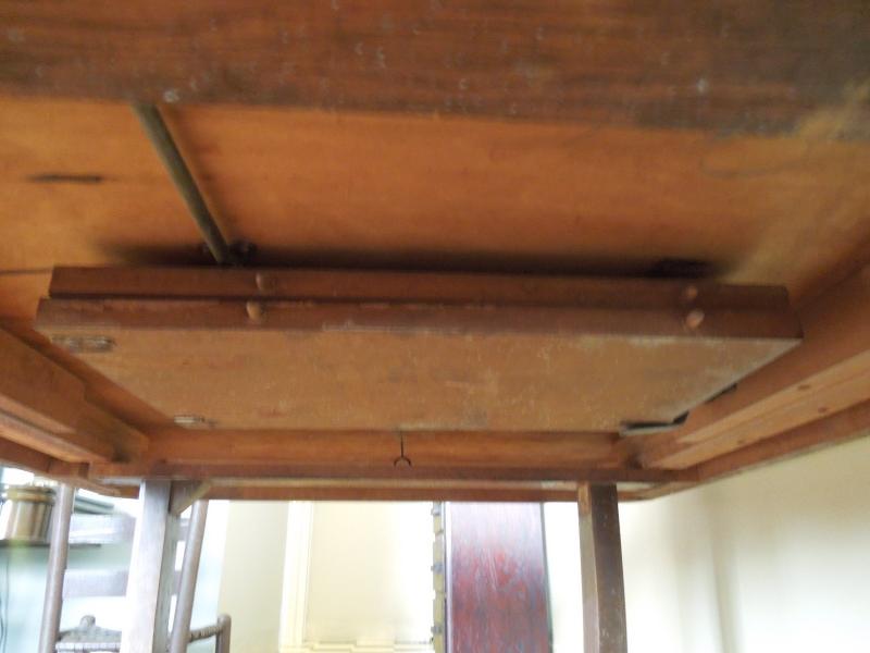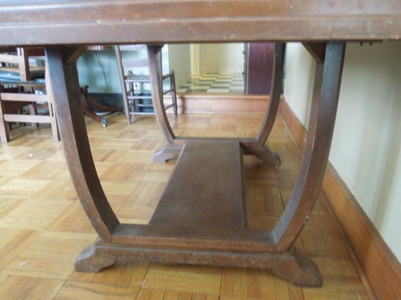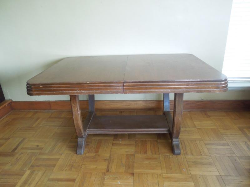 60" L x 40" W x 31" H solid wood dining table in fair condition. The table does expand. Finish is very distressed. Shelf or foot rest underneath. Extra leaf tucked underneath pops up when table is pulled apart. Unique design.