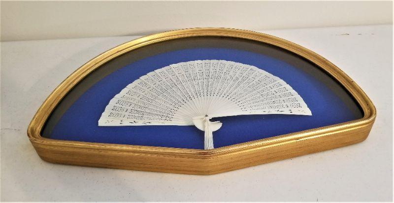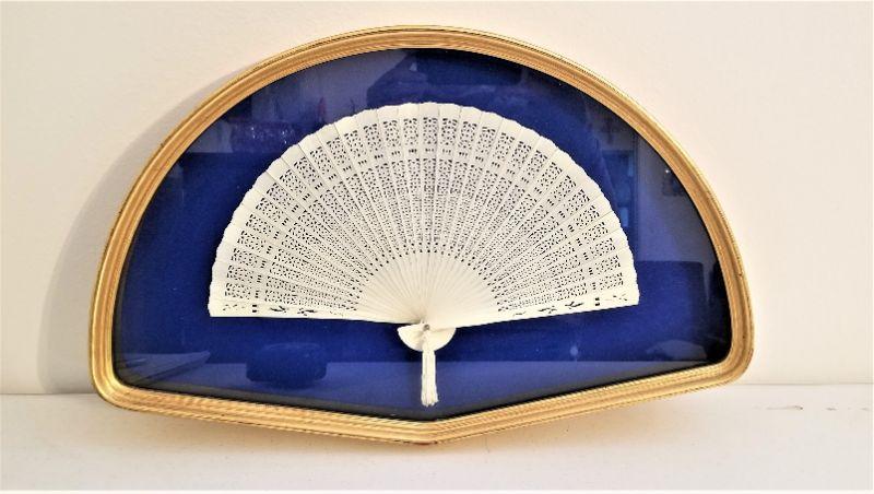 Vintage delicate celluloid or French Ivory fan in gilded fan shadow box - background is blue velvet. Good condition. Measures 20.5" x 13".