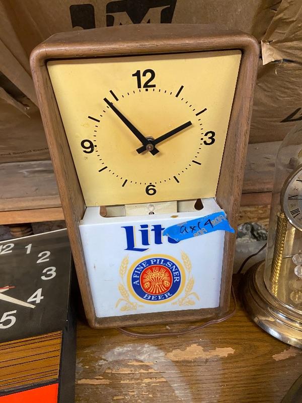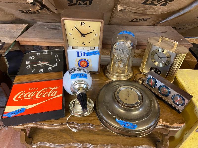 Coca Cola and beer advertising clocks, a Seiko mantle clock, a bar light, anniversary clock and more. Untested.