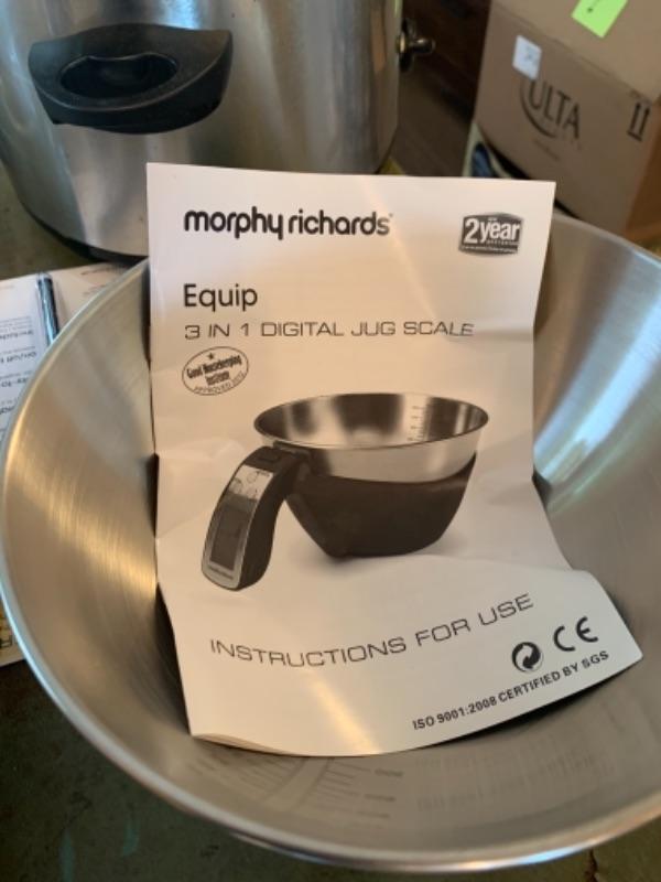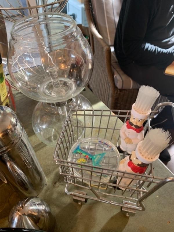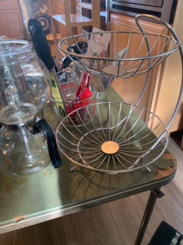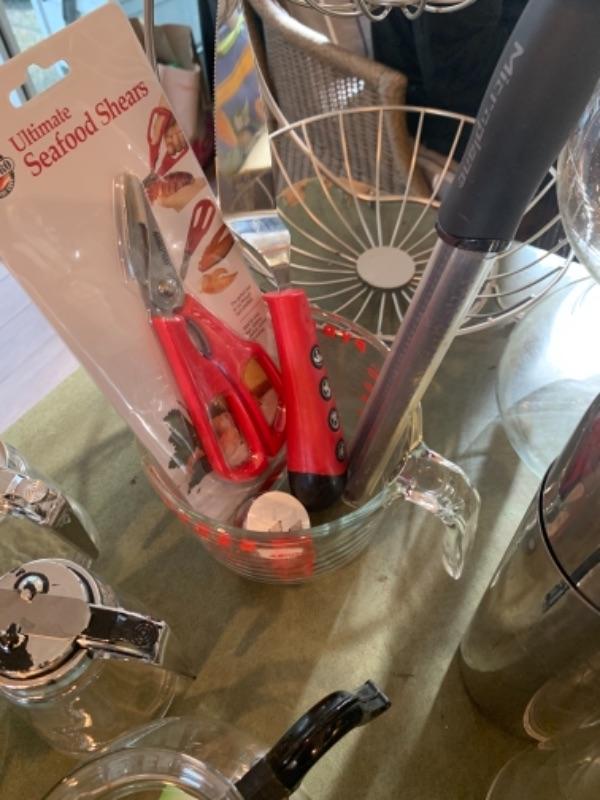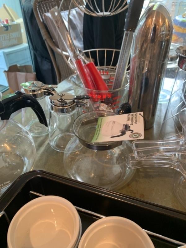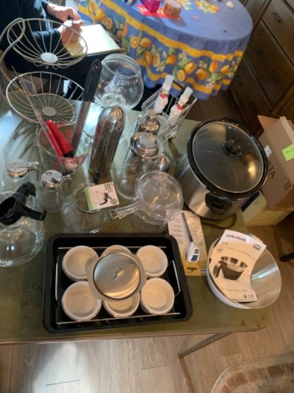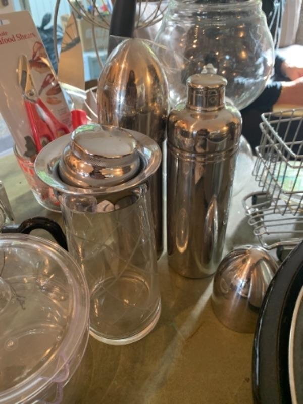 Lot 2. Cocktail shakers (metal and glass), glass coffee carafes, syrup pitchers, Hamilton Beach crock pot, Cory percolator, Morphy Richard digital scale, Ban Marie ramekin set, utensils, fruit basket, etc.-$50