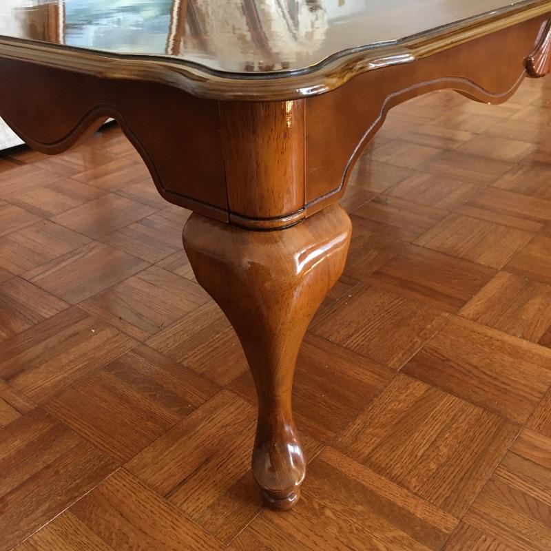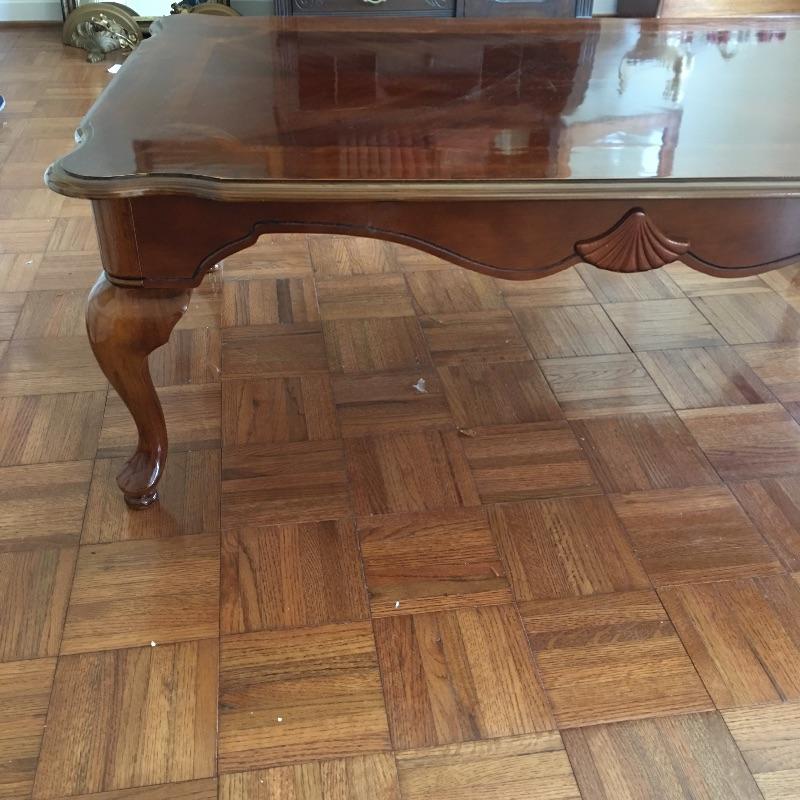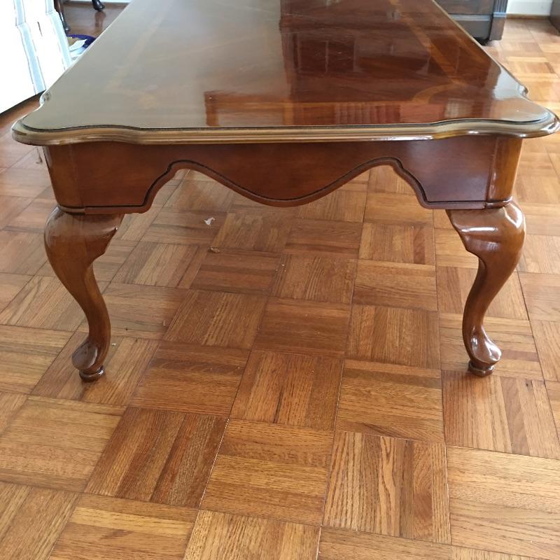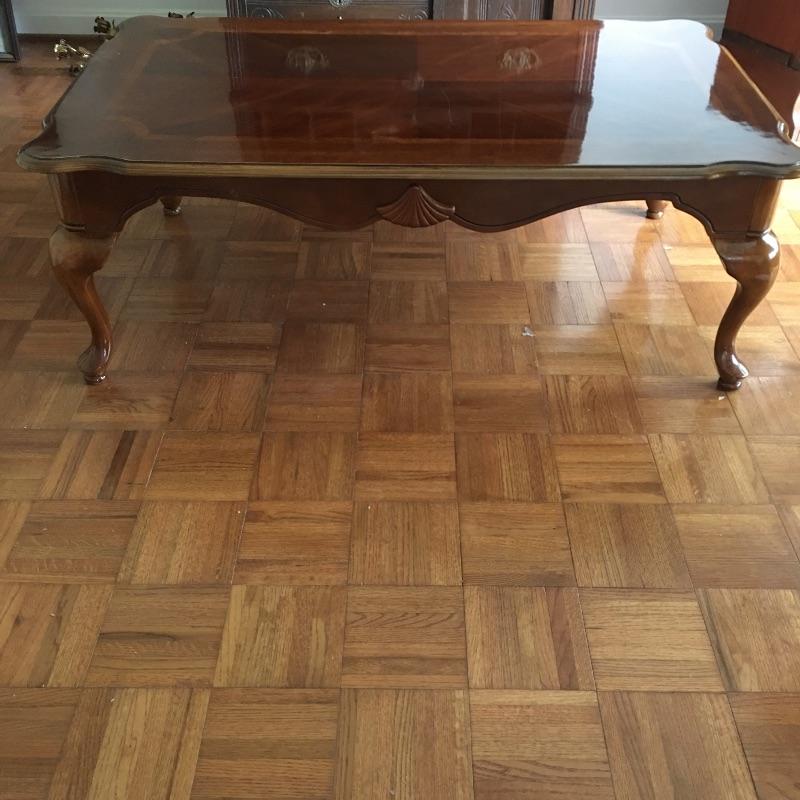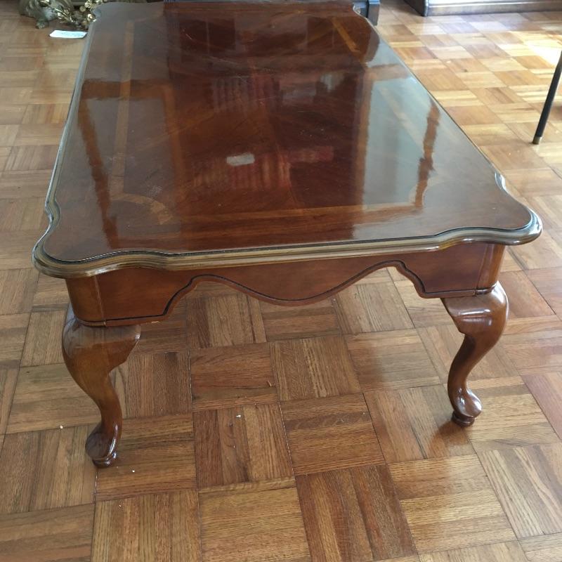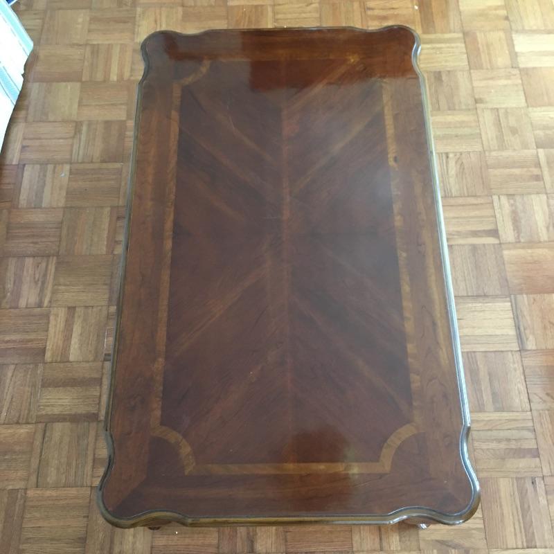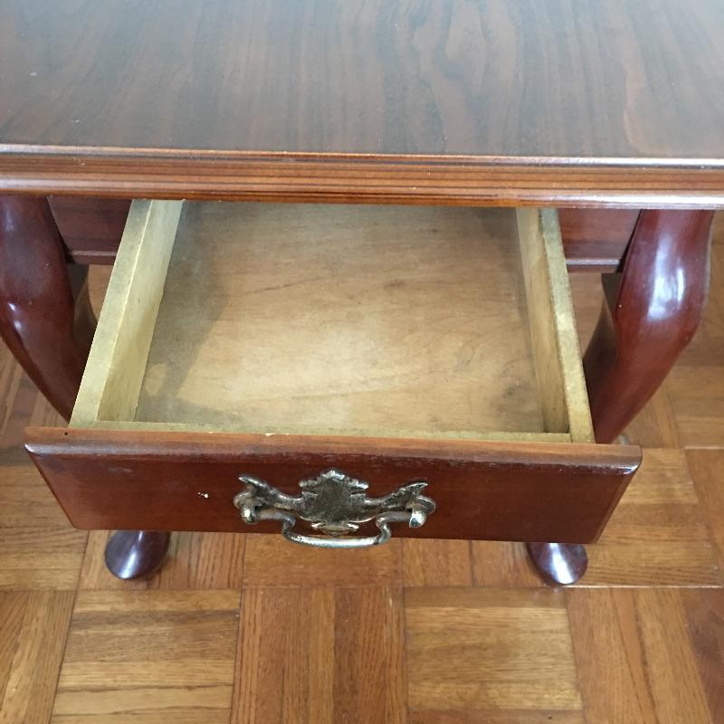 Coffee table appears to be inlaid wood on top and side table has a small drawer. Side table has a chip and a small discoloring on top and coffee table has some scratches on top, see pictures. A classic look for your living room. Coffee table measures 26.5” x 45” x 16”.