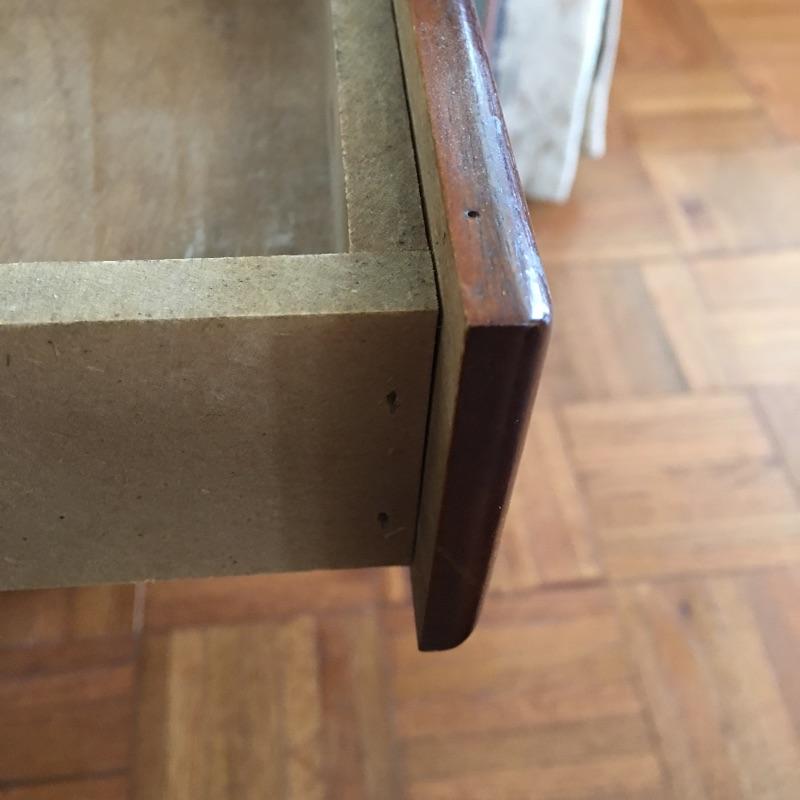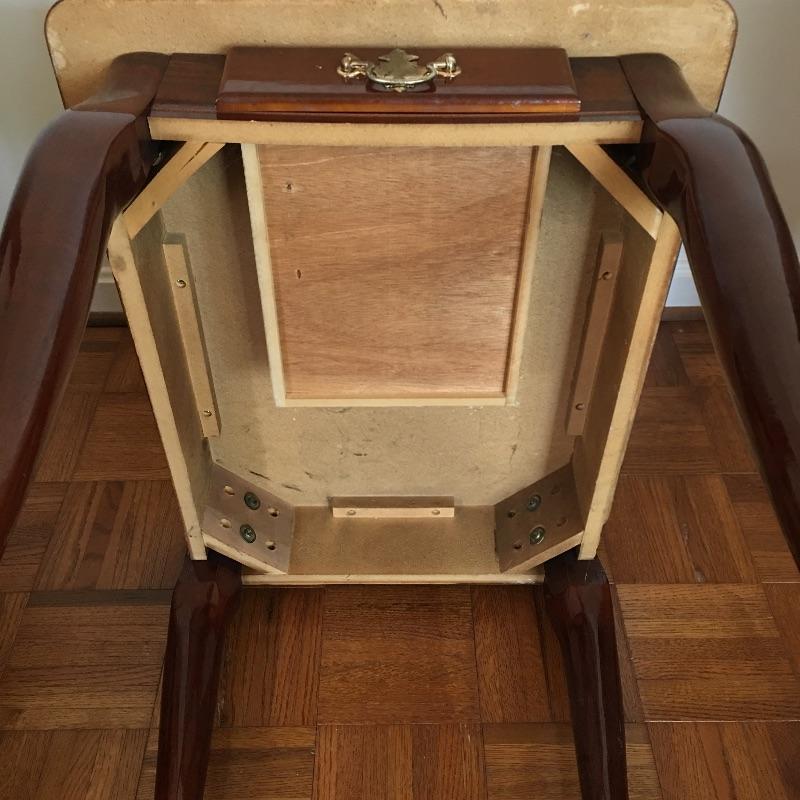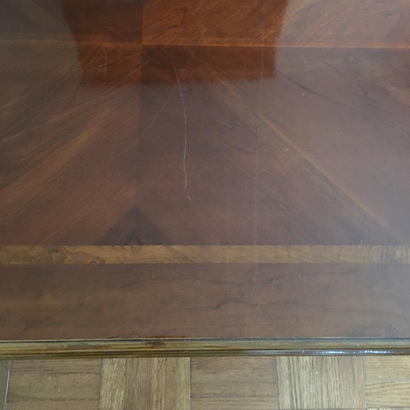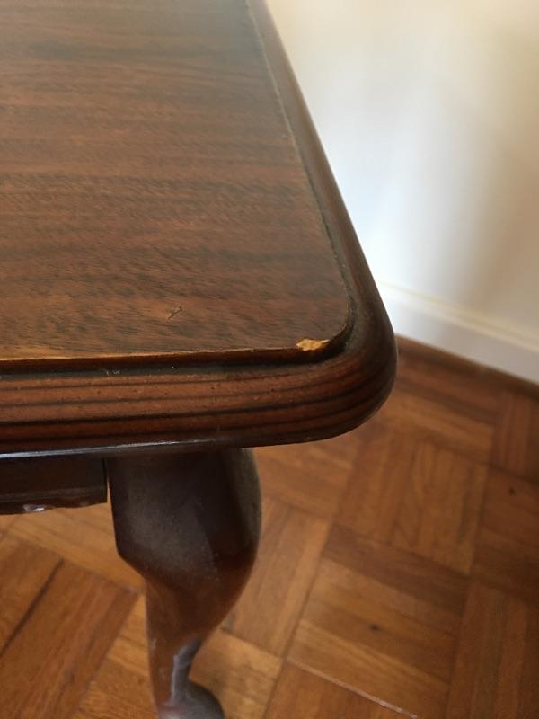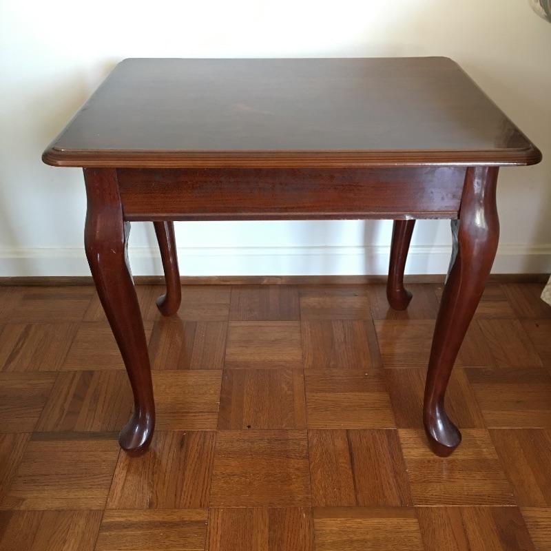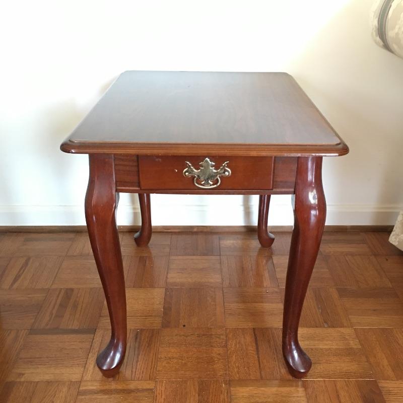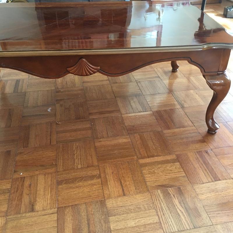 Coffee table appears to be inlaid wood on top and side table has a small drawer. Side table has a chip and a small discoloring on top and coffee table has some scratches on top, see pictures. A classic look for your living room. Coffee table measures 26.5” x 45” x 16”.