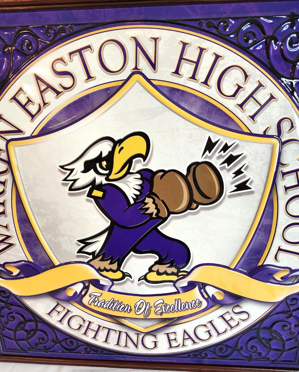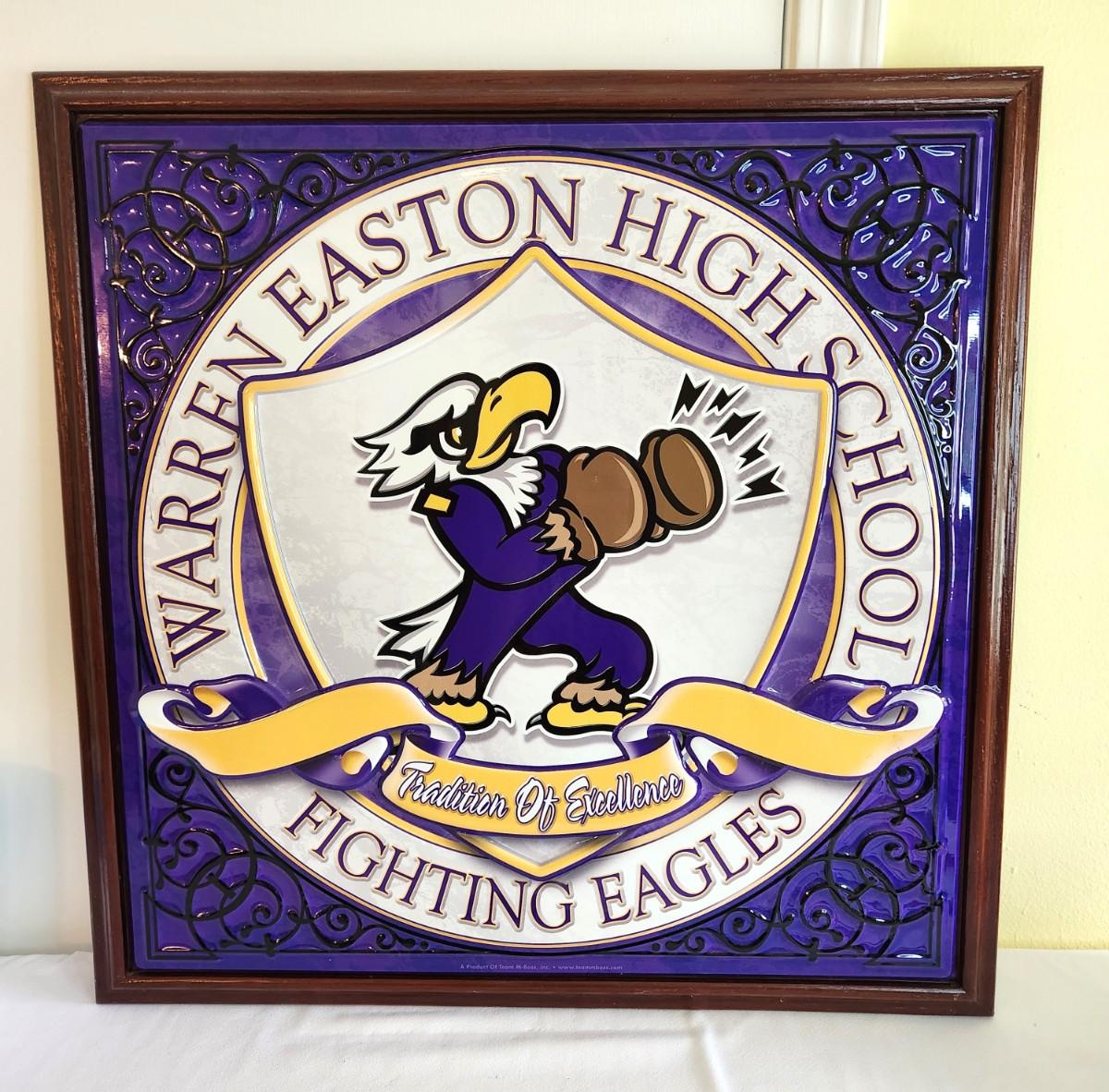 Large (26" x 26") metal embossed sign in wooden frame - Warren Easton High School Eagles - good condition.