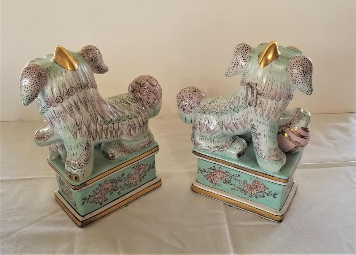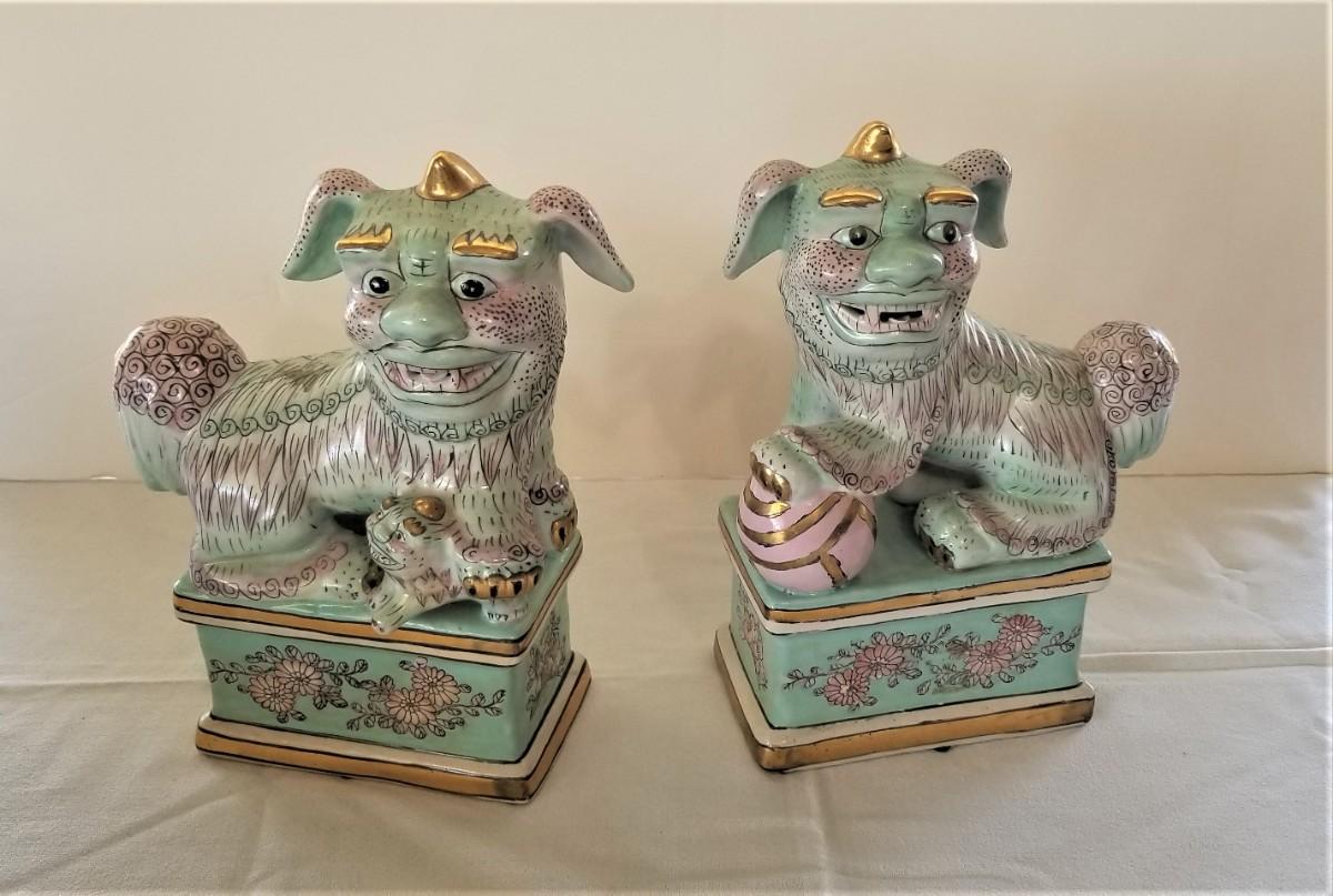 Good looking contemporary pair of Foo Lions - Asian Styling - ceramic. 5.5" across at the base, 10" tall. Good condition.