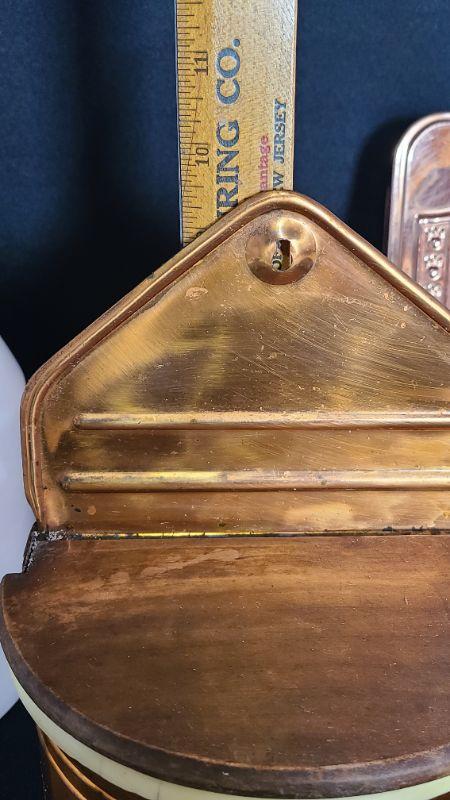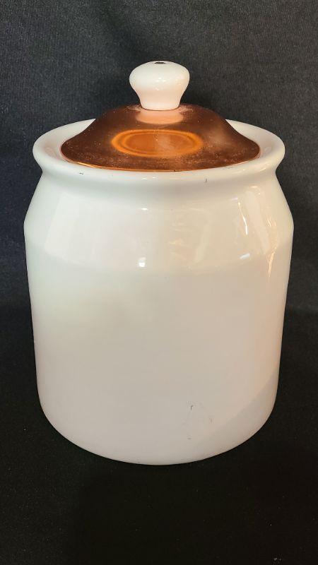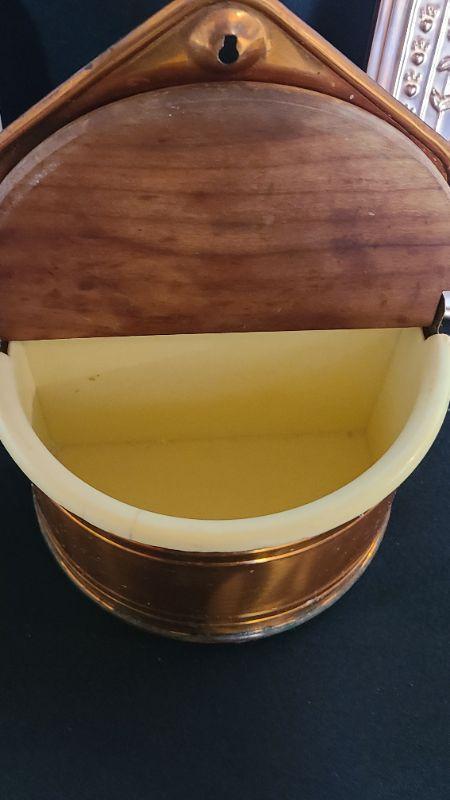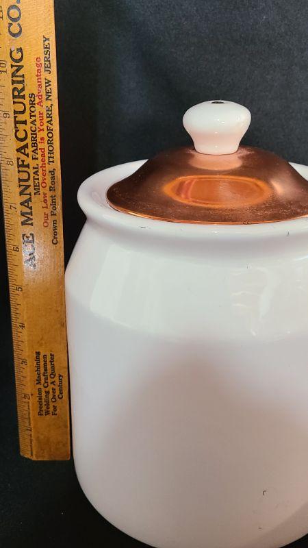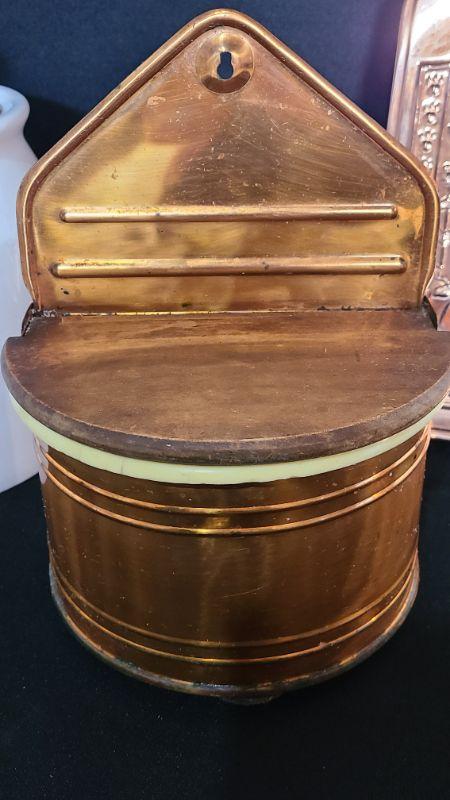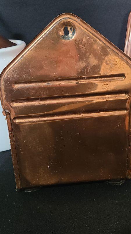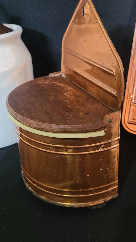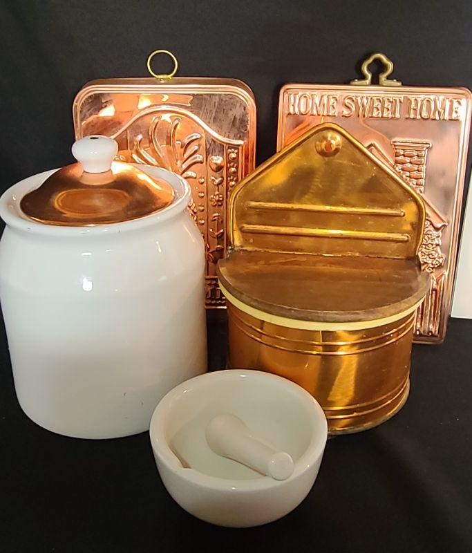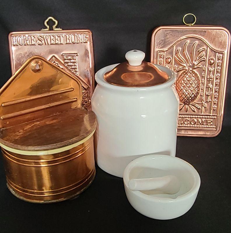 Nice lot of Copper Kitchen Ware. 9 Inch Canister, 2 wall plaques, morter/pestle, and wall well for salt/tea etc.