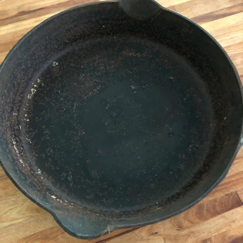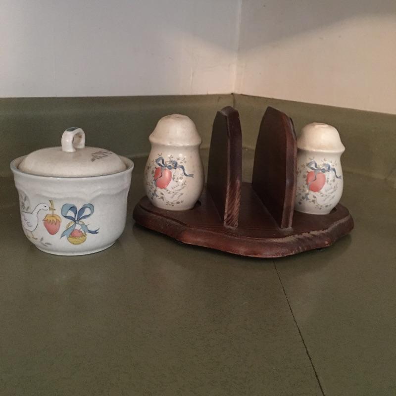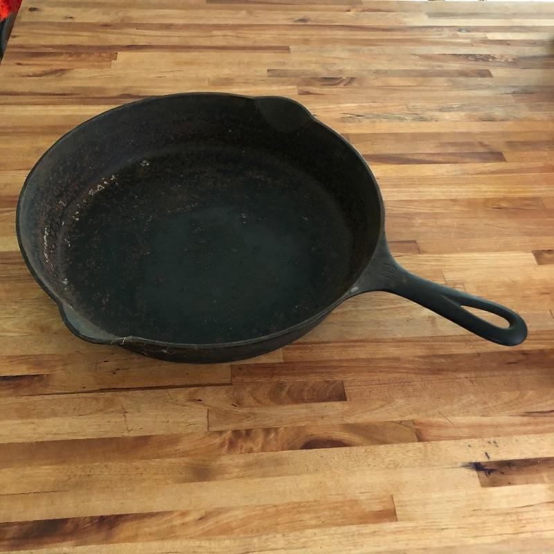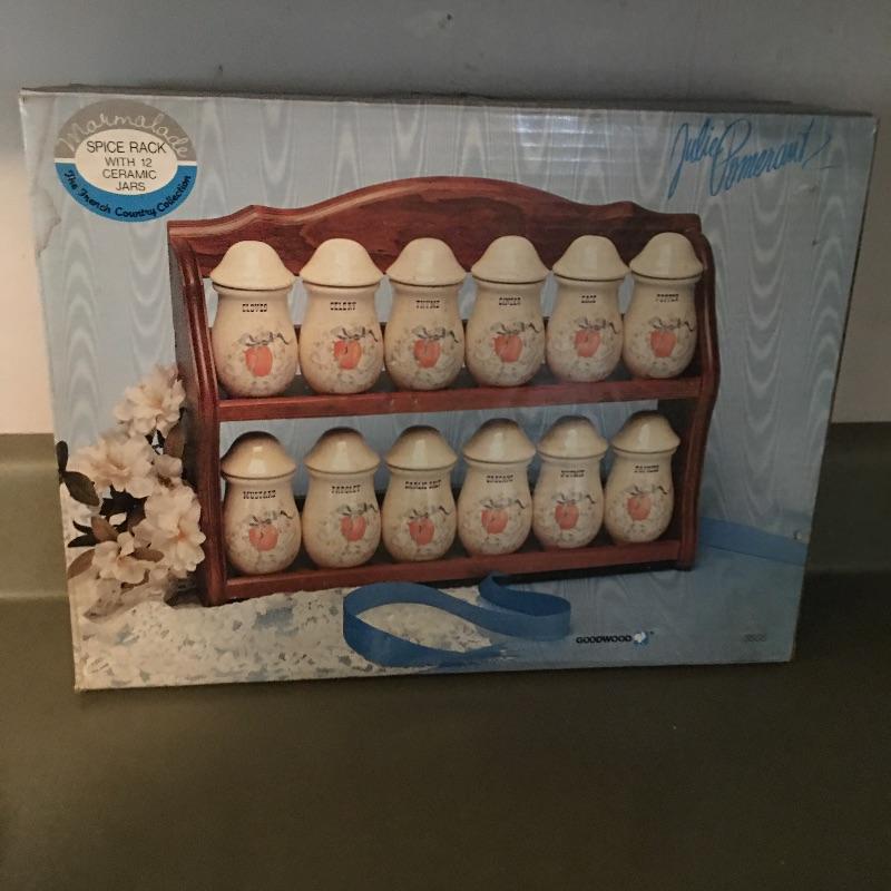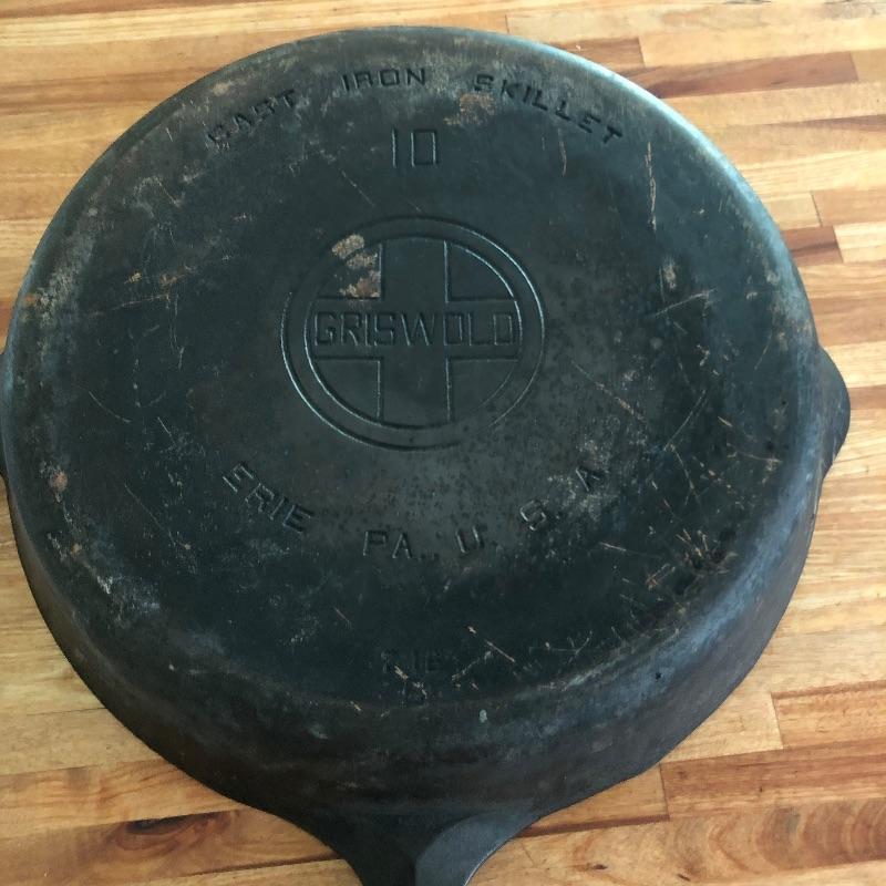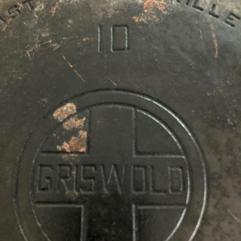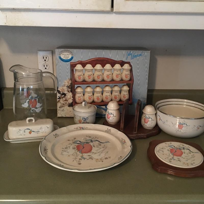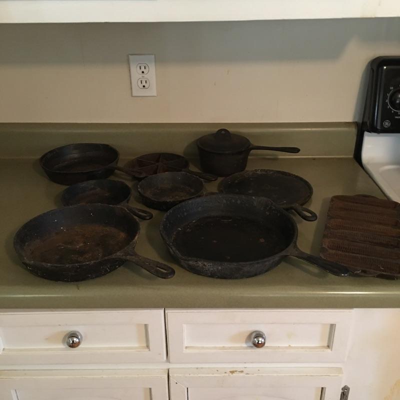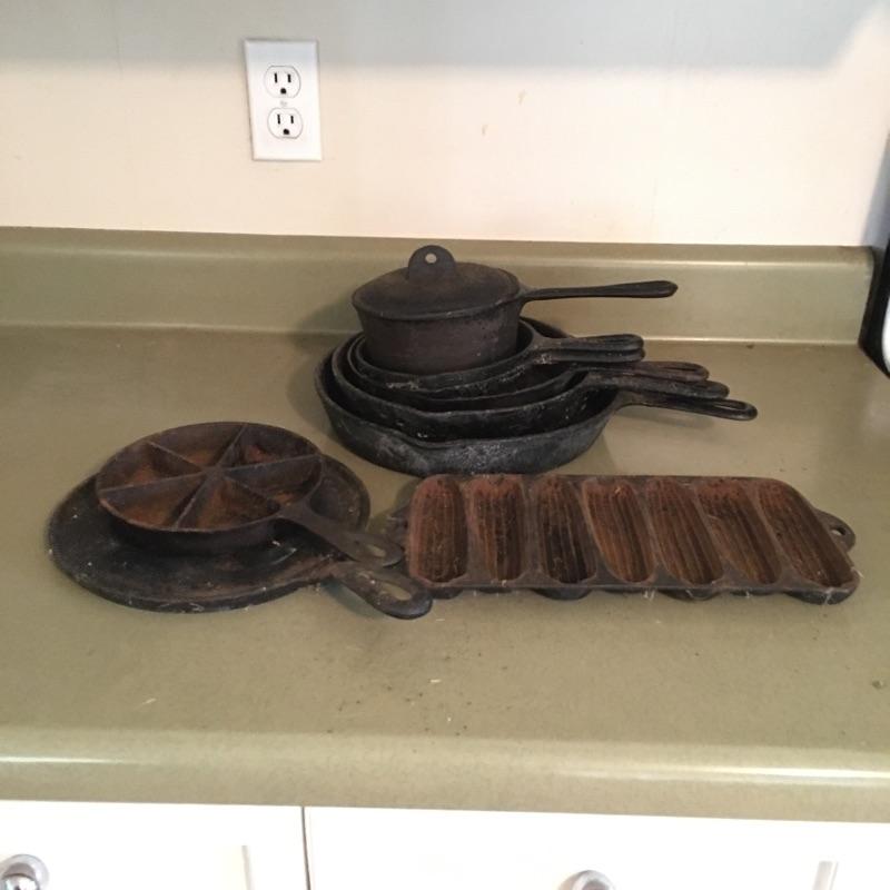 Give your kitchen that down home feeling with this collection of items that include one Griswold cast iron skillet, five cast iron skillets, corn bread pan, pan with lid and two more cast iron pieces. Also includes marmalade pattern collection with salt and pepper shakers, napkin and paper towel holder, butter dish, sugar bowl spice rack, glass pitcher serving plate, trivet and three nesting bowls. A wooden box , trio of glasses, pair of black swans and more. Griswold skillet measures 11.5”D x 2.5” tall.