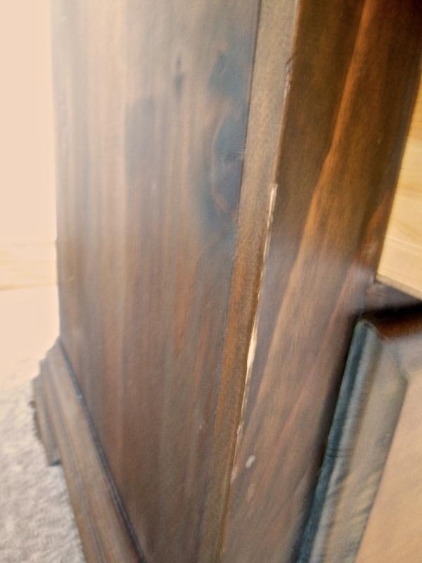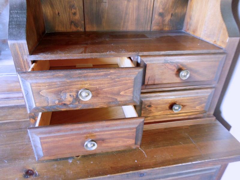 Serpentine design, batwing brass hardware. 2 shelves and 11 drawers. Mirror is 30" x 36". Dresser measures 70" H x 18" D x 66" W. Very little damage other than small dings retouched as pictured. Manufactured in USA.