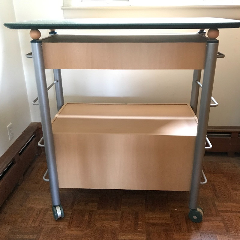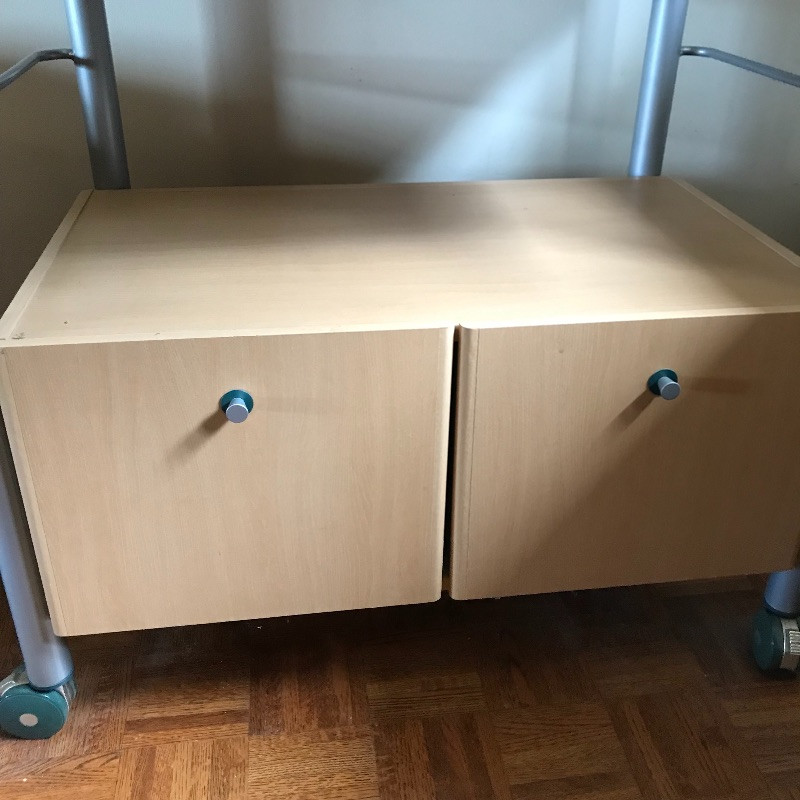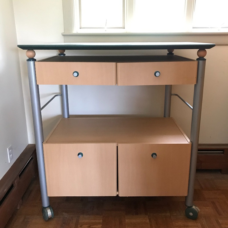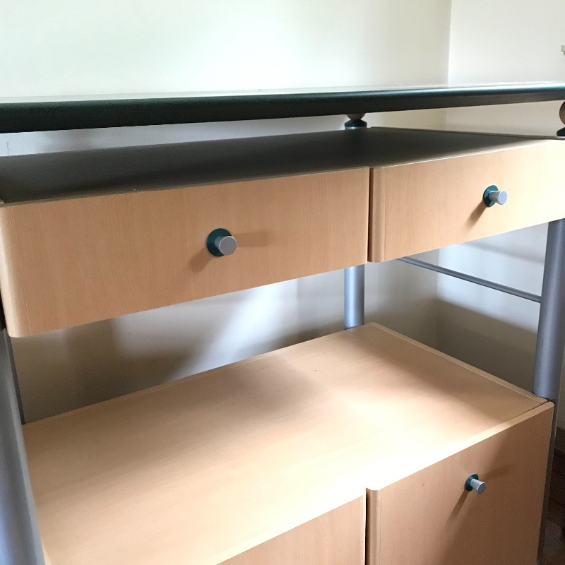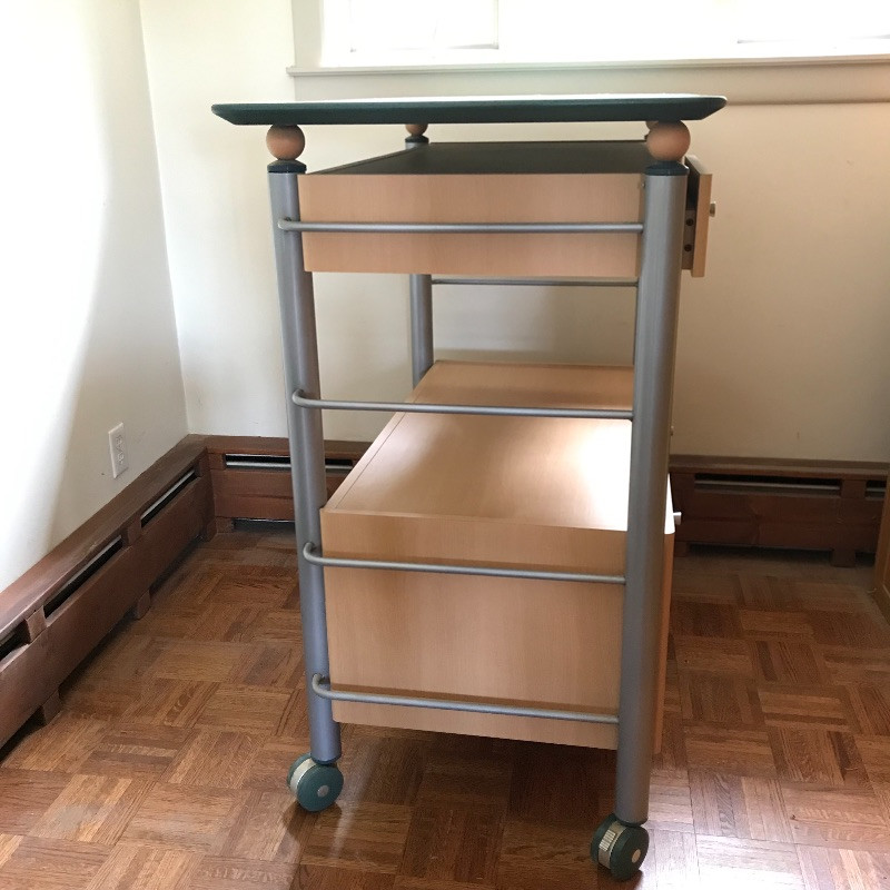 This stylish modern piece comes with a green laminate style top wth subtle green accents. The drawers and cabinet appear to have a light wood laminate. Outher than a small scratch on the top surface, the piece is in great shape. Some scuffing noticed on the right drawer appears to be easily fixed by being cleaned. This piece moves very easily on its modern caster style wheels and looks good from any angle. Piece measures approximately 44” x 26” x 44”. Also take a look at the matching desk in lot 6!